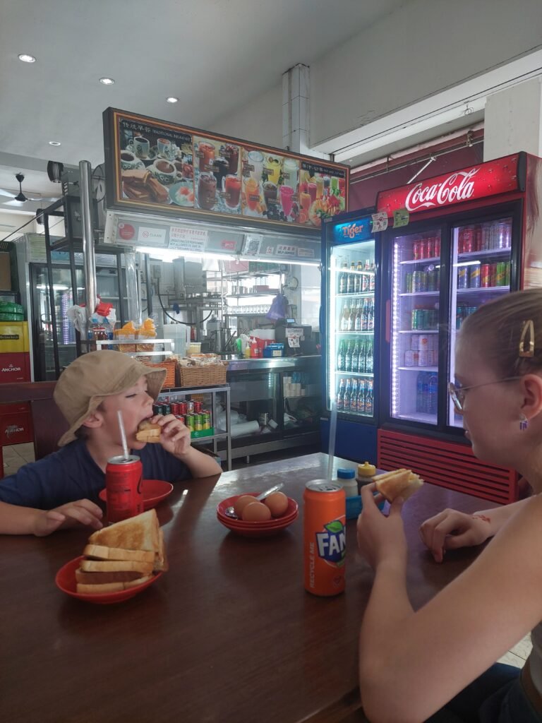 Next we took a metro to China Town. The smell of durian was very strong and even the masks we still had to wear in the metro wouldn’t filter the smell. We walked around the area and ended up buying kid’s sticks for eating. Those sticks were attached to each other from the other end to make it easier to eat with them. Ronja and Risto tried them when we had lunch at a Chinese restaurant and they did quite ok. The lady in the shop told us that the kids here start practising eating with sticks when they turn two. There are special sticks for the young ones too. Those sticks have rings to place the fingers, so the kids learn the right grip right away.