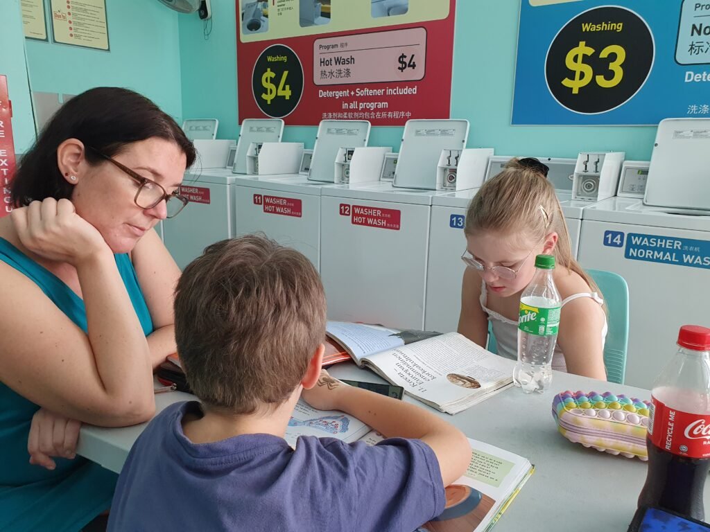 Iltapäivällä palasimme pyykkäyshommiin hotellin viereiseen pikapesulaan. Samalla hoitui myös kouluhommat, sillä koneessa ja kuivurissa pyöriviä pyykkejä piti jäädä paikan päälle varmuuden vuoksi vahtimaan.