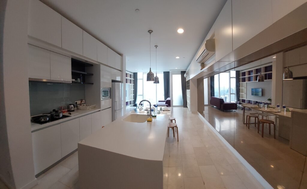 Bussi tipautti meidät pysäkille suhteellisen lähelle meidän majapaikkaamme. Siitä nappasimme taksin lennosta, ja 30MYR:n (n. 7€) kiinteään hintaan taksi vei meidät perille. Huoneistomme oli suhteellisen pramea edellisiin, myös Dubain hotelliin verrattuna. Todellisuudessa viiden yön majoitus täällä olisi maksanut 1500€, mutta onnistuimme nappaamaan Booking.comista viime hetken tarjouksen, ja saimme huoneiston 520€:lla. Toisin sanoen yksi yö täällä maksoi vähemmän, kuin kaksi kapselia Singaporessa. Se kertoo myös jotakin näiden kahden maan välisistä tuloeroista. Kyllä täältä 50. kerroksen ikkunoista kelpaa katsella alapuolella levittäytyvää Kuala Lumpuria.