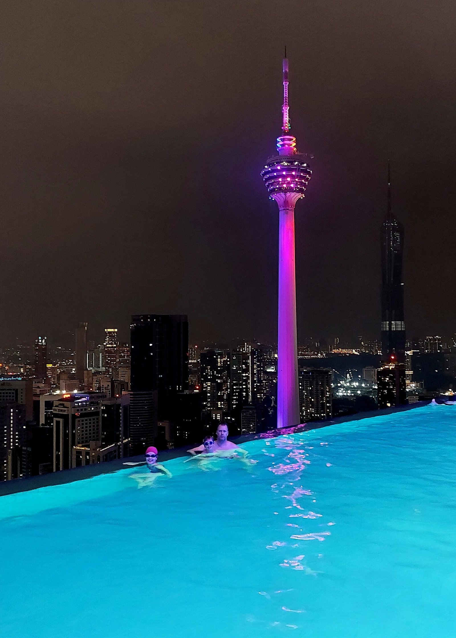 Illalla ruokailimme rakennuskompleksin ylimmässä kerroksessa sijaitsevassa ravintola-baarissa Petronasin kaksoistorneja ikkunasta ihaillen. Sen jälkeen oli vielä aikaa ilta-uinnille kattoterassin uima-altaassa. Sieltäkin maisemat olivat huikeat! Marko lähti vielä toiveikkaana hakemaan meille täydennystä jääkaappiin läheisen ostoskeskuksen ruokakaupasta, mutta se mokoma olikin mennyt kiinni jo kymmeneltä. No, uusi yritys seuraavana päivänä.