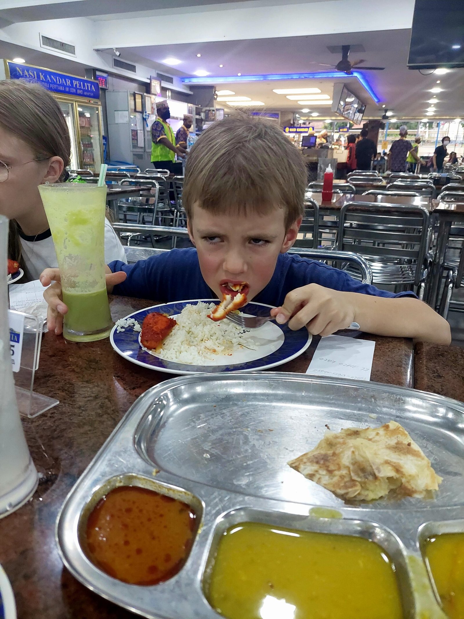 Illalla poikkesimme syömään paikallisten suosimassa ruokapaikassa hotellimme lähellä. Taas oli turistilla sormi suussa, kun koko ruokalista oli pelkästään paikallisella kielellä. Onneksi apuun riensi varmasti se ainoa tarjoilija, joka puhui englantia enemmän kuin kaksi sanaa, ja kaivoi meille jostain englanninkielisen ruokalistan. Sekään ei varsinaisesti helpottanut asiaa, sillä monet ruokien nimet olivat meille aivan tuiki tuntemattomia. Päädyimme tilaamaan kolme kana-annosta, erilaisia hedelmämehuja, naan-leipää ja tarjoilijan suosittamaan pisang rotia, banaanileipää. Siitä tulikin meidän perheen suosikki, ja tilasimme sitä vielä toisenkin annoksen.