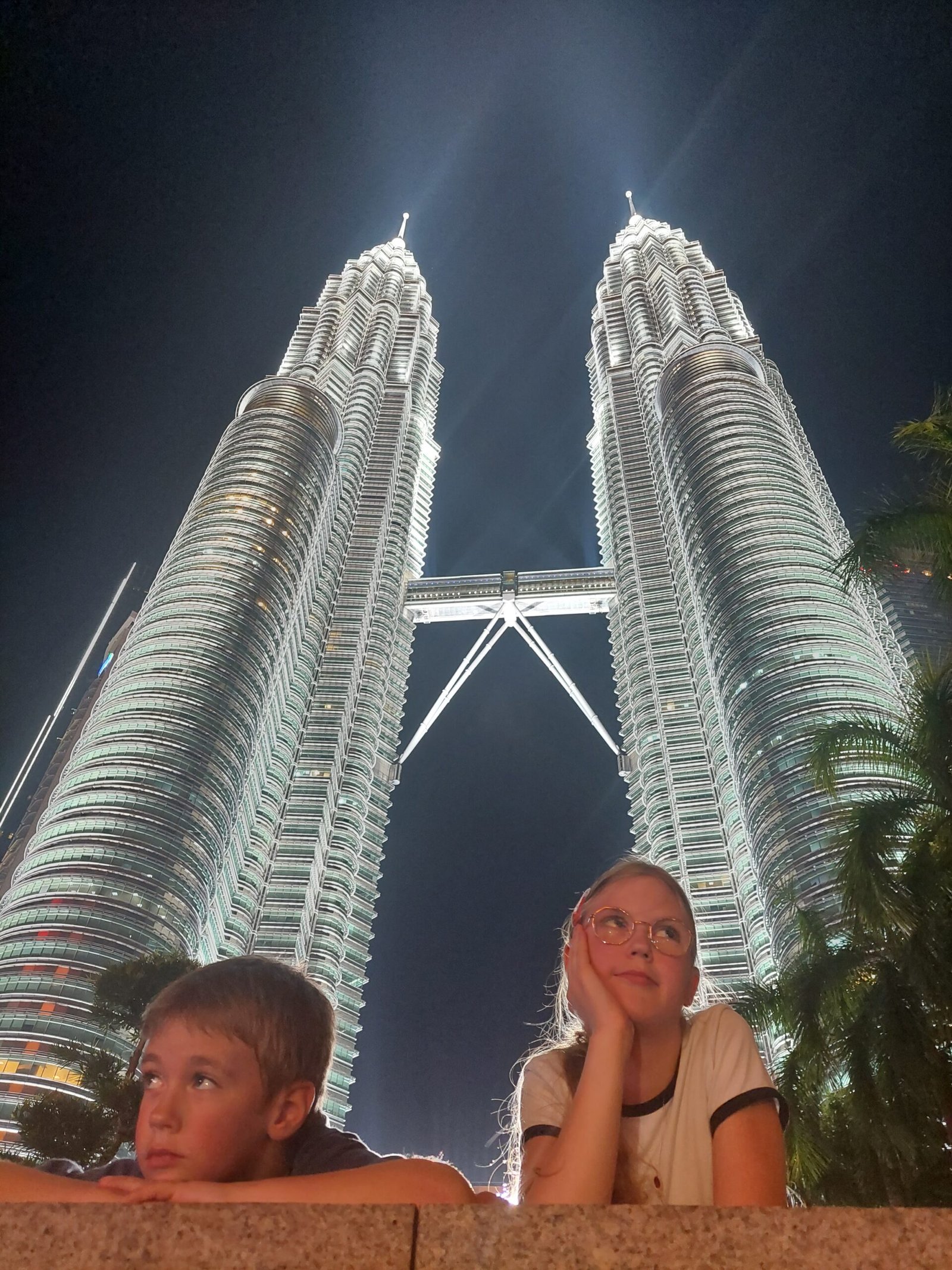 The next morning at nine Marko had a new try, but the doors remained closed until ten o’clock, so we ended up having a very late breakfast that day. After that we did some school stuff, went for a swim and later in the evening we went for a dinner at a restaurant nearby, which was apparently very popular among the locals. The food there was cheap and tasty. It was very spicy though, especially for the children. Risto ate bravely one piece of chicken and washed it down with a glass of freshly squeezed apple juice and couple of glasses of water. Ronja managed to tackle two and a half pieces until it became too much for her too. After that the kids concentrated on rice and naan bread. Especially the roti pisang (banana bread) was our favourite. After dinner we popped by to see the Petronas Towers in night light and walked back home.