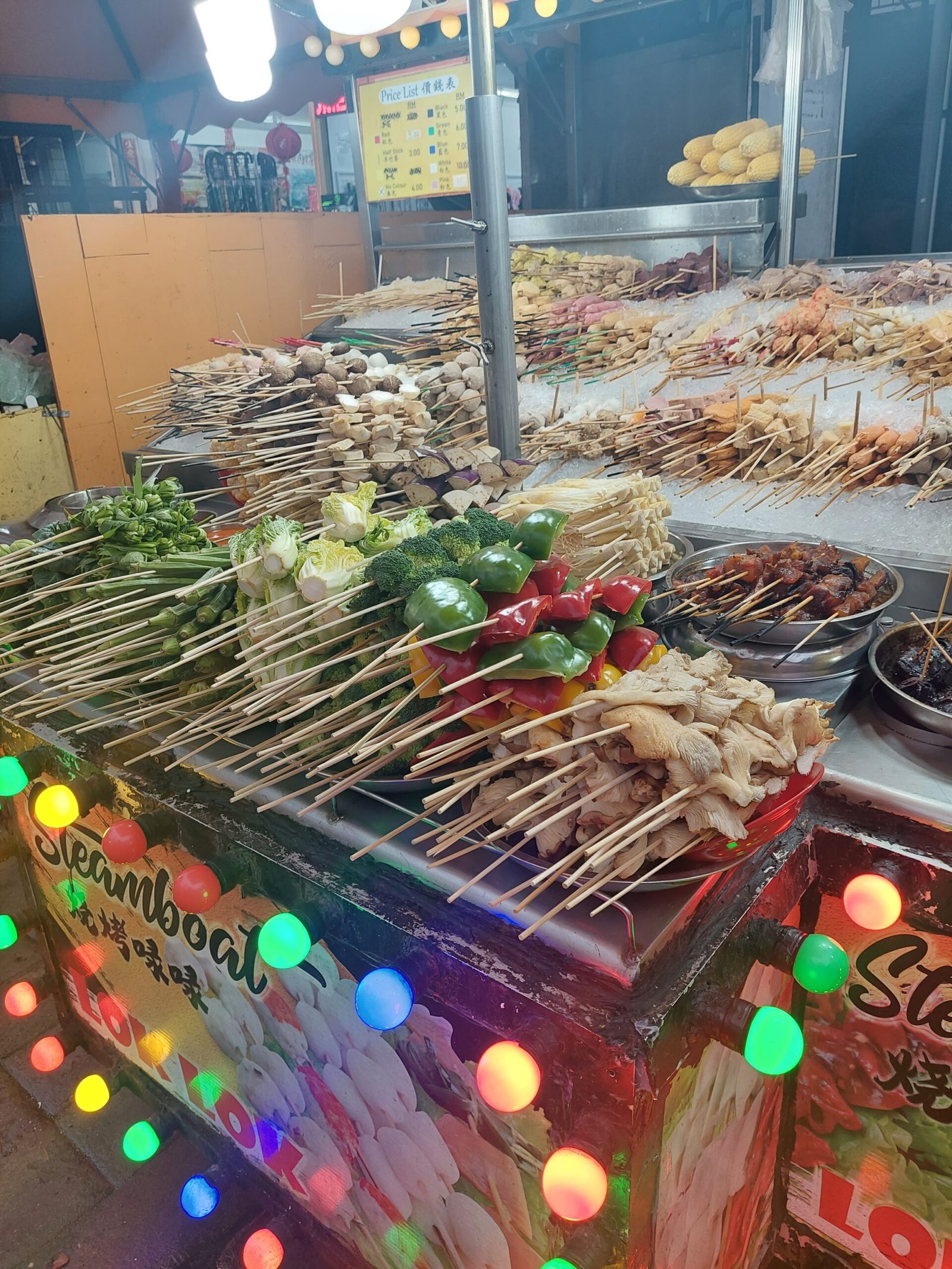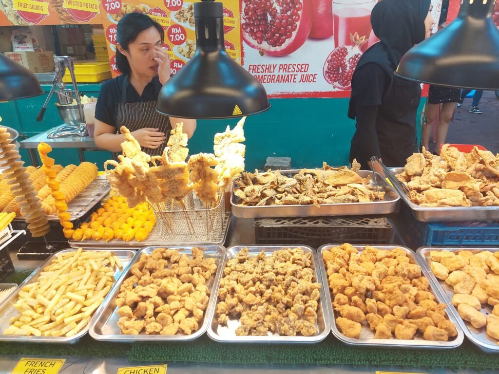 The food stalls were offering all kinds of local delicacies from frogs to lobster. Since a frog skewer was a no go for the kids, we sat ourselves in a restaurant that offered also more conventional dishes. We ordered lemon chicken for the kids (this time we made sure it wasn’t spicy at all), satay chicken skewers, barbecue prawns, frog in ginger sauce, rice, French fries and of course freshly squeezed juice for everyone. All that cost only 149MYR (33€).