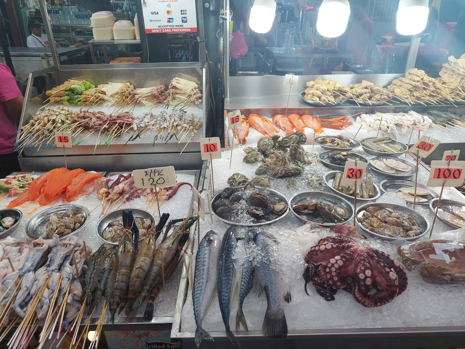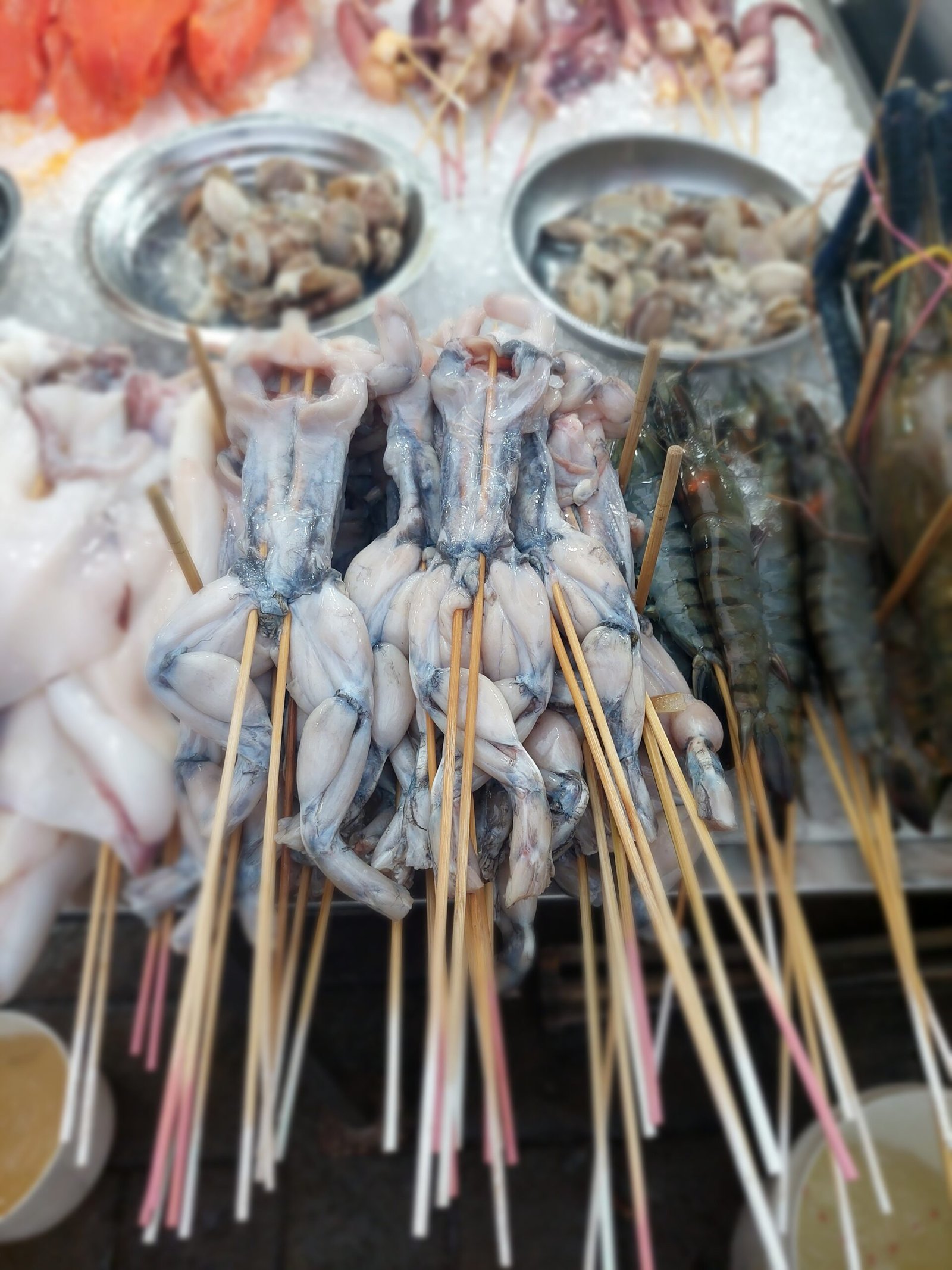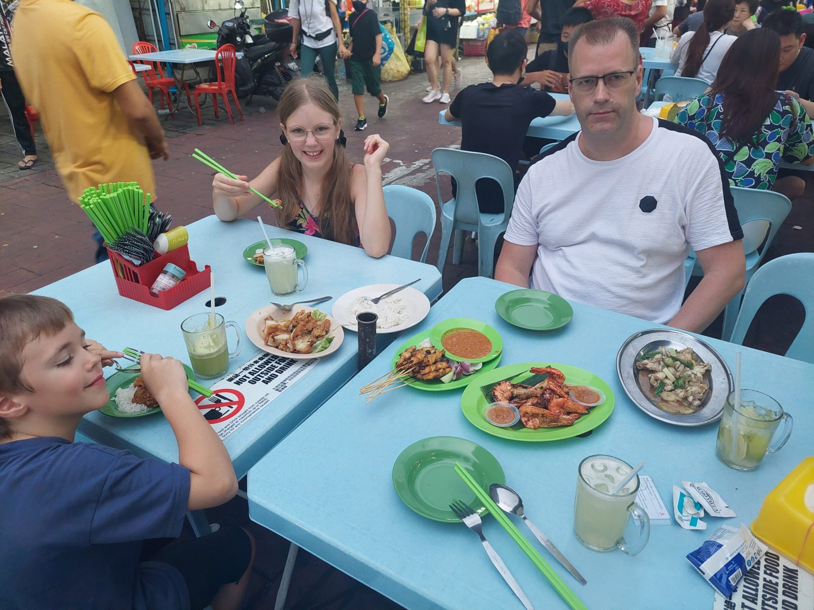 Ravintolakadulla sitä olikin sitten mistä valita! Kävelimme ensin kadunpätkän päästä päähän, ja ihmettelimme tarjolla olevia ruokia. Vartaisiin tökätyt sammakot eivät saaneet kannatusta lapsilta, joten jatkoimme matkaa, kunnes päädyimme ravintolaan, jonka tarjonta kelpasi myös lapsille. Tällä kertaa tarkistimme, että lapsille tilattu ruoka ei ollut lainkaan mausteista, ettei Risto-reppanan tarvinnut taas lähteä kesken ruokailun lähteä etsimään vessaa. 149MYR:n (n. 33€) hintaan saimme sitruunakanaa, grillattuja jättikatkarapuja, kanavartaita satay-kastikkeessa, sammakkoa inkiväärikastikkeessa, riisiä, ranskalaisia sekä lisäksi kaikille tuorepuristettua mehua. Ruoka oli hyvää, ja lapsetkin saatiin hienoisella painostuksella maistamaan sammakkoa. ”Ei jatkoon” tuumivat lapset, ja pitäytyivät sitruunakanassa ja kanavartaissa.