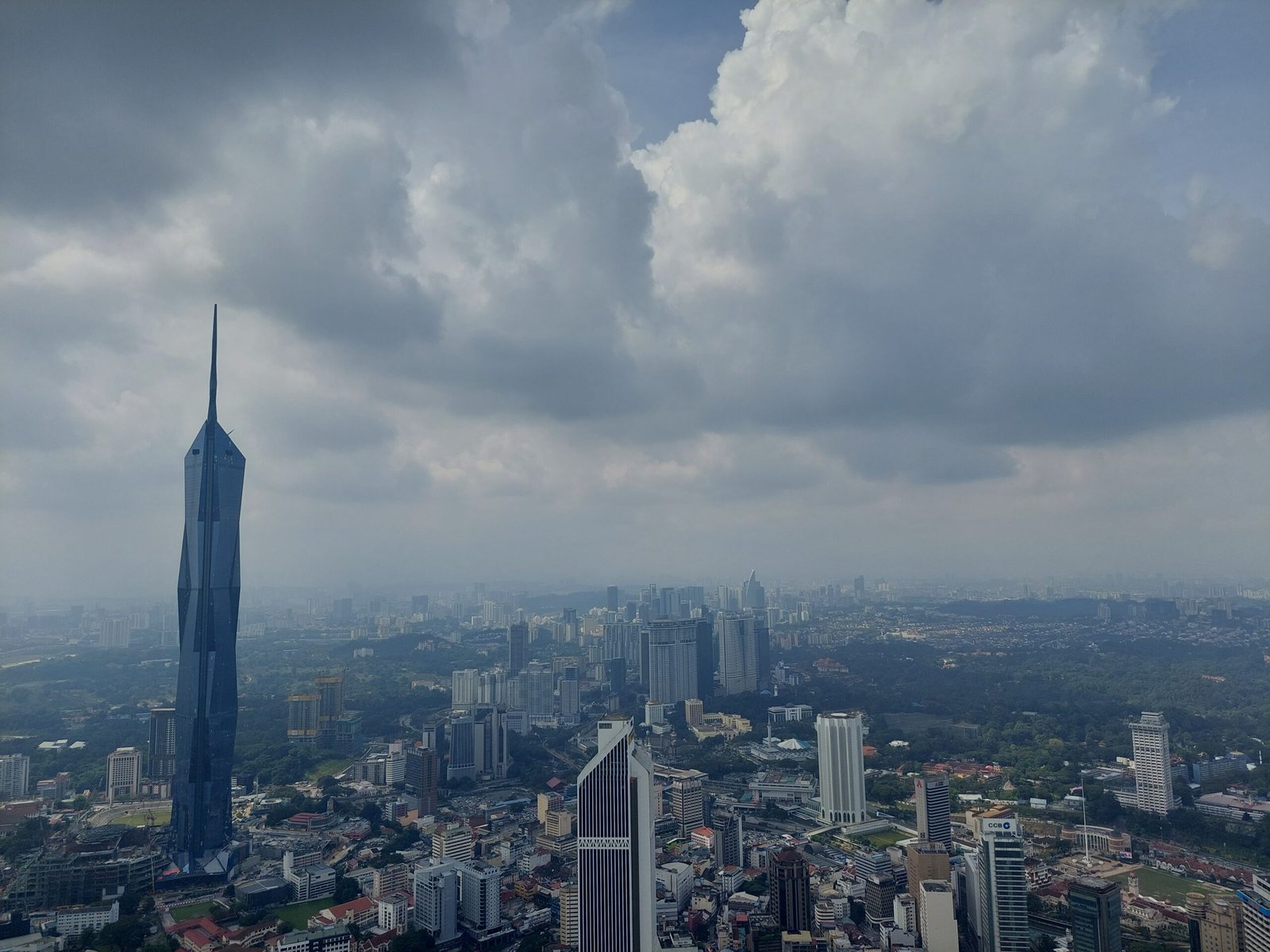 Sunnuntaina oli vuorossa kapuaminen hissillä KL-tornin korkeuksiin. Onneksi näköalatasanteelle vei hissi, sillä 2058 porrasta olisi ollut melkoinen kiipeämisrupeama! Satuimme paikalle sellaiseen aikaan, että meidän lisäksemme siellä ei paljon muita turisteja ollutkaan. Tornista näkyi kauas, vaikka sää oli jälleen utuinen ja pilvinen. (Lämpötilaa tämä ei kyllä alentanut sitten tippaakaan!) Bongasimme oman asuntokompleksimme uima-altaineen, sekä maailman toiseksi korkeimman rakennuksen, 118 kerrosta korkean Merdeka-nimisen pilvenpiirtäjän. Maailman korkeimman rakennuksen Burj Khalifan olimme nähneet jo Dubaissa. Kolmanneksi korkeinta rakennusta pitäisi lähteä bongaamaan Kiinaan, ja sinne emme ole tällä reissulla menossa.