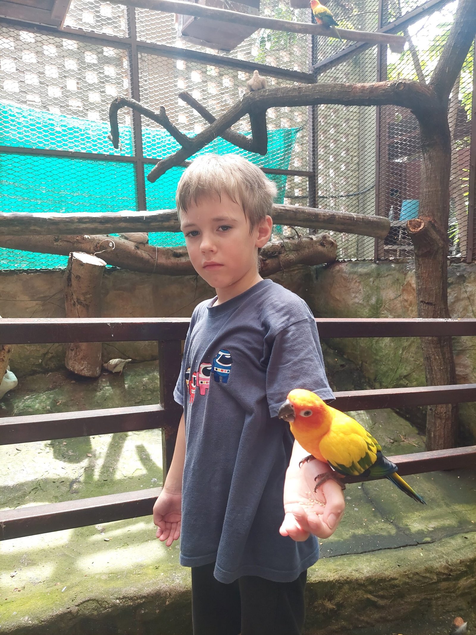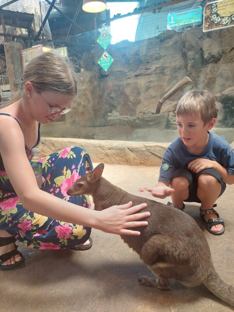 Tornin alapuolella sijaitsi minieläintarha, jossa pääsi lähikontaktiin useammankin eläimen kanssa. Koska erilaiset eläimet on yksi meidän perheen yhteinen kiinnostuksenkohde, sinne piti luonnollisesti hikisestä olotilasta huolimatta suunnata seuraavaksi. Pääsimmekin ruokkimaan ja rapsuttelemaan kaikenlaisia eläimiä pienistä wallabeista vähän suurempiin kilpikonniin asti. Ronjakin on viimein päässyt yli papukaijakammostaan, ja antoi kiljumatta niiden istua hänen olkapäällään.