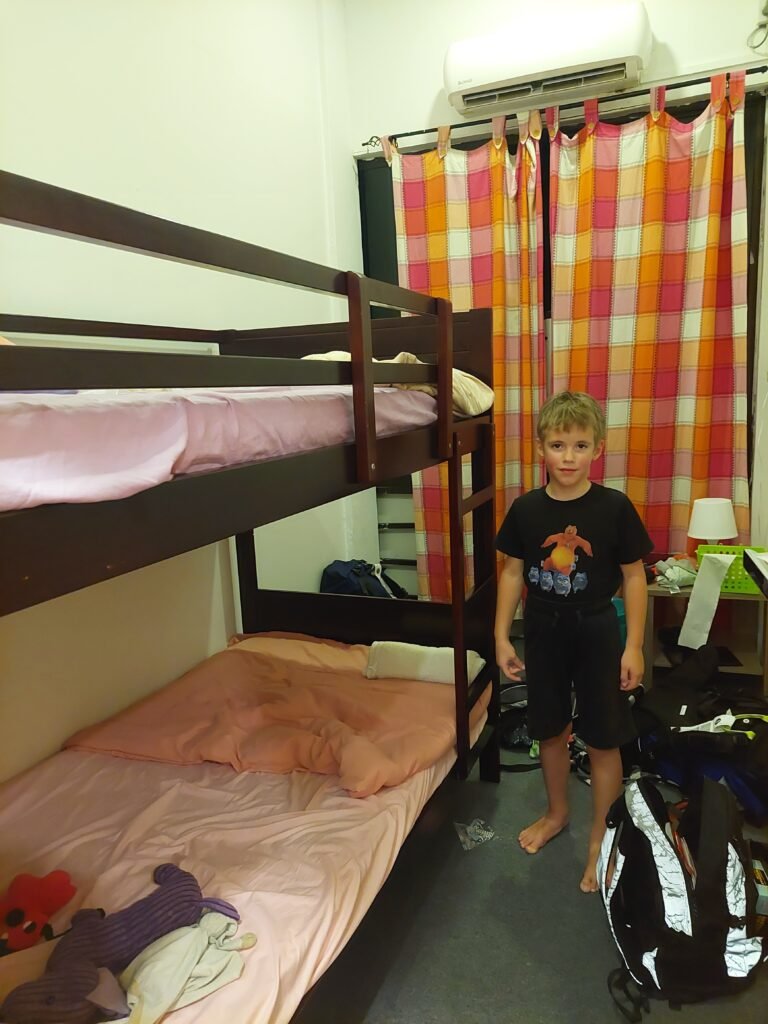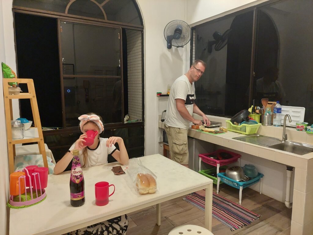 Majoituimme pieneen hostelliin muutaman kilometrin päähän keskustasta maan pääkaupunkiin Bandar Seri Begawaniin. Meille järjestyi kaksi huonetta, jossa toisessa oli kerrossängyt lapsille, ja meille aikuisille taas parivuode omassa huoneessamme. Muuta sinne ei sitten enää mahtunutkaan. Tosin emme odottaneet paljon muuta saavammekaan, jos neljän yön hinnaksi tuli koko porukalta 150€. Käväisimme ostoksilla paikallisessa supermarketissa, mutta tällä kertaa aamupalatarpeiksi ei tarttunut juuri leipää ja banaaneja kummempaa. Luulimme ostaneemme palan juustoa, mutta leivän päälle sitä leikatessa se paljastui sulatejuustoksi. No, juustoahan sekin on.