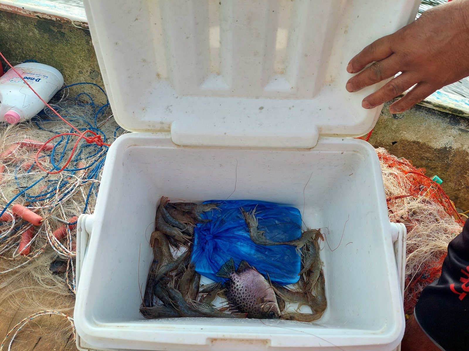 First we drove through a mangrove forest and spotted 17 crocodiles, 11 monitor lizards, different kind of birds and also some proboscis monkeys. Some of the crocodiles and lizards were very big. It’s a scary thought as they roam free basically on your backyard. On the river we also met a fisherman who was fishing with his net. The catch of the day was several king prawns and a spotted scat, a fish, which has venomous spines.