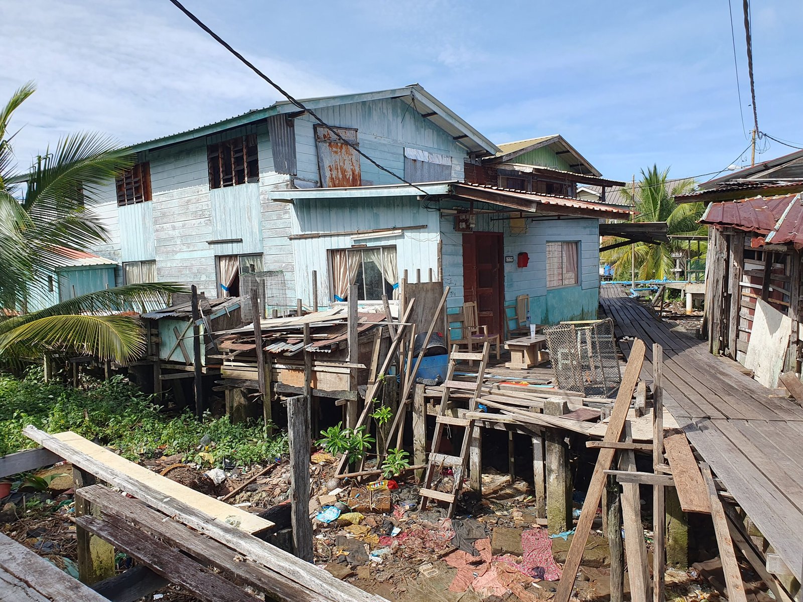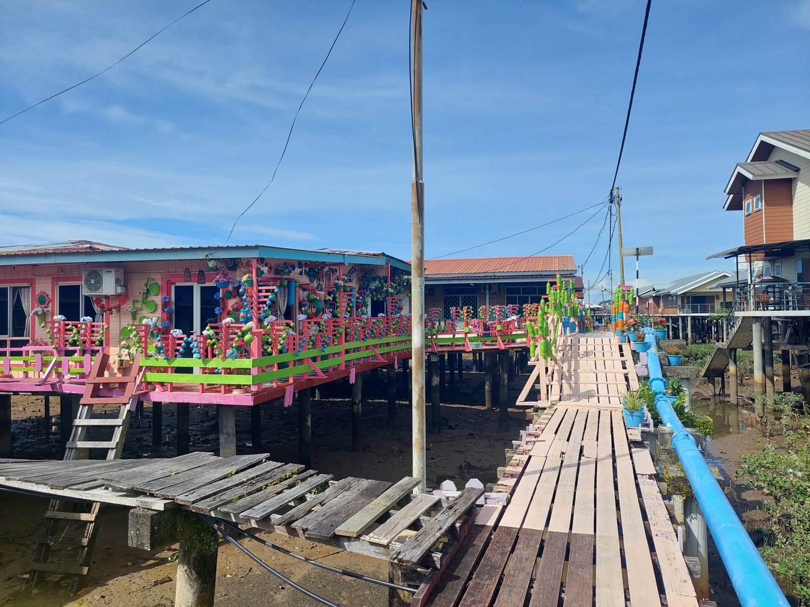 Sen jälkeen hurautimme veneellä vielä Kampong Ayer –kylään, joka on rakennettu paalujen varaan Brunei-joen varteen. Tällä noin kymmenen neliökilometrin suuruisella alueella asuu noin 10 000 ihmistä. Väkiluku on vähenemään päin, sillä monet haluavat muuttaa paalukylästä kuivalle maalle. Kylän vanhemmat osat ovat jokseenkin ränsistyneitä, osa rakennuksista ja kävelysilloista on romahtanutkin. Alueella kuljetaan moneen kertaan paikattuja lankkusiltoja pitkin talosta toiseen väistellen samalla kissankakkaa, ja silloissa ammottavia aukkoja ja lahonneita lautoja. Uudemmalla puolella kulkuväylät on valettu betonista, ja talotkin näyttävät parempikuntoisilta.