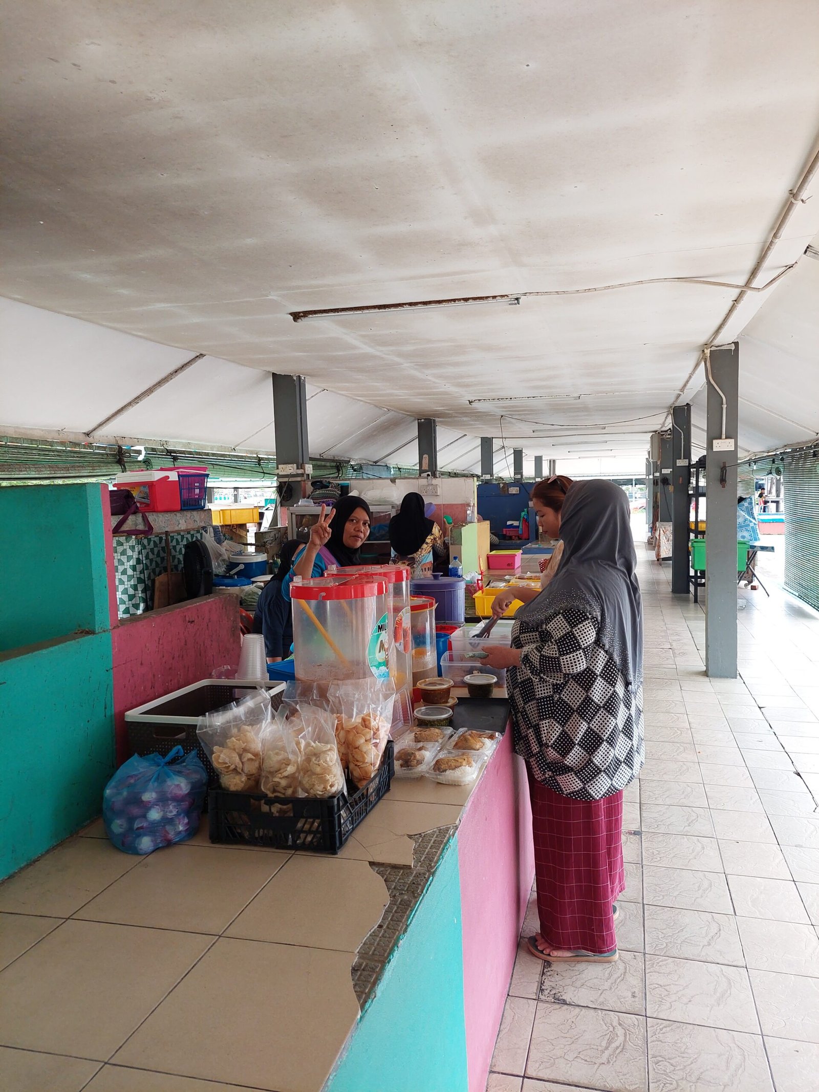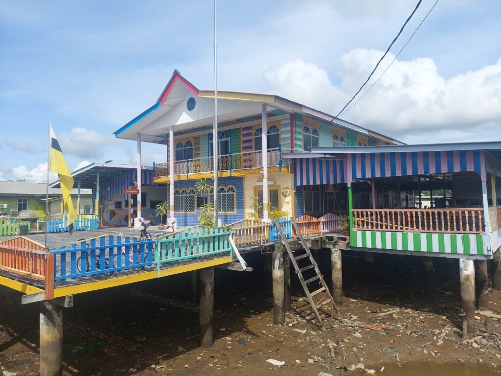 Oikeastaan Kampong Ayer koostuu useammasta pienemmästä kylästä, jotka ovat kasvaneet yhteen isommaksi alueeksi. Kylästä löytyy mm. urheilukenttiä sepak takraw –peliä varten, ulkoilmakuntosali, poliisiasema, paloasema, koulu sekä toki oma moskeija. Mitään kunnollisia kauppoja alueella ei ole, joten isompia ruokaostoksia varten väki käväisee veneellä mantereella. Paikan viemäröiti kiinnosti meitä, ja kun asiasta kysyimme, saimme kuulla, että vanhalla alueella kaikki likavesi menee suoraan jokeen. (YÖK!) Uudemmalla alueella on kuulemma myös viemäröinti. Täytyypä muistaa, että täällä kannattaa jättää ravintolassa paikallinen ”catch of the day” -kalaruoka ostamatta. Roskienkeruujärjestelmä heillä sentään on kaikilla. Paikalliset keräävät omat roskansa, ja kiikuttavat ne jätesäkeissä laitureille. Siitä ne sitten käy noukkimassa joku veneellään, joka vie roskat eteenpäin kaatopaikalle. Joella ajellessamme näimme myös miehiä, joiden tehtävänä oli kerätä vedessä kelluvaa roskaa. He suorittavat tämän roskankeruuoperaationsa kuulemma neljä kertaa päivässä.