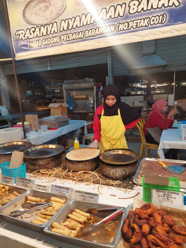 Our tour ended at the local night market where many kinds of local dishes were sold. We bought some chicken skewers, fried banana and not so traditional sausage skewers. We also shared some sort of a peanut pancake with our guide.
