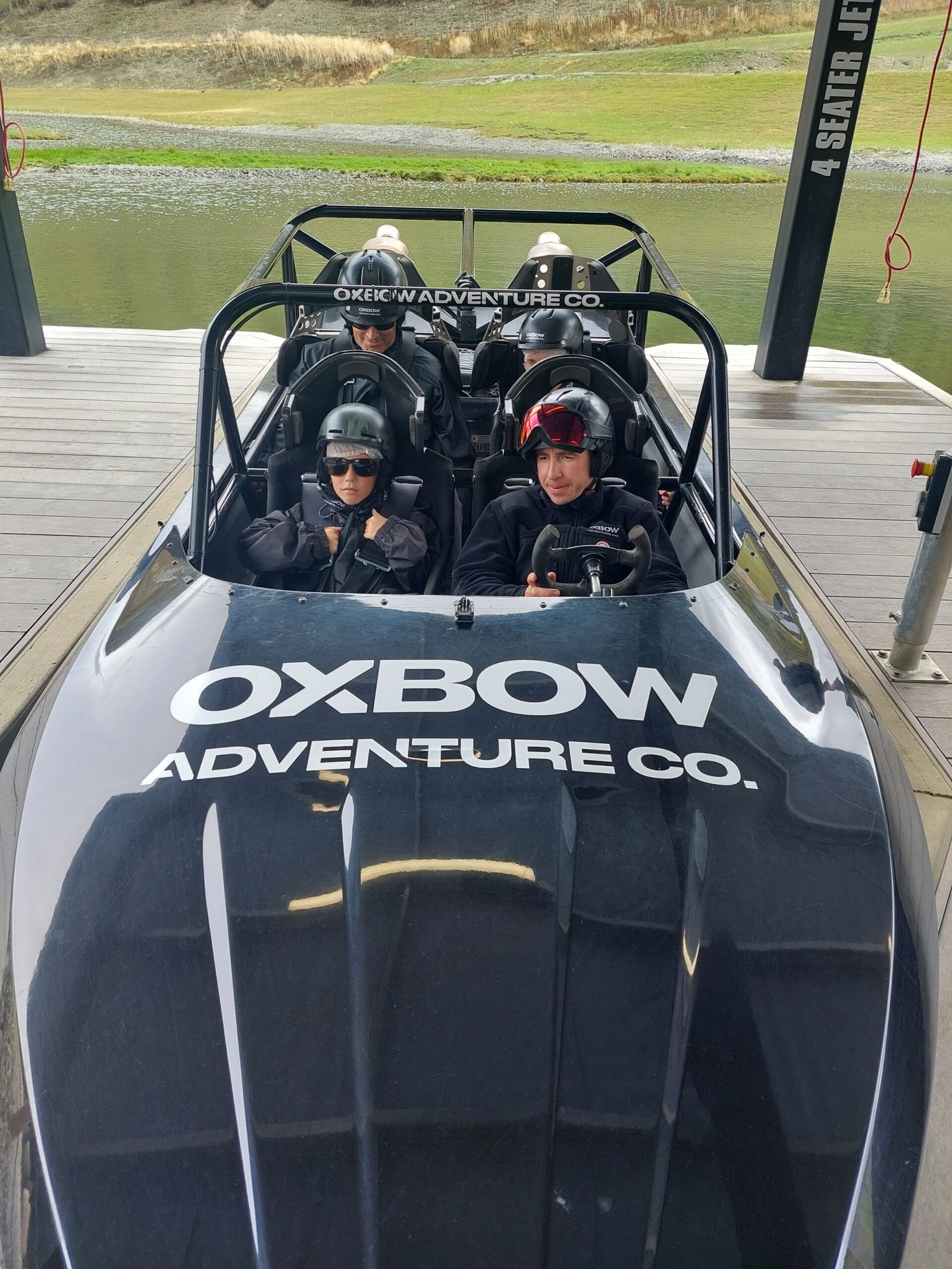Ensin lapset tekivät jonkin aikaa kouluhommia, mutta sitten hyppäsimme jälleen autoon, ja ajoimme noin puolen tunnin ajomatkan päässä sijaitsevan Oxbow adventure co. –firman toimipisteeseen. Marko oli varannut sieltä itselleen ja lapsille sekä vene- että autoajelun. Kyseessä ei ollut mikään ihan tavallinen paatti, vaan sprinttivene, joka kiihtyi 100km/h nopeuteen 2,5 sekunnissa. Kiihtyvät ne Teslatkin, mutta tällä veneellä pystyi vetämään likimain 90 asteen kurvin kiihdytyksen päätteeksi. Lopputuloksena 3 – 4G, jonka jälkeen kenellekään ei jäänyt epäselväksi miksi pienessä vehkeessä oli kuppi-istuimet, nelipistevyöt ja sivuille kaartuvat niskatuet. Tällä veneellä kolmikko huristeli keinotekoista vesireittiä pitkin kolmen kierroksen verran. Risto pieninpänä pääsi veneen kuljettajan viereen eturiviin. Marko ja Ronja istuivat takapenkkiin. Veneeseen mahtui siis kujettajan lisäksi vain kolme kyyditettävää, joten Jaana jäi rannalle ottamaan kuvallista todistusaineistoa. Nopeat veneet tai autot kun eivät erityisemmin Jaanaa kiinnosta, niin ei haitannut yhtään jäädä kyydistä rannalle. Tottapuhuen tämä taisi olla enemmän Markon ja Riston juttu, mutta eihän Ronja voinut jäädä pois, kun Risto kerran kiipesi kyytiin. Muutenhan se olisi ollut ihan noloa ja epäreilua. Vaikka Ronja ei noussutkaan veneen kyytiin aivan intoa puhkuen, oli neidilläkin kyydityksen päätteeksi hymy herkässä. Kivaa siis oli ollut.