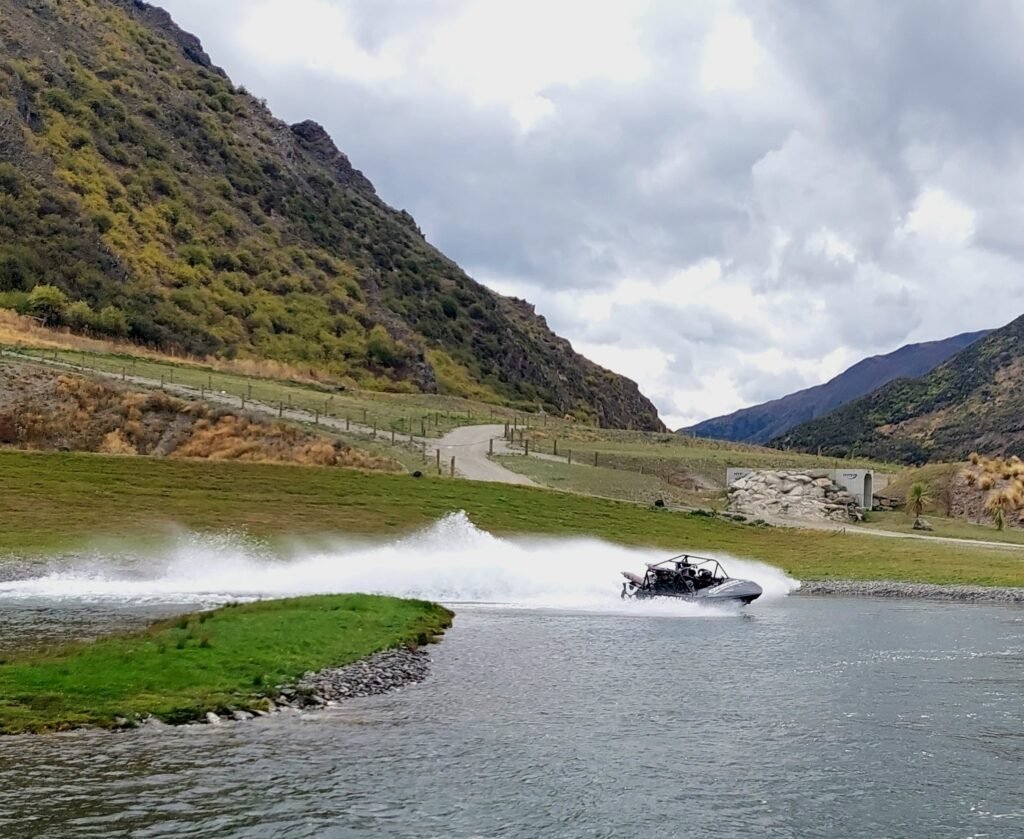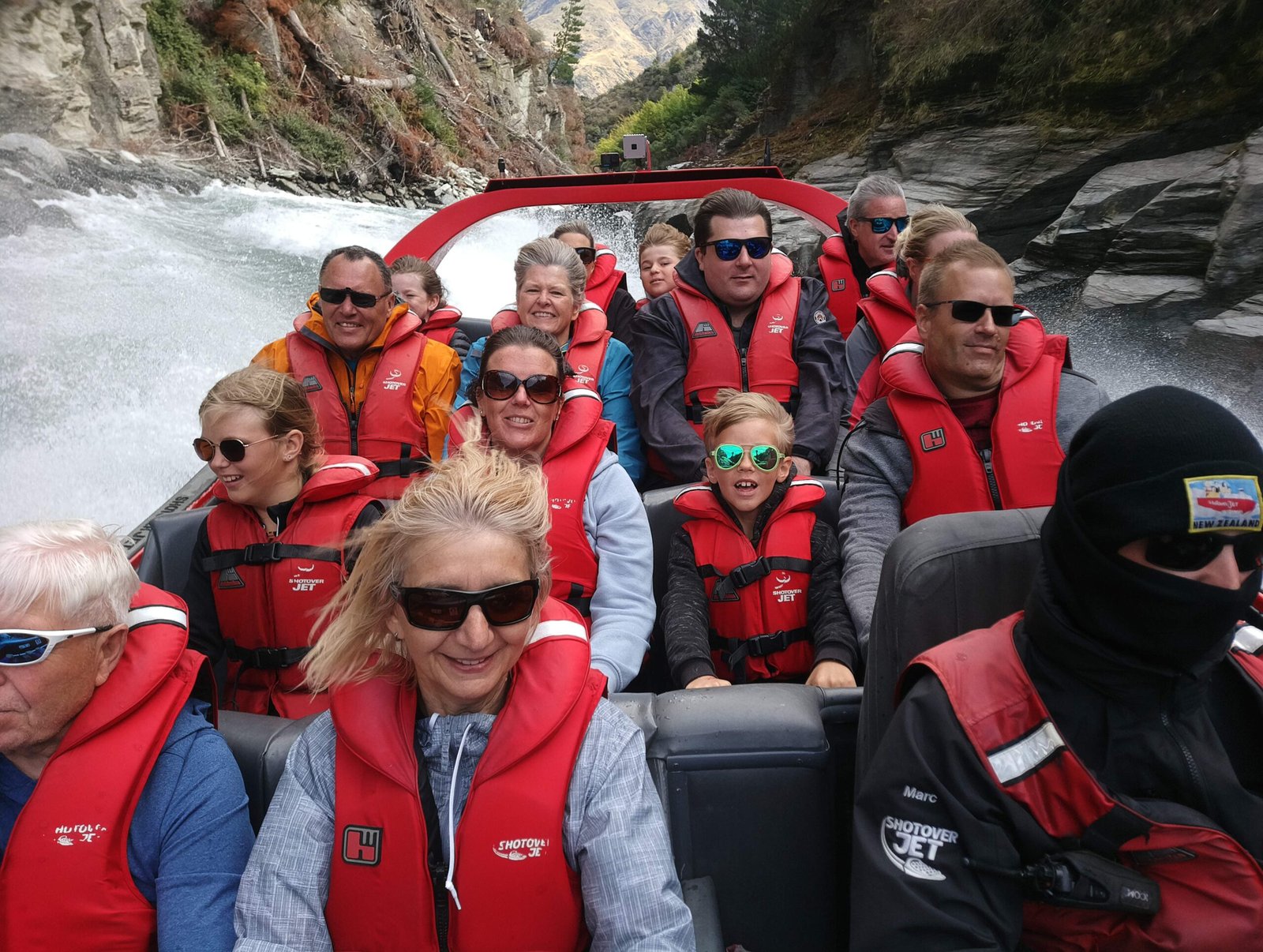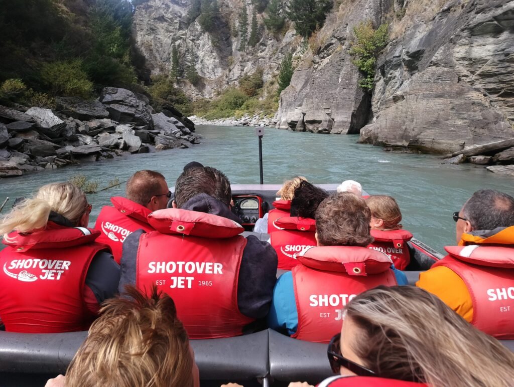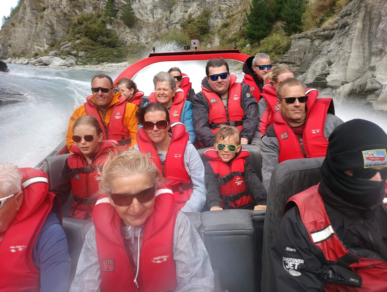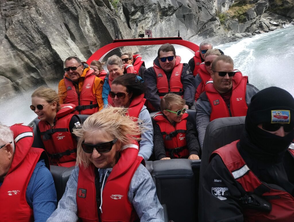 Kun olimme jälleen kaikki turvallisesti maankamaralla, lähdimme vielä ajelemaan pikaveneellä Shotover-joen kanjoniin. Tämä pikavene huristeli noin 85km/h alas jokea kapeaa kanjonia pitkin. Takaisin vastavirtaan nopeus hiipui hieman, ja kuljimme noin 75km/h. Sekin oli ihan riittävästi, sillä vettä allamme oli paikoitellen vain noin 10cm verran, ja välillä tuntui, että vene melkein hipoi kallion seinämiä. Menopelissä oli ainakin rittävästi poweria, sillä se kulki kahdella moottorilla, jossa kummassakin oli 350 hevosvoimaa. Tamän jokseenkin kostean ajelun jälkeen oli aika heittää hyvästit Queenstownille, ja jatkaa matkaa kohti ystäviemme Andin ja Grantin kotia lähellä Wanakaa.