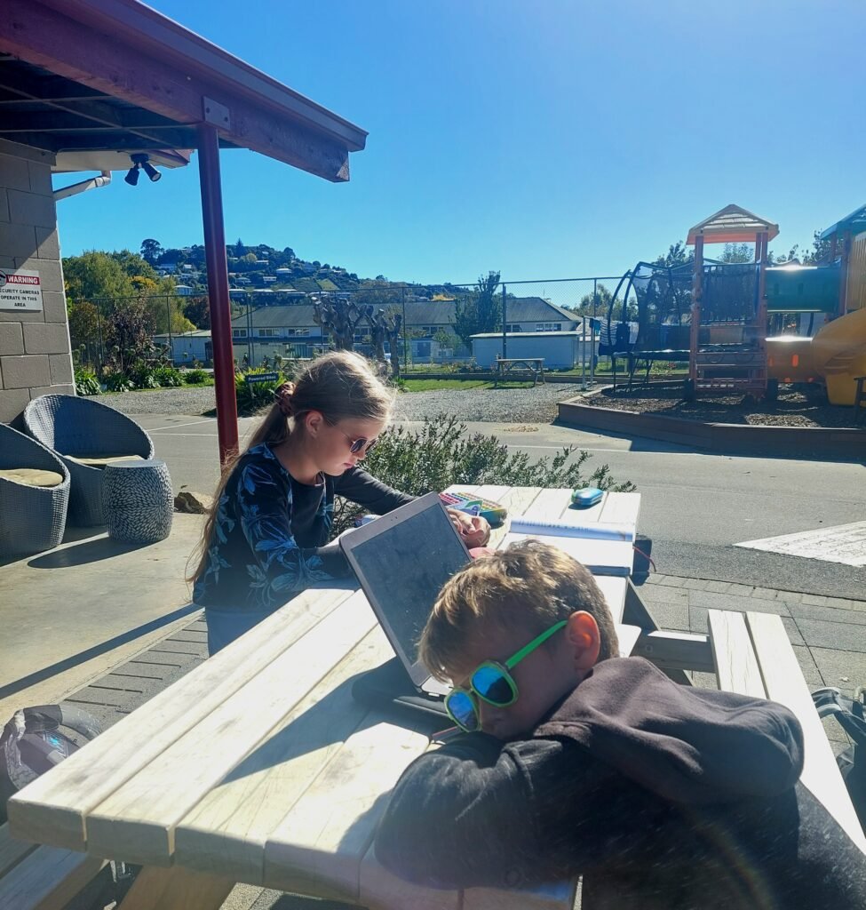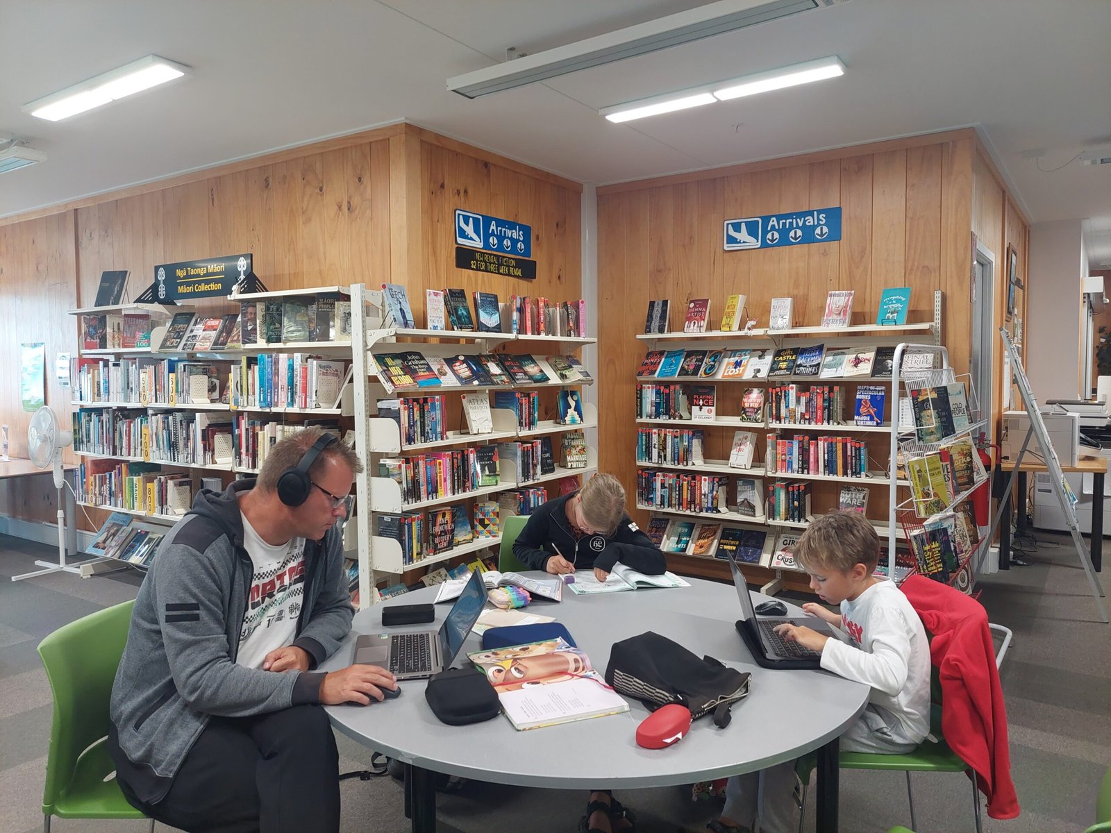 Seuraavana aamupäivänä Kaikourassa alkoi sataa. Tätä sadetta jatkuikin sitten koko päivän. Kaiken lisäksi leirintäalueen sähköt olivat poikki pitkälle iltapäivään saakka, joten siksi lähdimme Kaikouran kirjastoon koko porukka. Kirjasto olikin kaupungin kokoon nähden todella hyvin varusteltu. Aluksi tehtiin kouluhommia lasten kanssa, mutta heille jäi myös aikaa puuhastella kirjastossa muutakin. Erityisesti Ronja tykkäsi kirjastovierailusta kovasti.