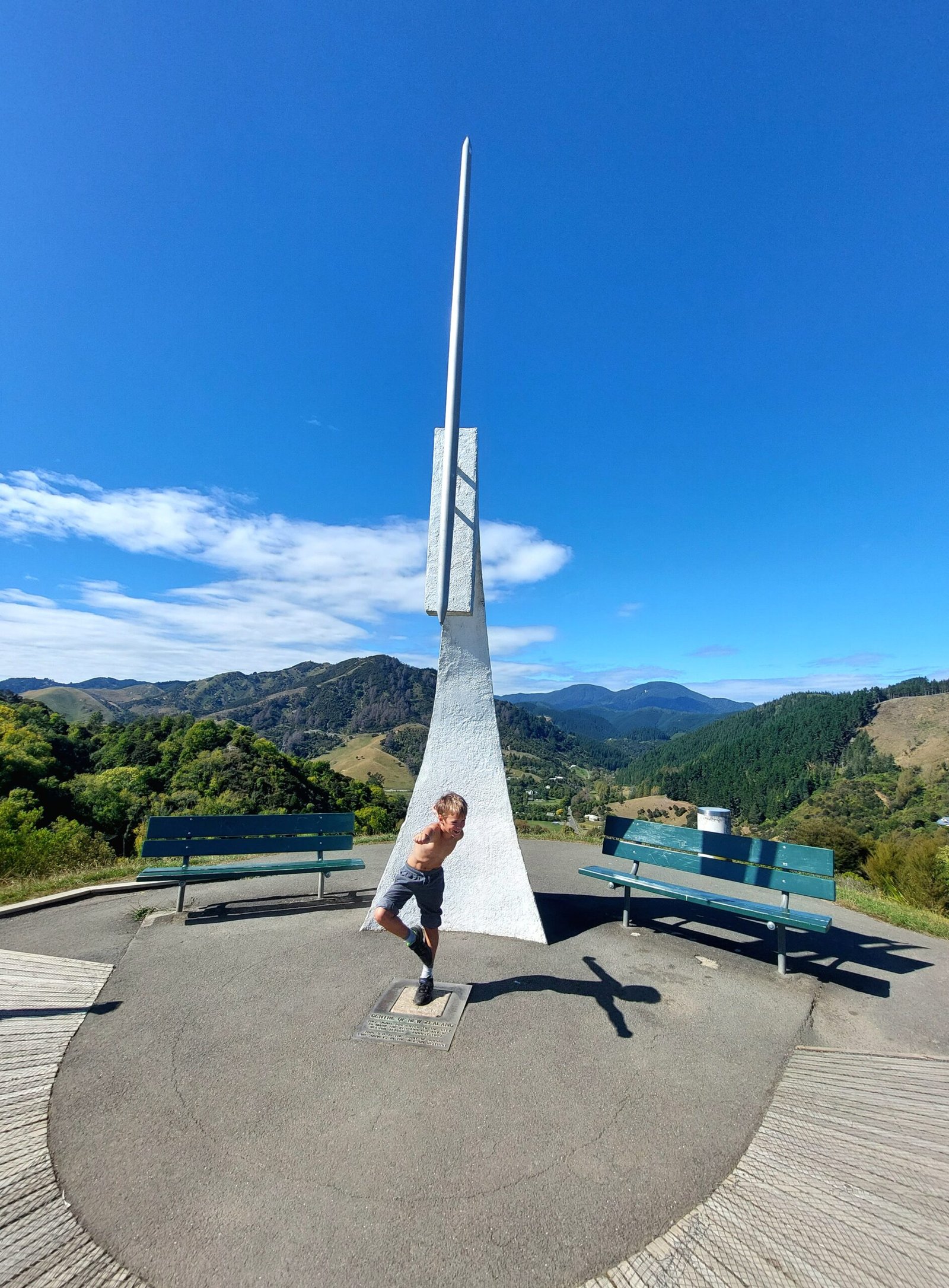 Koska sää Nelsonissa oli huomattavasti parempi kuin Kaikourassa, lähdimme torstaina heti kouluhommien jälkeen kävelemään kohti Uuden-Seelannin keskipistettä. Koska olemme Uudessa-Seelannissa, oli tietysti aivan luonnollista, että paikka sijaitsi kukkulan laella. Saimme siis melko hyvän ylämäkitreenin lasten kanssa, kun kiipesimme 147m korkealle kukkulalle ihastelemaan maisemia. Reitille tuli pituutta edestakaisin kahdeksan kilometrin verran, joten lapsetkin taas kävelivät ihan kunnon lenkin.