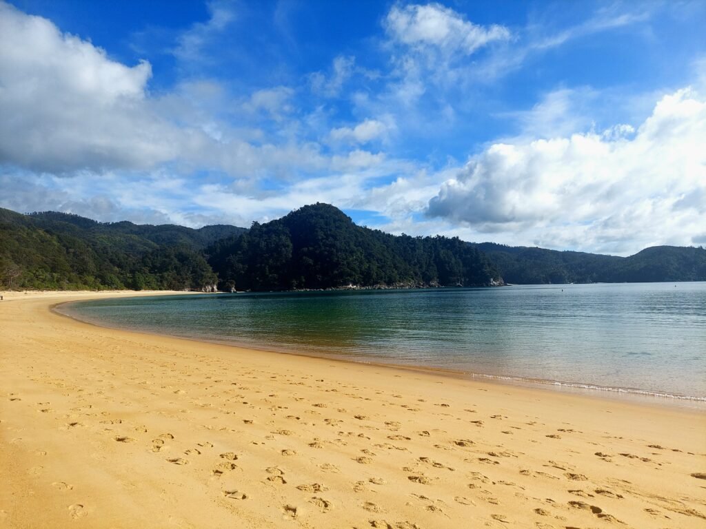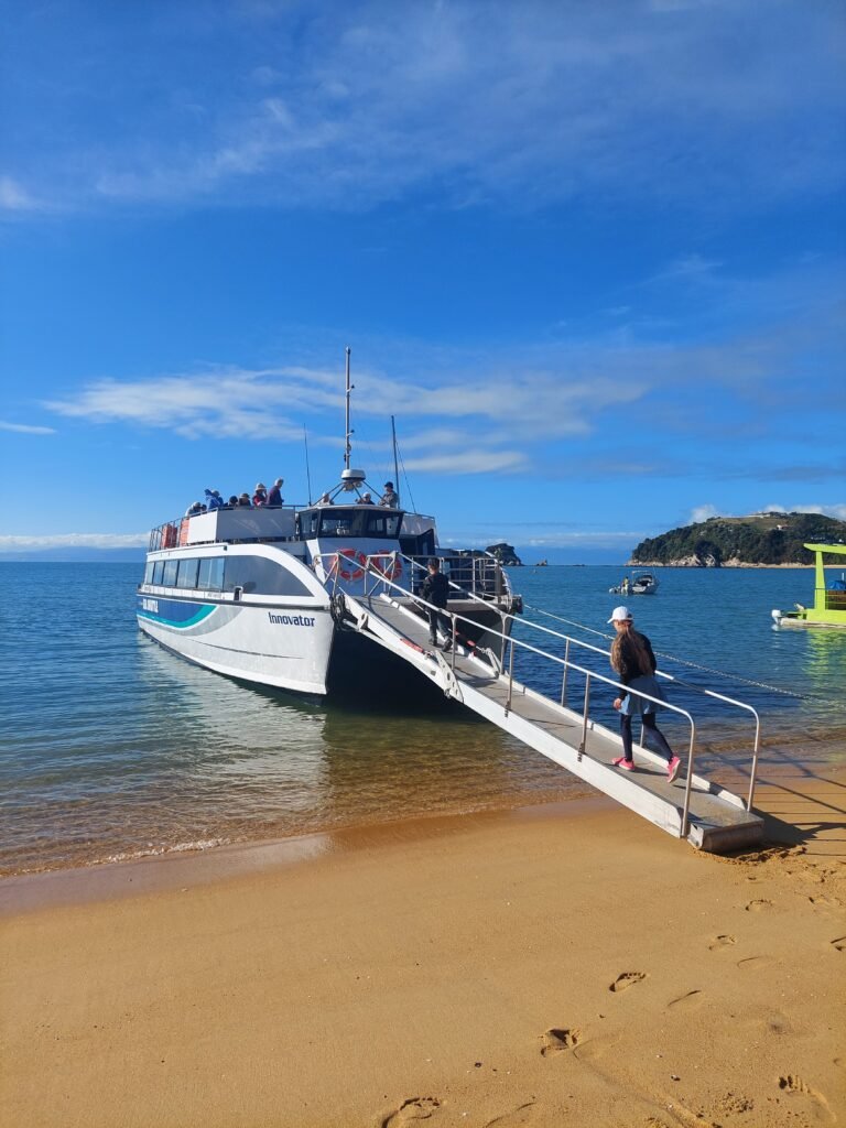 The next day we went to visit the Abel Tasman Nature Reserve. To get there, we first had to drive to a village called Kaiteriteri. From there we took a ferry. The total ferry route is long, but we got off at Anchorage Bay at the very beginning of the route. This is the first place in the nature reserve, which also has a large campground with tent and cabin sites. You could only stay overnight at marked campsites, and the rule seemed to be that you couldn’t stay there for more than two nights. This is to ensure that as many people as possible have the opportunity to stay overnight in the park.