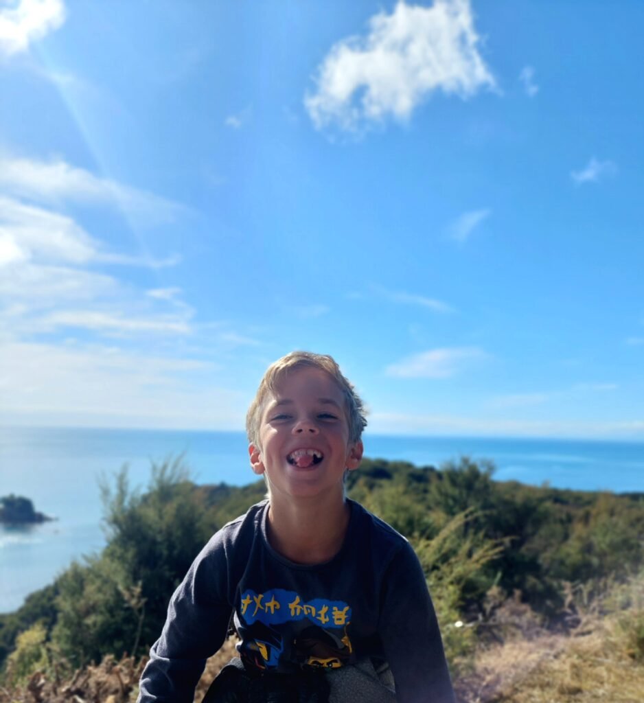 We were not staying overnight as we had come for a day trip. We set off on a hike (uphill again) towards the viewpoint at Pitt Peak, from where we continued to Te Pukatea Bay. The scenery was beautiful as always. Risto didn’t really appreciate this uphill walk, and grumbled for a long time about how we adults always make up these boring walks and how we always have to go uphill. Well, it’s true, in a way. There aren’t many flat places in New Zealand.