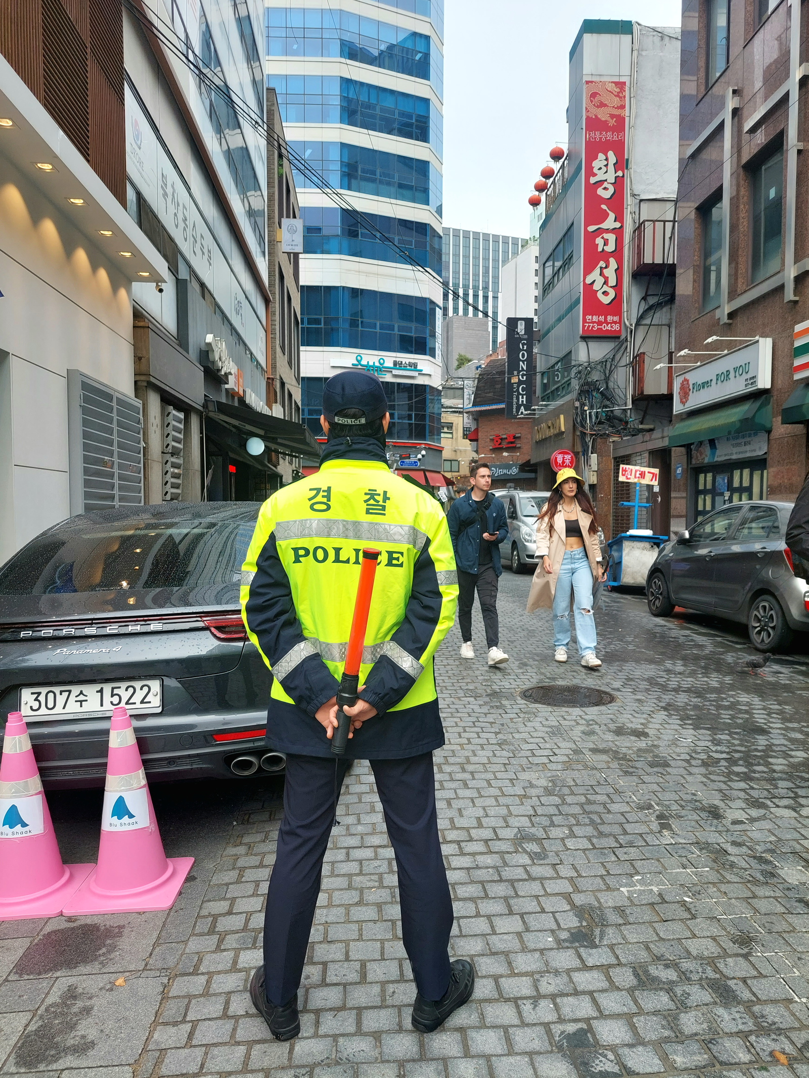 We finally got as far as the palace, and we got there at just the right time, because after only twenty minutes of waiting, a changing of the guard began at the palace gates. After seeing the changing of the guards we decided to return to the palace again the next day, as it was getting so late that it was time for dinner. We found a nice pasta restaurant nearby, where we ended up eating. After dinner, we returned to the hotel. On the way back we saw lots of police officers that had been harnessed to guard the children’s event in front of the library. Apparently they take security very seriously here. But more likely the reason for many police officers around the city is that the Prime minister of Japan is visiting the president of South Korea today.
