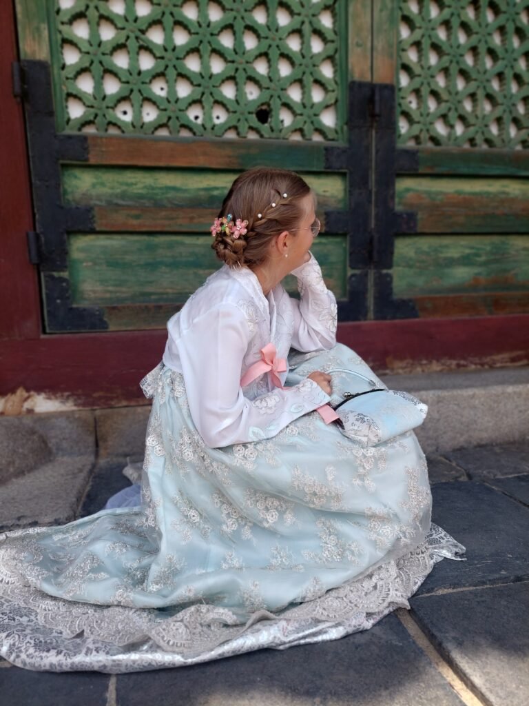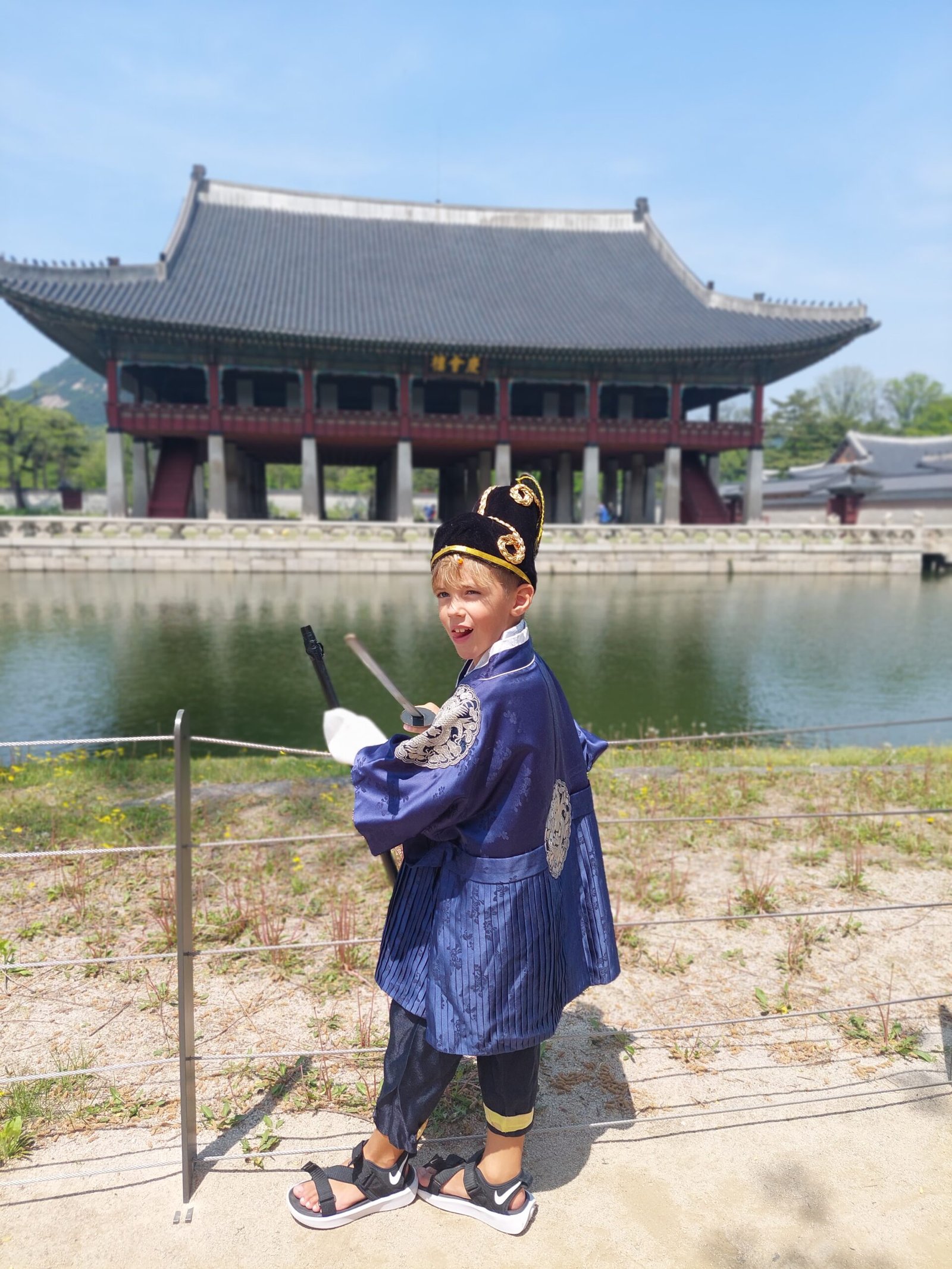 Maanantaina lähdimme uudelleen Gyeonbokin palatsille. Kävimme kuitenkin ensin palatsin lähellä olevassa pukuvuokraamossa vuokraamassa meille kaikille paikalliset kansallisasut, hanbokit. Aiemmin korealaiset pukeutuivat näihin asuihin ihan arkenakin, mutta nykyään hanbokeihin pukeudutaan lähinnä erilaisina juhlapäivinä. Pukuvuokraamoita oli palatsin kupeessa vieri vieressä todella monta. Hintahaarukkakin oli melkoinen. Ensimmäisessä vuokraamossa pelkkä Riston asu olisi maksanut 45 000won/tunti, mutta seuraavassa paikassa koko porukan kuteet, naisten laukut, miesten hatut, Riston miekka ja Ronjan kampaus maksoivat yhteensä vain 80 000won/tunti.