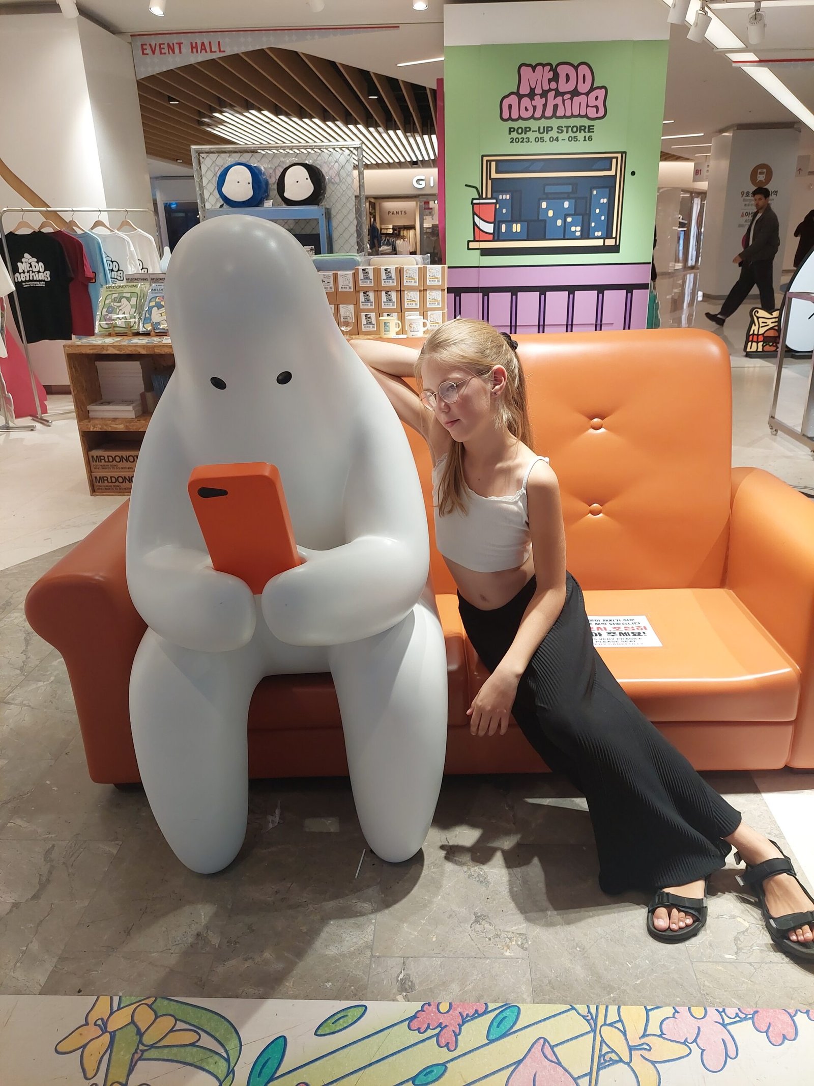 Kun lähdimme temppeliltä takaisin kohti metroasemaa, kiersimme ostoskeskuksen taakse, jossa oli etelä-korealaisen rap-artisti PSYn kunniaksi pystytetty Gagnam Style –patsas. Tällä patsaalla saattoi myös laittaa popin raikaamaan, joten Risto ja erityisesti Ronja ottivat ilon irti, ja tanssivat Gagnam Stylen tahtiin ohikulkijoiden katsellessa lasten touhua.