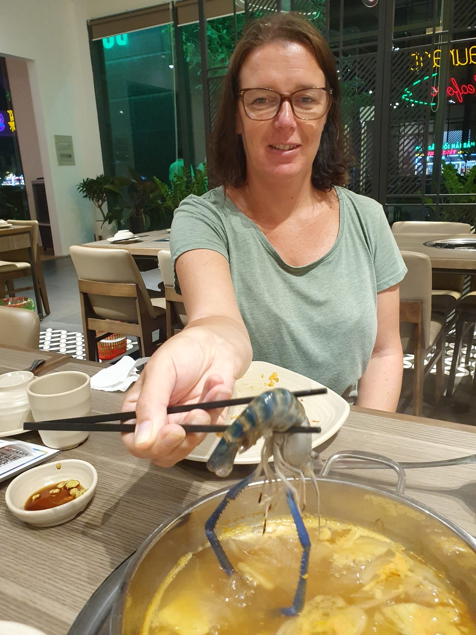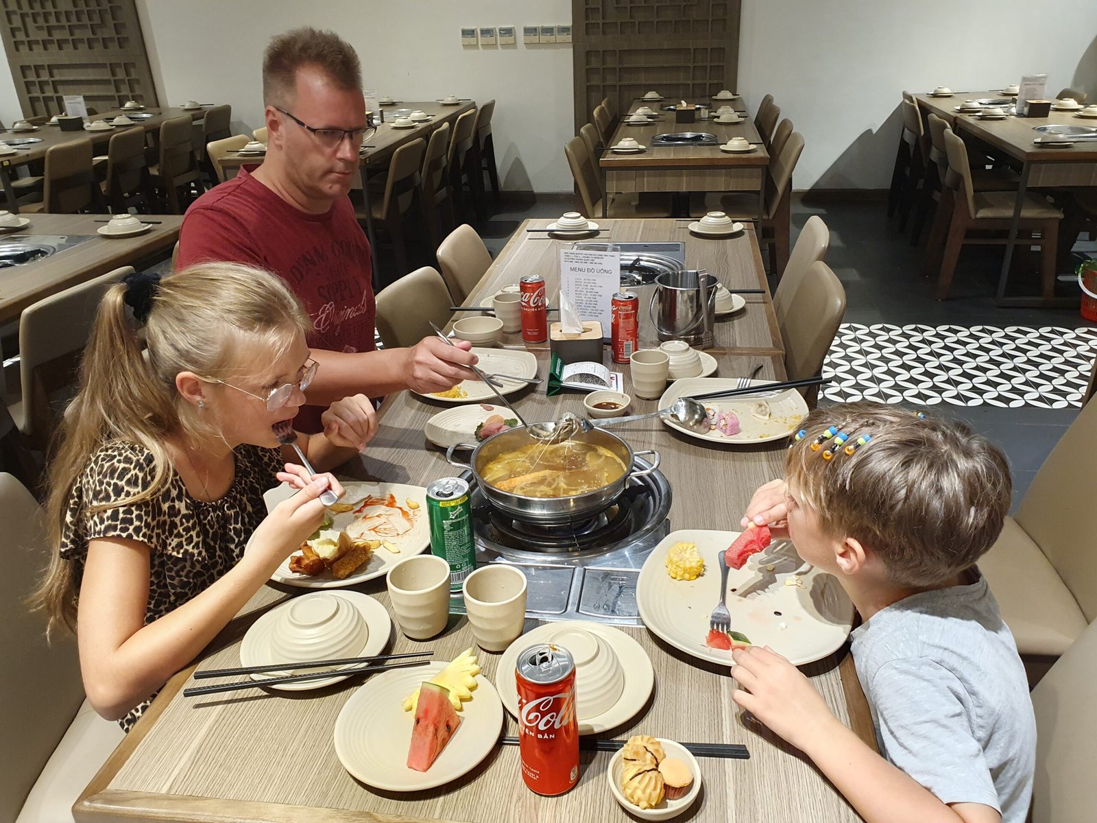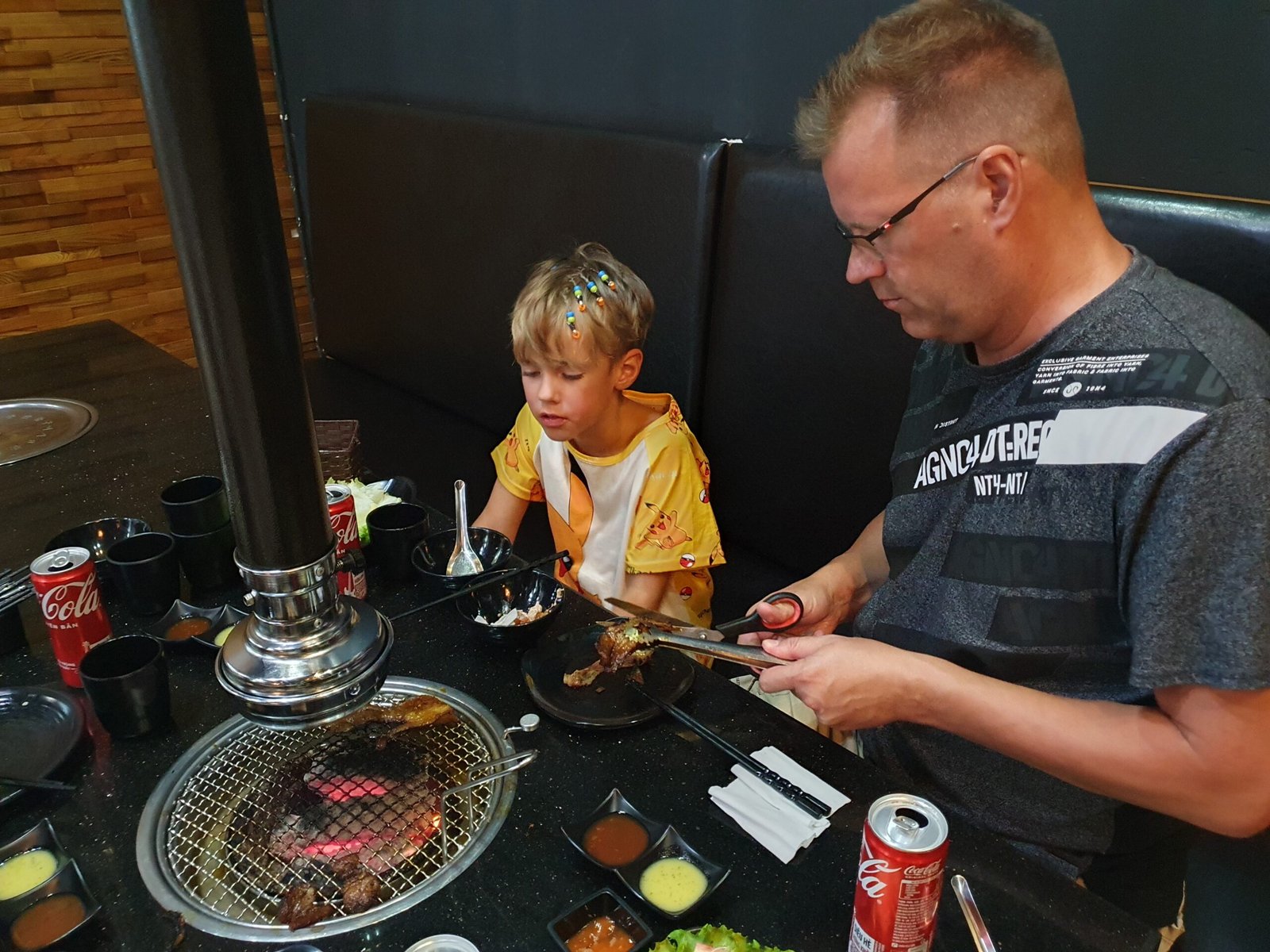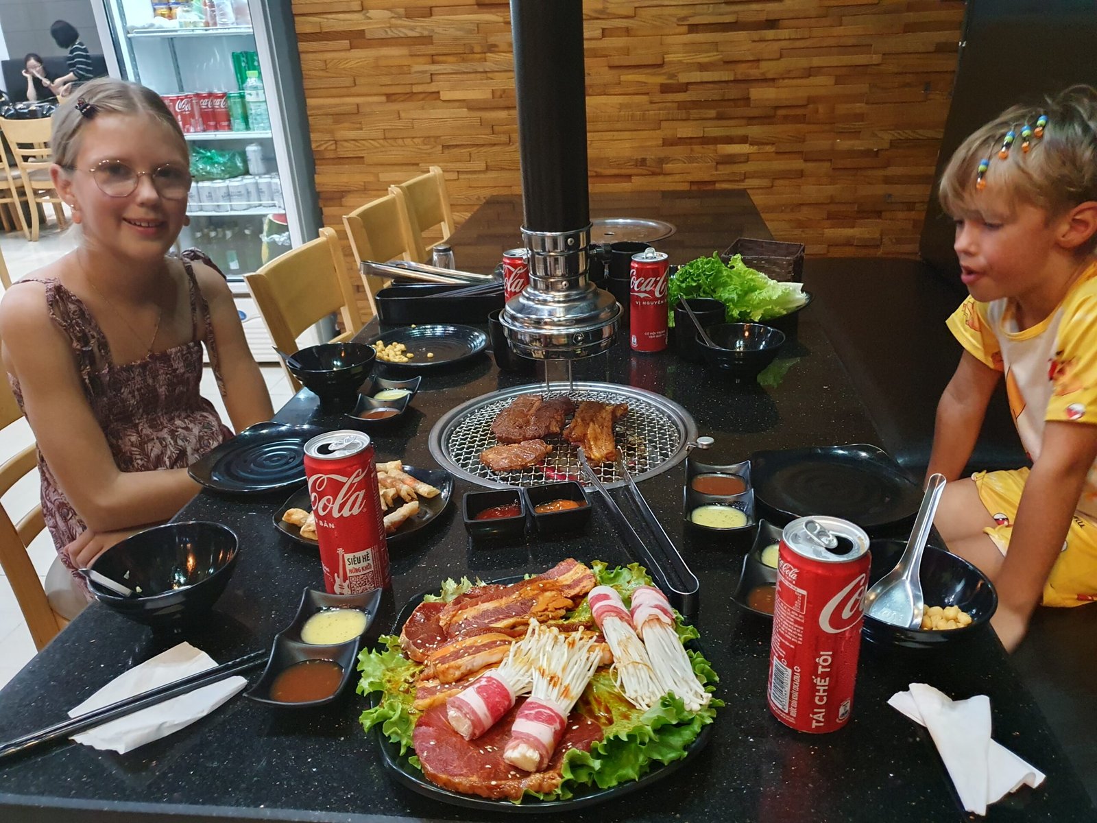 There was also bacon, wrapped around what looked like a white shaving brush. We tried to taste what the white thing was, but we never found out. Certainly not a mushroom, as we first thought. Maybe some kind of spores. We didn’t eat them anyway, but we did grill the bacon. Apparently the restaurant employee found our grilling a bit pathetic, because she came to assist us. Shortly thereafter she came running to us when we were wondering how we were going to cut up the steaks we had grilled, without a single knife. We had gotten a fork (but only one) at a separate request. The woman showed us that the meat was meant to be cut up with scissors, which had been in the cutlery drawer all the time. How didn’t we think of that! Once we had mastered the proper dining technique, we ate almost everything. Only the white shaving brushes and a few lettuce leaves were left uneaten. We were surprised that even the kids liked this dish. They have been a bit sceptical lately about our ethnic food experiments.