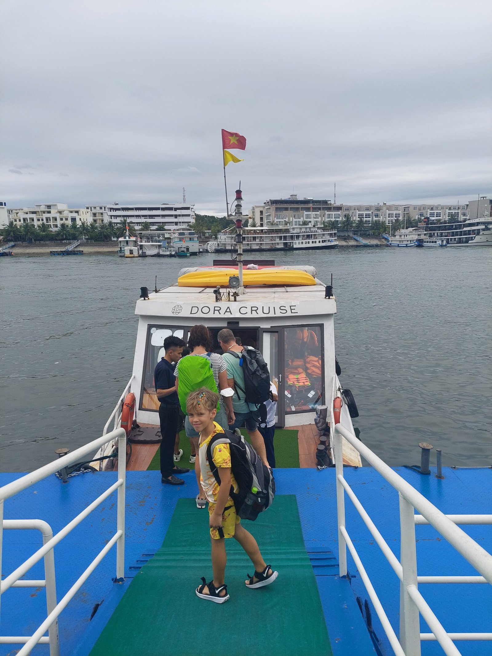 Lauantaina starttasimme puoliltapäivin kahden yön mittaiselle risteilylle Ha Longin lahdella. Olimme ensin harkinneet vain yhden yön mittaista risteilyä, mutta koska Ha Longin kaupungissa itsessään tuntui olevan aika vähän tekemistä, päädyimme kahden yön mittaiseen reissuun. Se osoittautuikin todella hyväksi ratkaisuksi, sillä risteilyn aikana oli paljon järjestettyä ohjelmaa. Lisäksi kaikki ruuat aamiaisesta päivälliseen kuuluivat risteilyn hintaan, niin eipähän tarvinnut miettiä ruokapaikan etsimistä muutamaan päivään. Satama-alue, josta lähdimme, oli valtava. Kaikki laivat ja veneet eivät suinkaan olleet yhdessä ja samassa lahdenpohjukassa, kuten olimme kuvitelleet. Sen sijaan pieniä, ja hieman isompia lähtoportteja oli rannalla useammassa paikassa. Meidän porttimme numero oli 35.