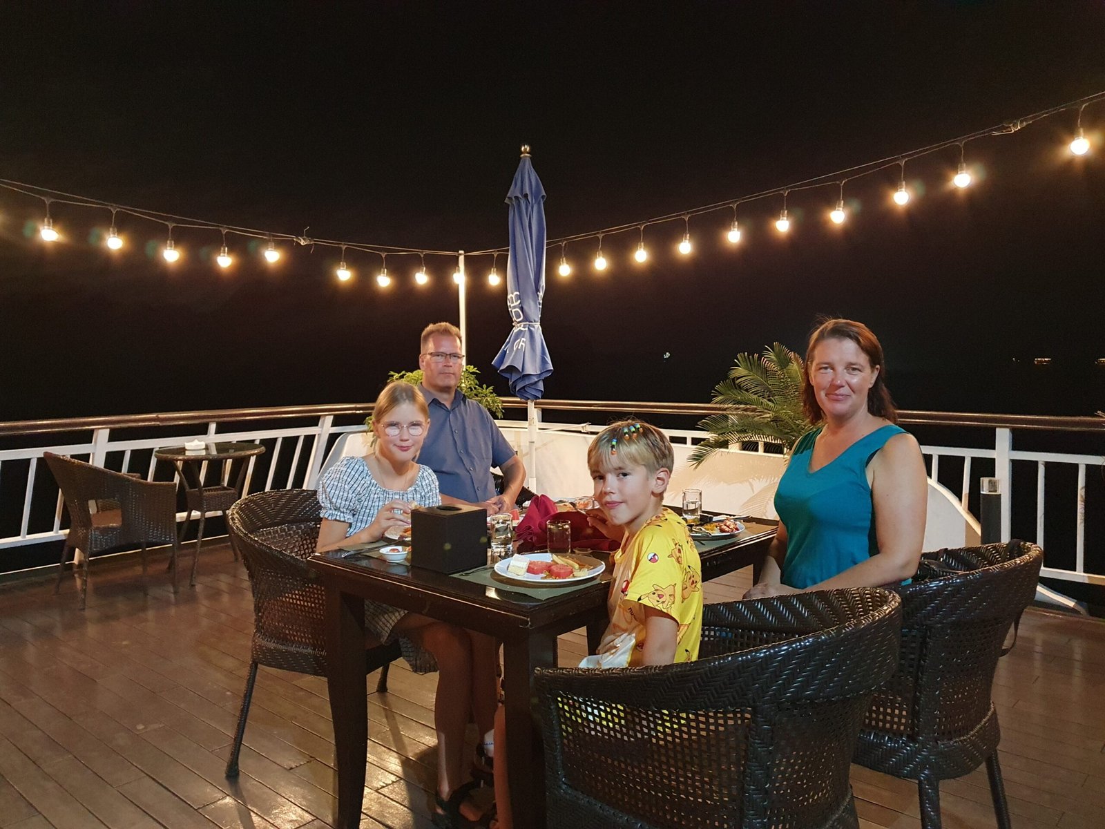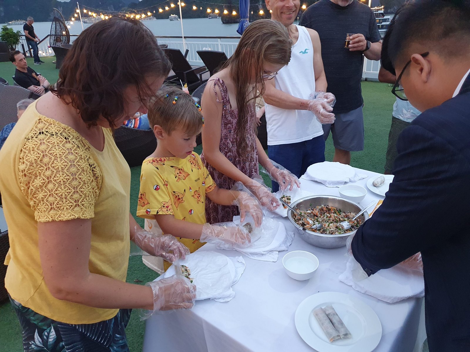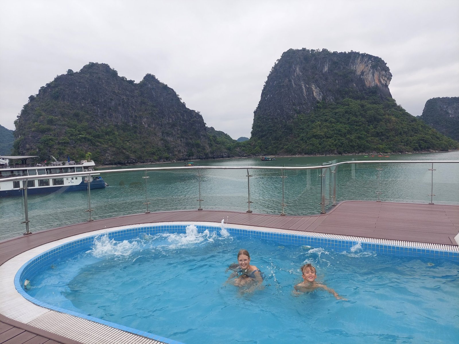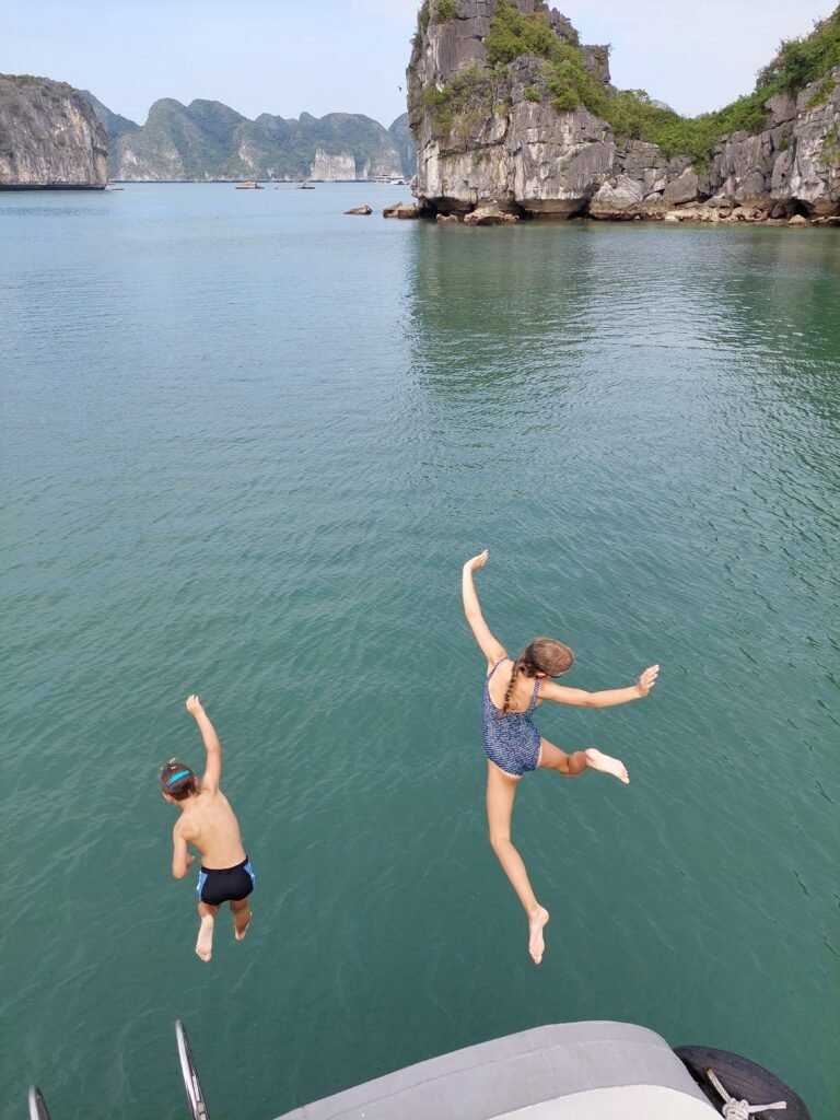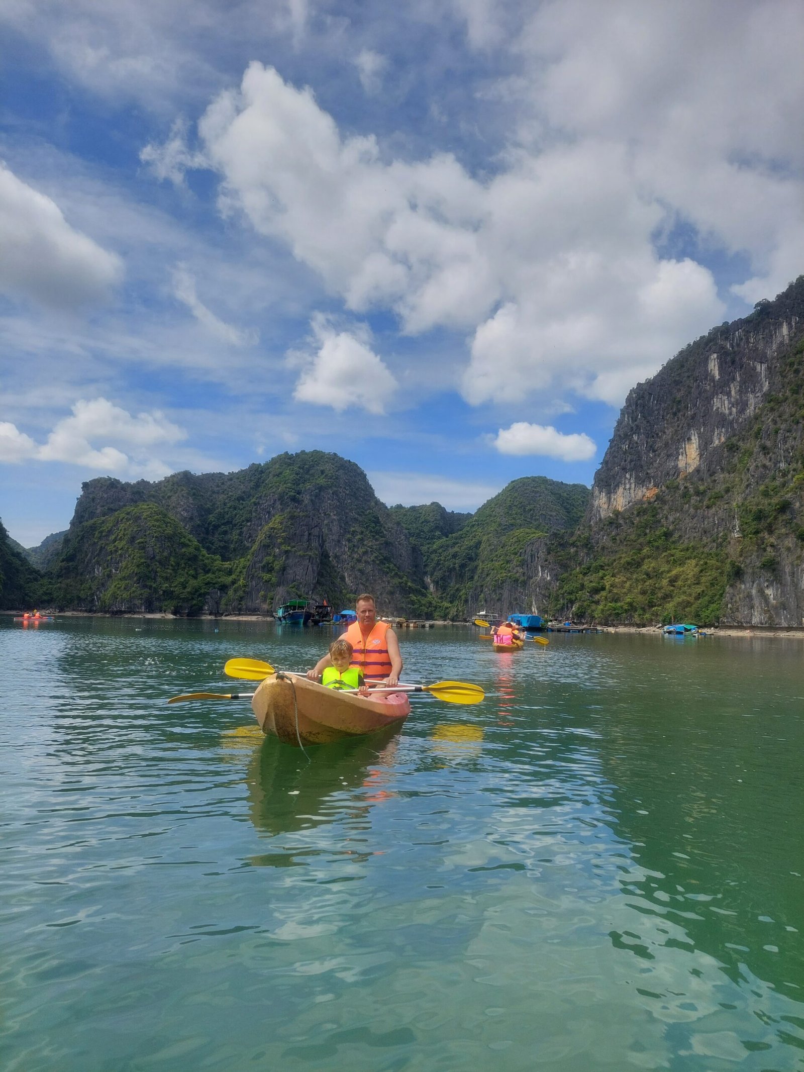 Risteilyn aikana matkanjohtajamme, Bruce Panda, sekä päiväretken vetäjä ”Tom Cruise”, puhuivat kohtuullisen hyvää englantia, joten reissusta sai enemmän irti, kun ymmärsi, mitä meille kerrottiin. Välillä paikalliset puhuvat meille kovasti vietnamia ja olettavat meidän ymmärtävän, mitä he sanovat. Ensimmäisenä päivänä kävimme melomassa sekä pulahdimme laivamme kattoterassilla olevaan porealtaaseen. Illalla päivällisen jälkeen Marko ja lapset kävivät myös kalastamassa mustekaloja. Markolla nappasikin melkein heti, ja hän sai saaliikseen niin ison kalmarin, että jopa laivan henkilökuntakin napsi siitä valokuvia. Muilla kalamiehillä tai –naisilla ei sillä kertaa tärpännyt lainkaan.