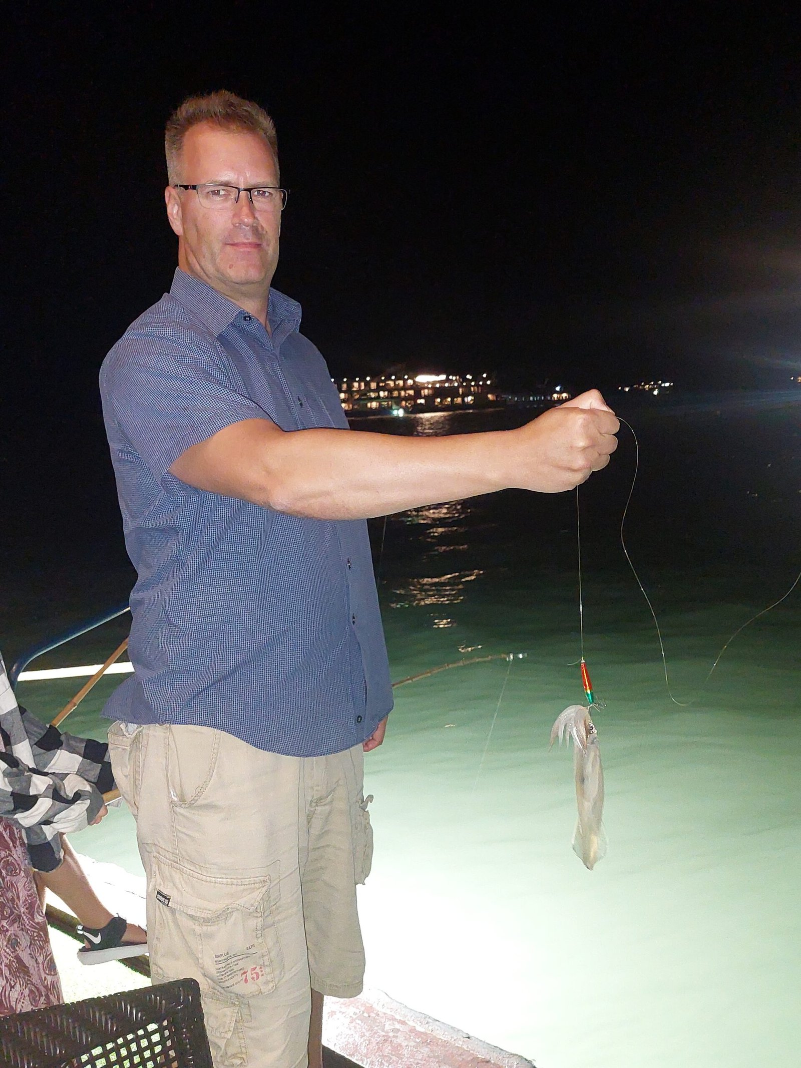 In the evening we returned to the larger boat where after dinner Marko and the children tried their luck at fishing again. This time both Risto and Ronja almost got a squid each. Risto even managed to get his squid up out of the water, but then the thing got loose. Ronja’s squid was just following the bait to the surface, but then disappeared back into the depths.