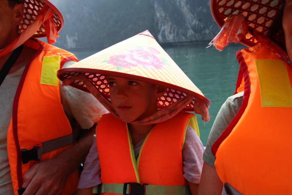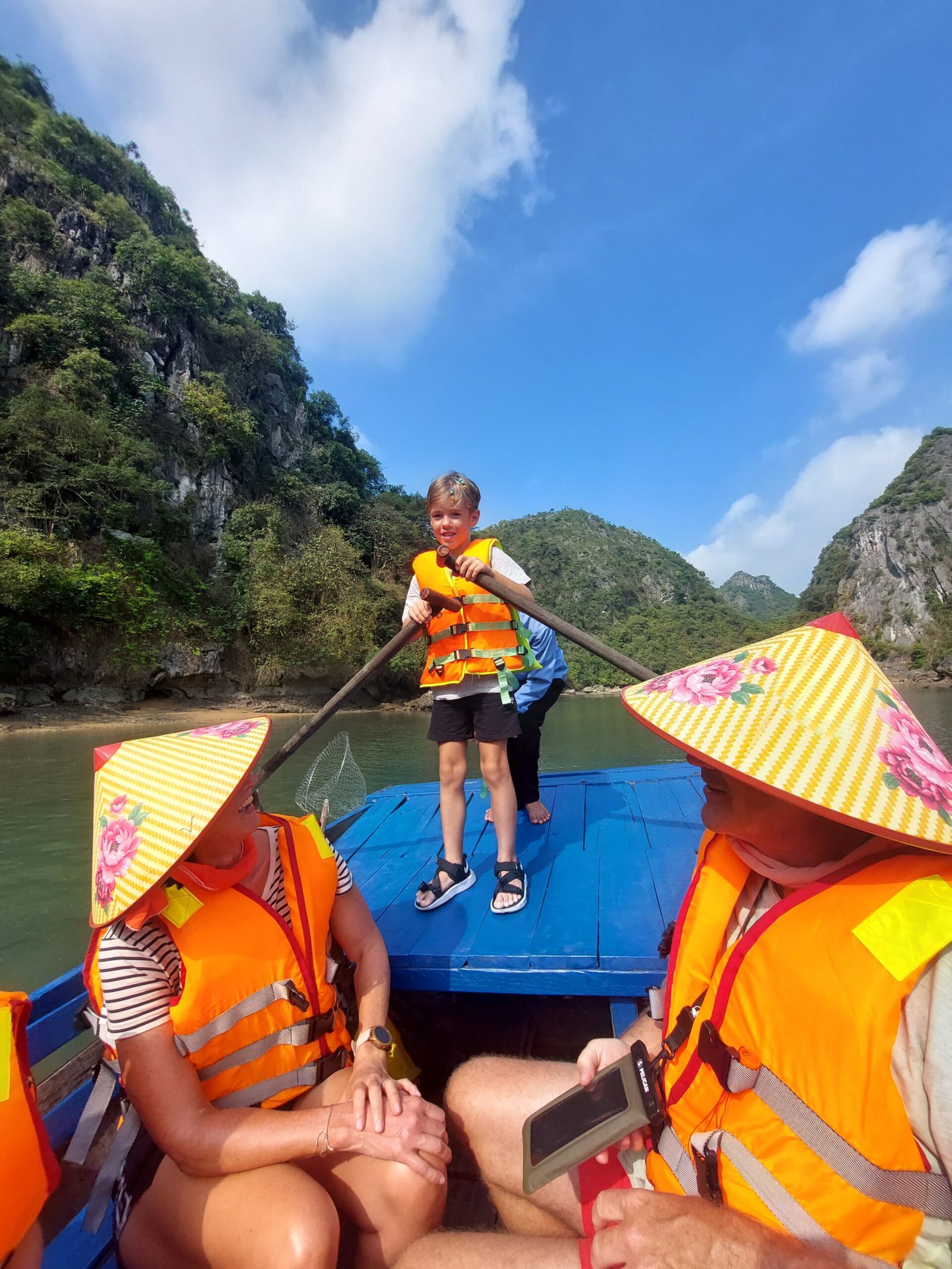 On Monday on the way back, we stopped at another small fishing village, where we took a rowing boat trip into a cave. The tour was marketed to us as a “dark and bright cave tour”, but in reality the “bright cave” was just a large tunnel formed in the limestone cliffs. We couldn’t even get into the dark cave, as there had been some incident of tourists getting stuck there at high tide. Now the opening of the cave is blocked with a net. Both children got to try rowing, but both little skippers just steered the boat in circles.