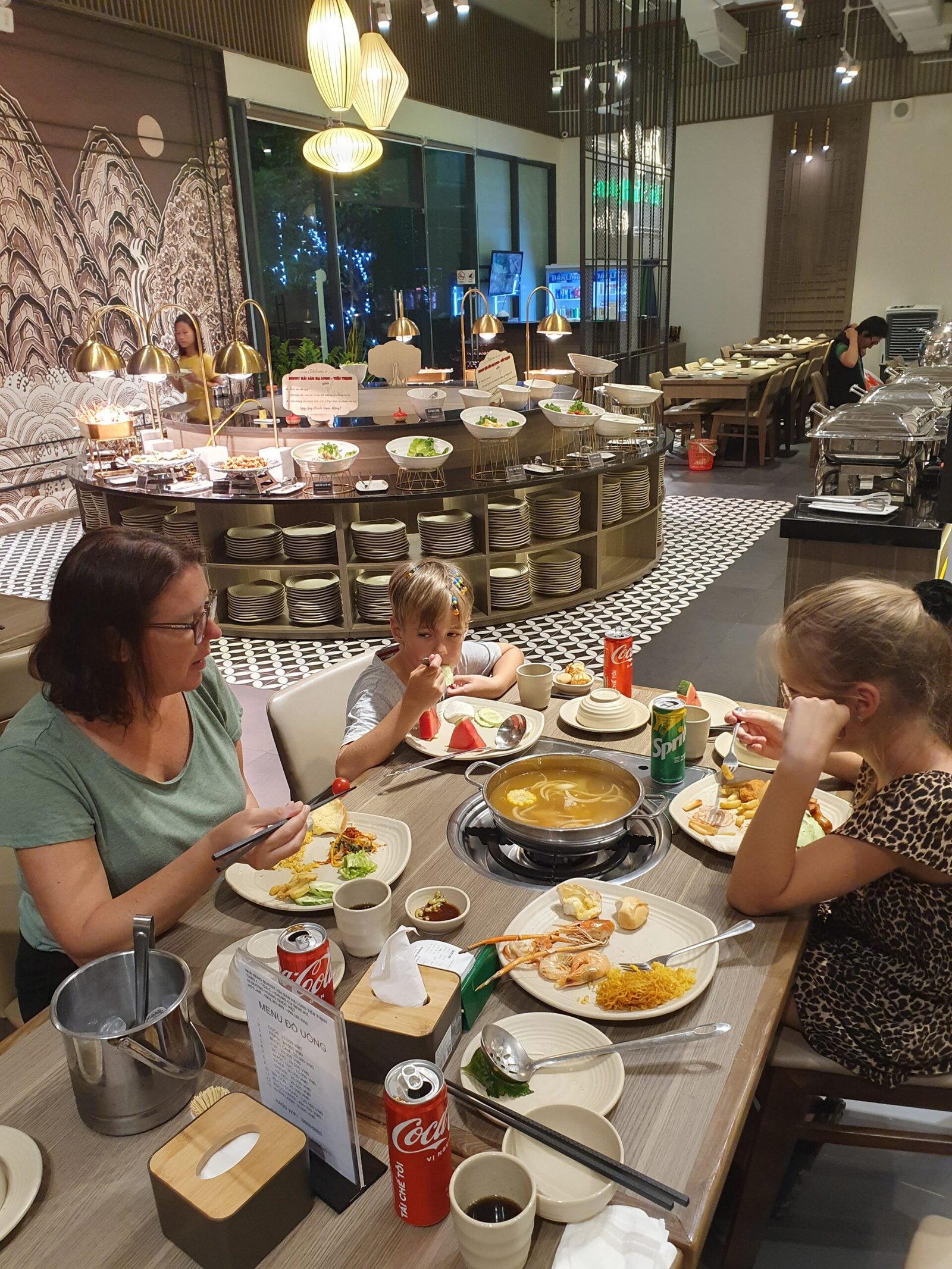 Illalla kävimme vielä päivällisellä alakerran buffet-ravintolassa. Tarjolla oli pääasiassa erilaisia mereneläviä, mutta myös lapset saivat mahansa täyteen tässä paikassa. Buffetin hinta oli hinnoiteltu pituuden mukaan. Alle metrin mittaiset saivat syödä ilmaiseksi. 1m – 1,30m pituiset maksoivat 7€ ja “täysimittaiset” 12€. Hinta oli todella halpa, sillä kuten alla olevista kuvista ja videoista näkyy, tarjolla oli todella runsaasti eri vaihtoehtoja.