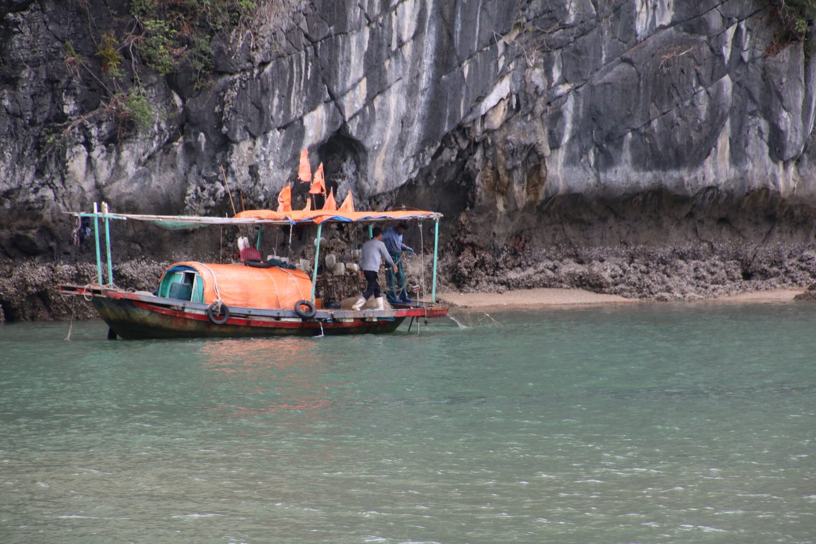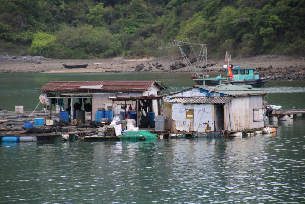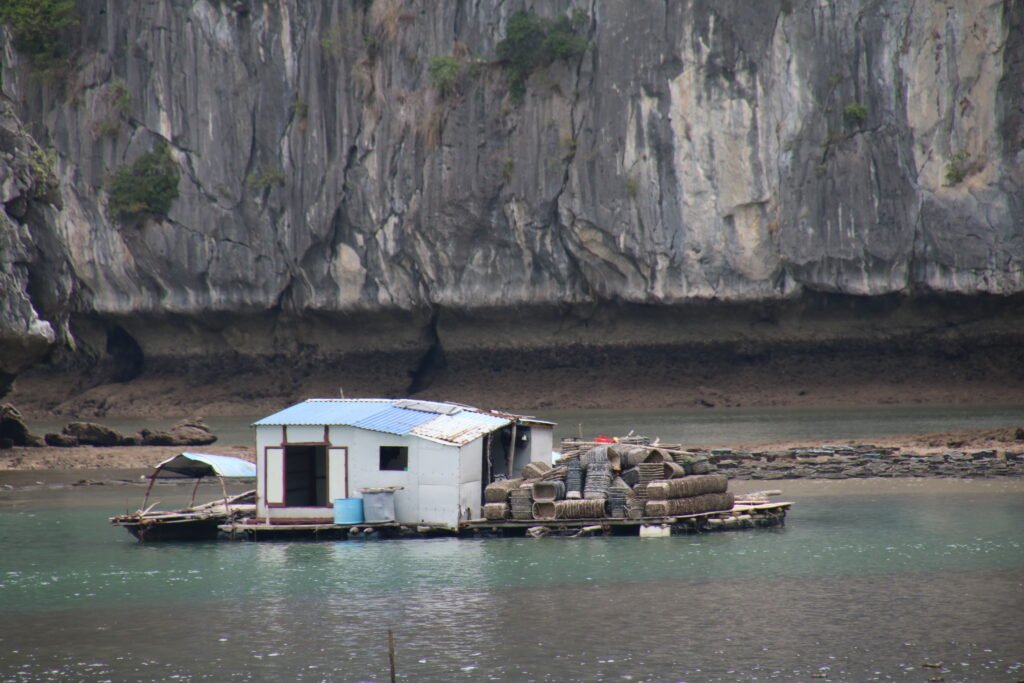 Lounaan aikana puksuttelimme paikallisen kelluvan kalastajakylän luokse. Sieltä saimme jälleen kajakit käyttöömme. Täällä ei saanut uida, sillä vesi oli kuulemma aika likaista. No ihmekö tuo, kun viemäröintinä näissä kylissä on reikä lattiassa suoraan mereen. Vietnamin hallitus onkin alkanut tehdä töitä sen eteen, että saisi yhä kelluvissa kalastajakylissä elävät ihmiset muuttamaan mantereelle. Lahden puhtaus on yksi syy, mutta myös koulunkäynti on kylissä asuville lapsille ongelma. Niissä kun ei ole tarjolla opetusta kuin vain ensimmäisen viiden luokan ajalle. Jos opintoja haluaisi jatkaa sen jälkeen, olisi matkattava mantereelle, mutta sitä perheet eivät tee. Heillä kun ei ole aikaa, eikä rahaa kuljettaa lapsiaan päivittäin opiskelemaan muualle. Kaikki aika kun kuluu heillä elannon hankkimiseen. Kalastuksen lisäksi kylissä asuvat perheet viljelivät ostereita. Eipä tulisi tosin mieleen ostaa ostereita heiltä, kun tietää, millaisessa vedessä ne siellä kasvavat.