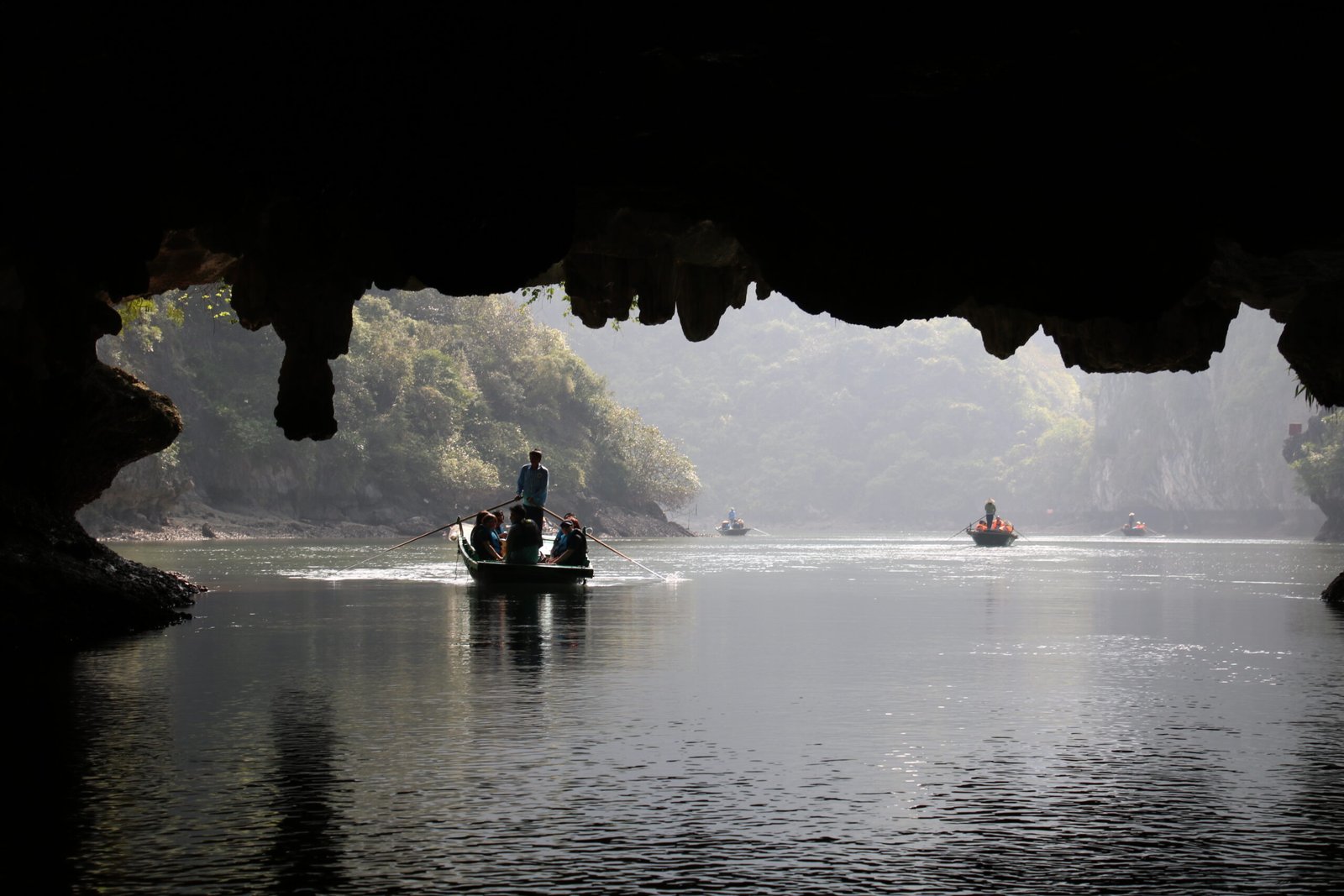 Maanantaina paluumatkalla pysähdyimme vielä toisen pienen kalastajakylän luona, jossa pääsimme soutuveneretkelle luolaan. Retki markkinoitiin meille nimellä ”dark and bright cave”, mutta todellisuudessa ”bright cave” oli oikeastaan kalkkikivikallioihin muodostunut suuri tunneli. Pimeään luolaan emme päässeet edes sisälle, sillä sinne on kuulemma joskus nousuveden aikaan jäänyt turisteja jumiin, joten nyt sinne meno oli estetty luolan suussa olevalla verkolla. Soutuvene, jolla paikallinen kalastaja souti meitä eteenpäin muistutti lähinnä malliltaan ammetta, joten sen eteneminen ei ollut kovin sulavaa. Vene myös keikkui melkoisesti. Molemmat lapsetkin pääsivät kokeilemaan soutamista, mutta molempien pikkukippareiden ohjauksessa vene pyöri vain ympyrää. Niinpä varsinainen kuskimme palasi puikkoihin, ja souti meidät takaisin.