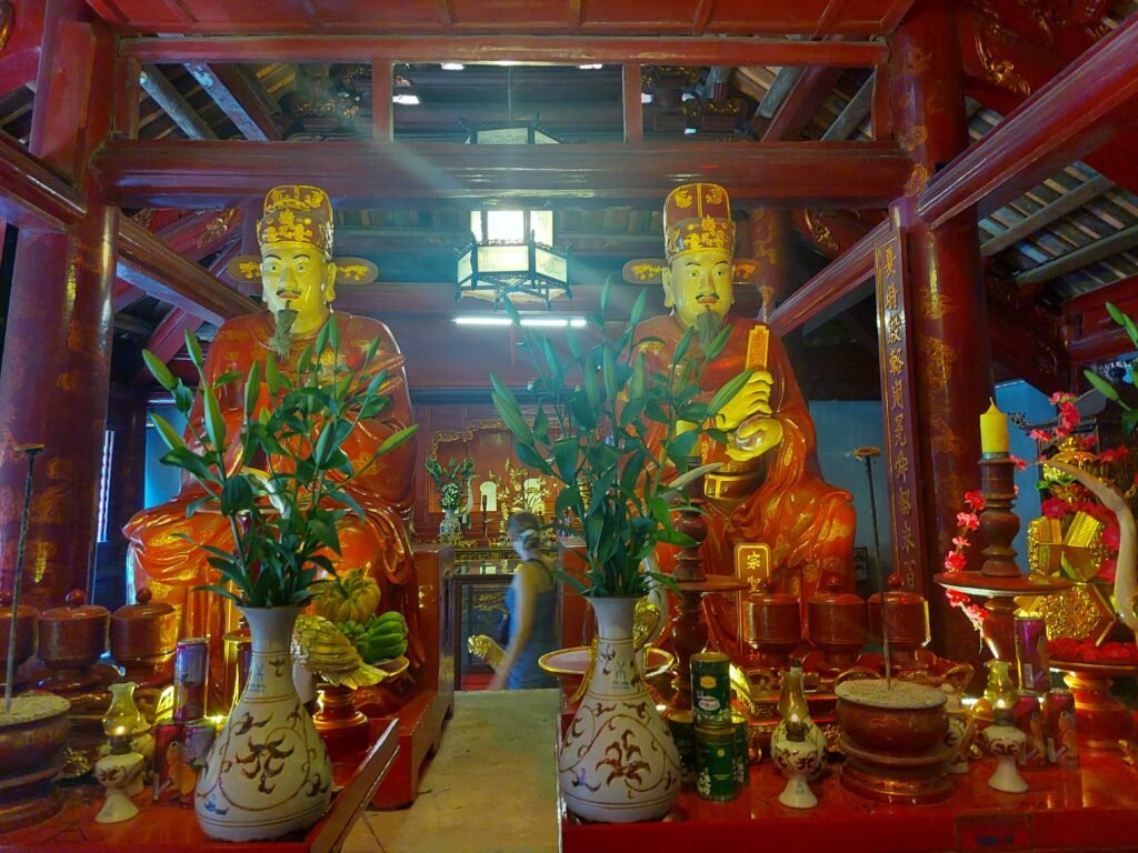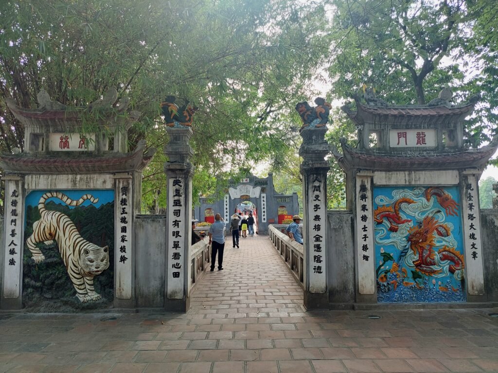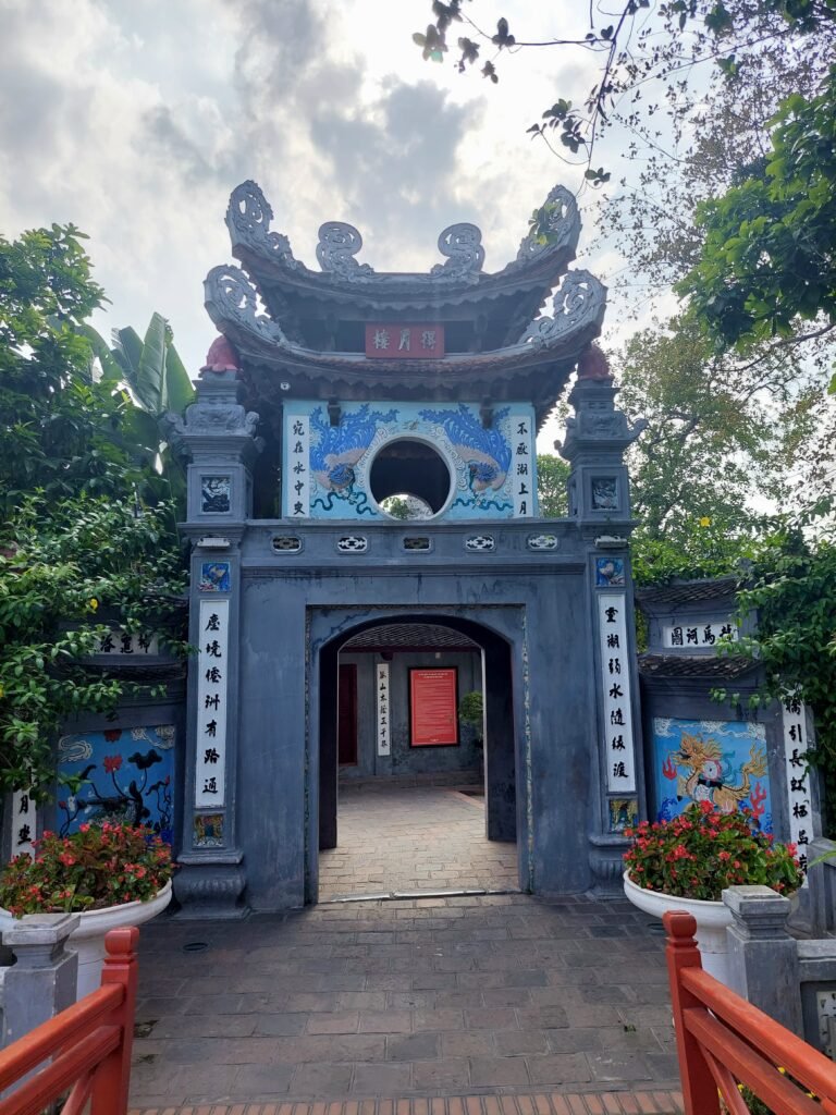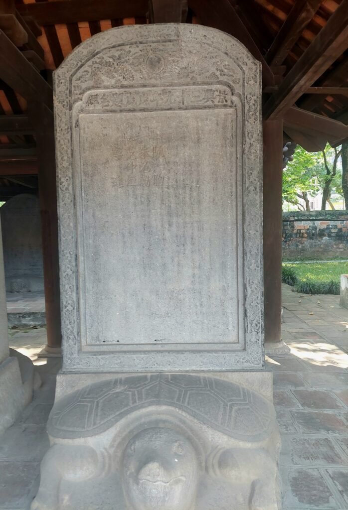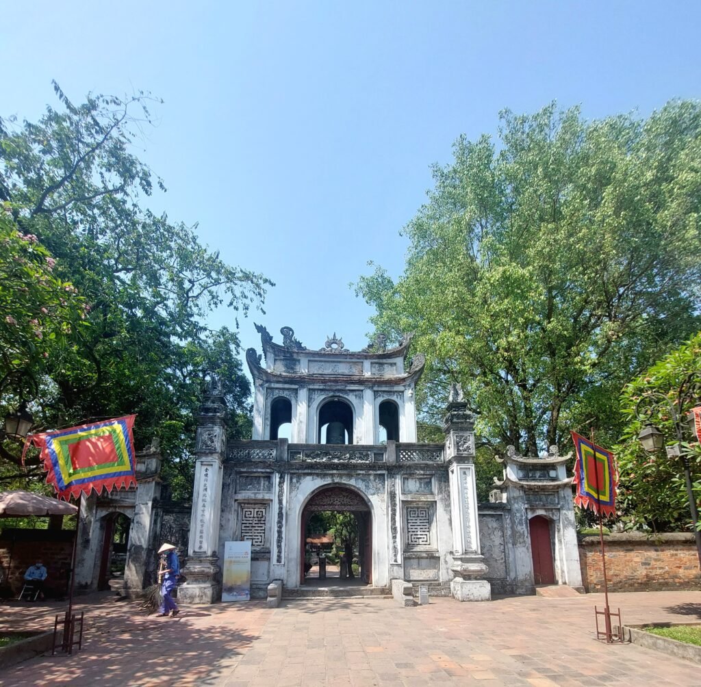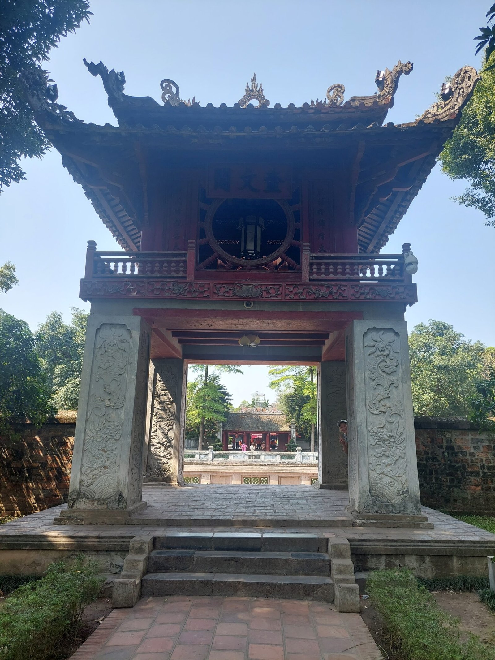 Jatkettuamme matkaa puistolta vielä muutaman sata metriä eteenpäin, saavuimme viimein temppelille. Keisari Ly Thanh Tong perusti kirjallisuuden temppelin vuonna 1070 kiinalaisen filosofi Konfutsen kunniaksi. Temppelin betonisiin kilpikonnatauluihin nakuteltiin joka vuosi sieltä valmistuneiden opiskelijoiden nimet. Oli suuri kunnia saada oma nimensä kilpikonnatauluun, joten opiskelijat tekivät ahkerasti töitä. Vielä nykypäivänäkin opiskelijat tulevat juhlimaan valmistumista temppelille. Mekin satuimme näkemään jonkin koululaisryhmän, joka oli tullut viettämään temppelille luultavasti jonkinsorttista lukukauden päätösjuhlaa. Ensin oppilaat seisoivat rivissä jonkinlaisen papin takana, joka piti alttarilla puhetta kasvot alttarille päin kääntyneenä. Kun tämä oli ohi, lauloivat lapset jonkin laulun. Kyseessä olisi voinut olla vaikka koulun oma hymni, mutta emme ole tietenkään tästä varmoja. Laulun jälkeen oli oppilaan puheen vuoro. Siinä vaiheessa aloimme jatkaa matkaa, sillä temppelillä ei luonnollisestikaan ollut ilmastointia, joten siellä oli aivan järkyttävän kuuma. Ainoastaan päätemppelin sisällä kungfutse-patsaita viilentämässä oli valtavia tuulettimia. Siksi viihdyimmekin siellä hieman pidempään kuin muissa temppelin osissa.