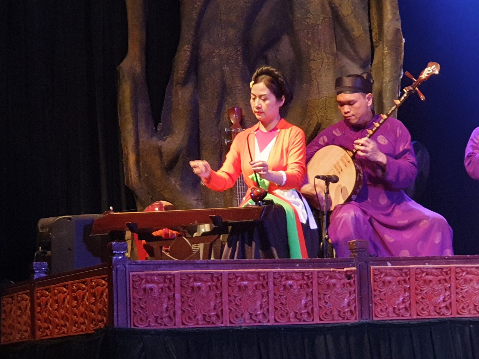 After the temple visit, we went to the Thang Long Water Puppet Theatre. We were lucky as the first show of the day was about to start. We managed to get ourselves front row seats for 200 000VND/person (8€), on top of which we paid a total of 200 000VND for an English audio guide for each of us. The Water Puppet Theatre is a rather strange concept. The performance is accompanied by traditional instruments and singing. The puppets moving on the water are guided from behind curtains with long wooden sticks. The audience can only see the puppets. The people moving the puppets stand waist-deep in the water throughout the performance, hidden behind the curtains. The hour long show was very interesting. The performance doesn’t have an actual plot, instead it consisted of several separate short scenes from well known folklore stories.