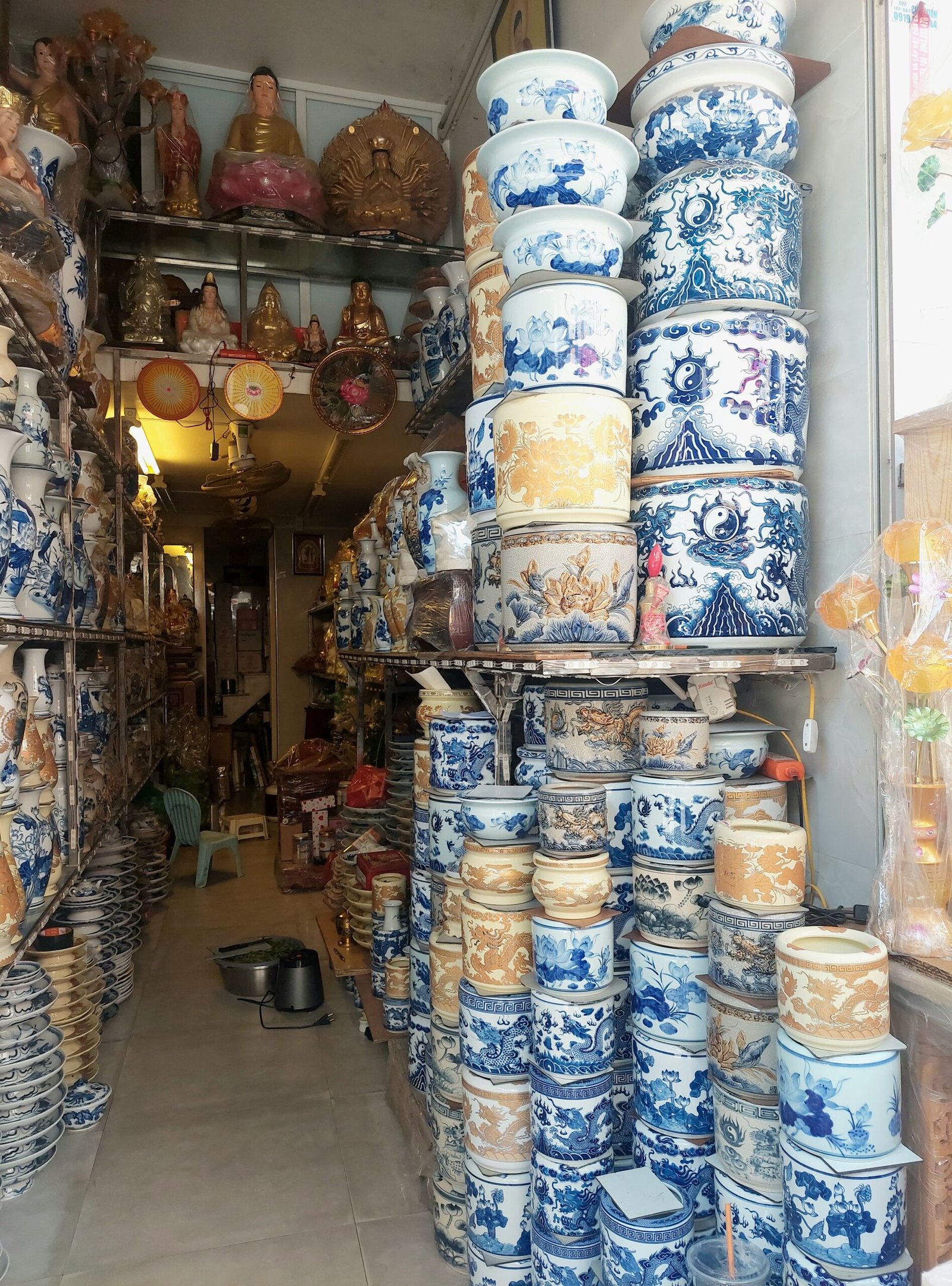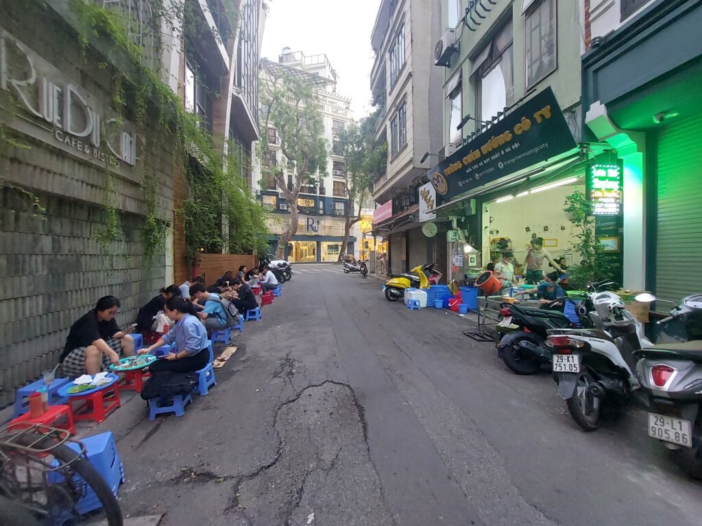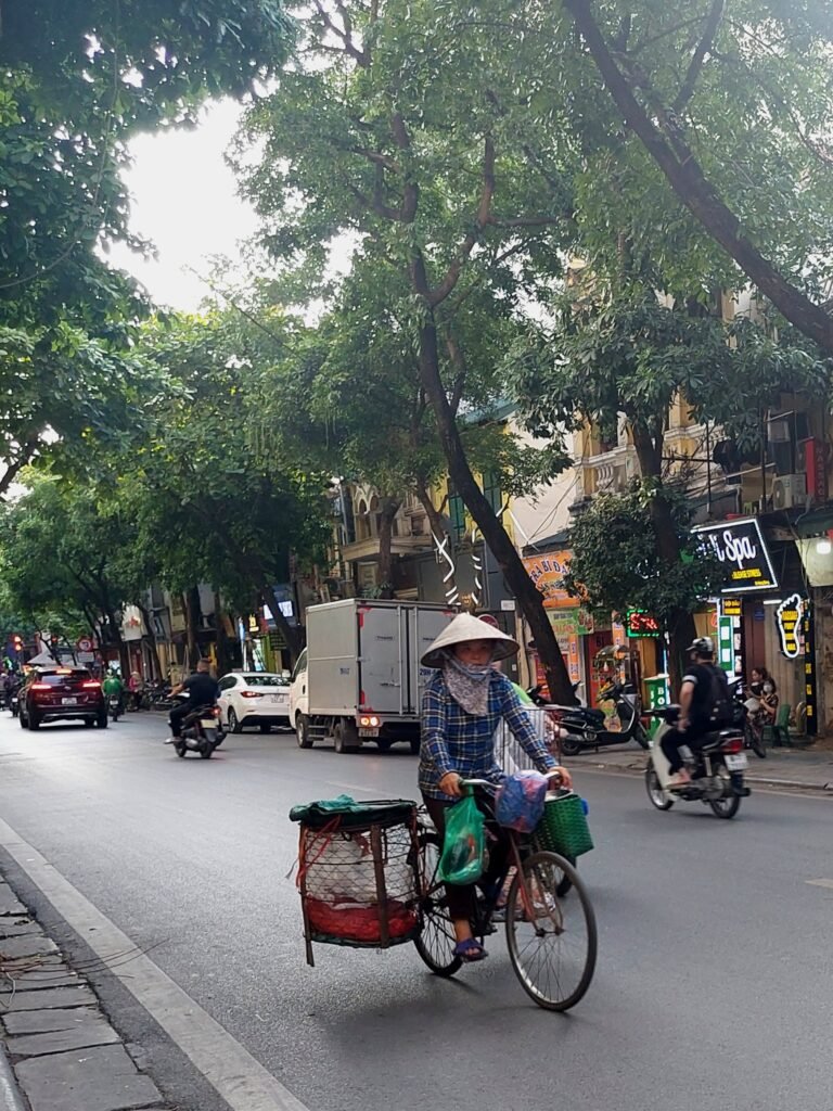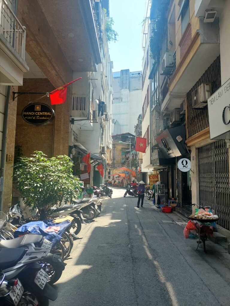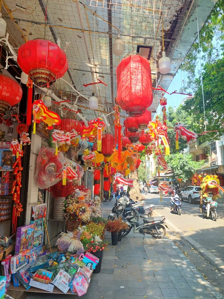 Hanoi’s scorching heat hadn’t exactly eased when we stepped out of our apartment onto the streets of the old city. The temperature was +39 degrees and “feels like” +44C. But with water bottles and fans in hand, we kept walking along the shady side of the street. We followed a route that had been marked on our map we had picked up at the hotel reception. Very quickly we discovered that this route went along different merchandise streets, each selling a particular product. We walked along streets selling clothes, paper lanterns, health products and decorative items, among others. As all the small shops on the streets were often spread out onto the non-existent narrow pavement, we often had to walk on the side of the road among cars and scooters. You had to be very careful not to get hit by a scooter.