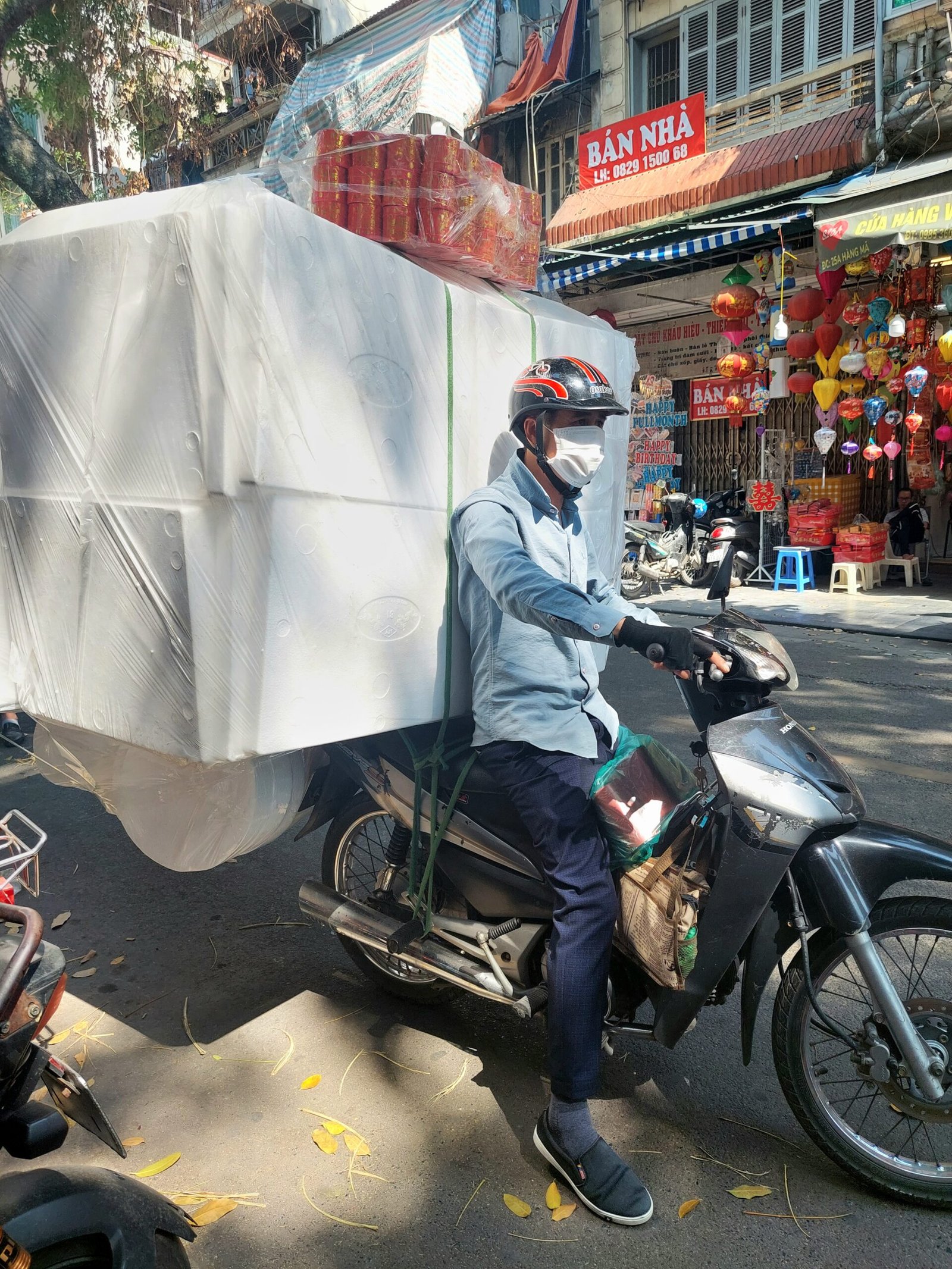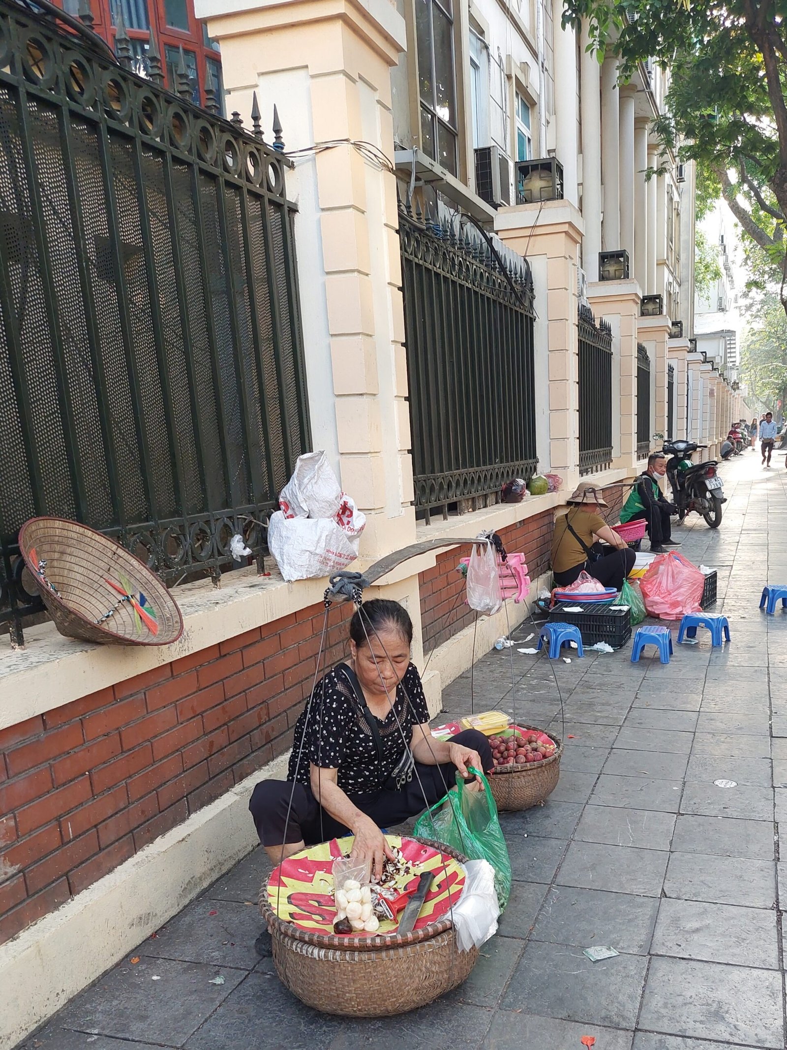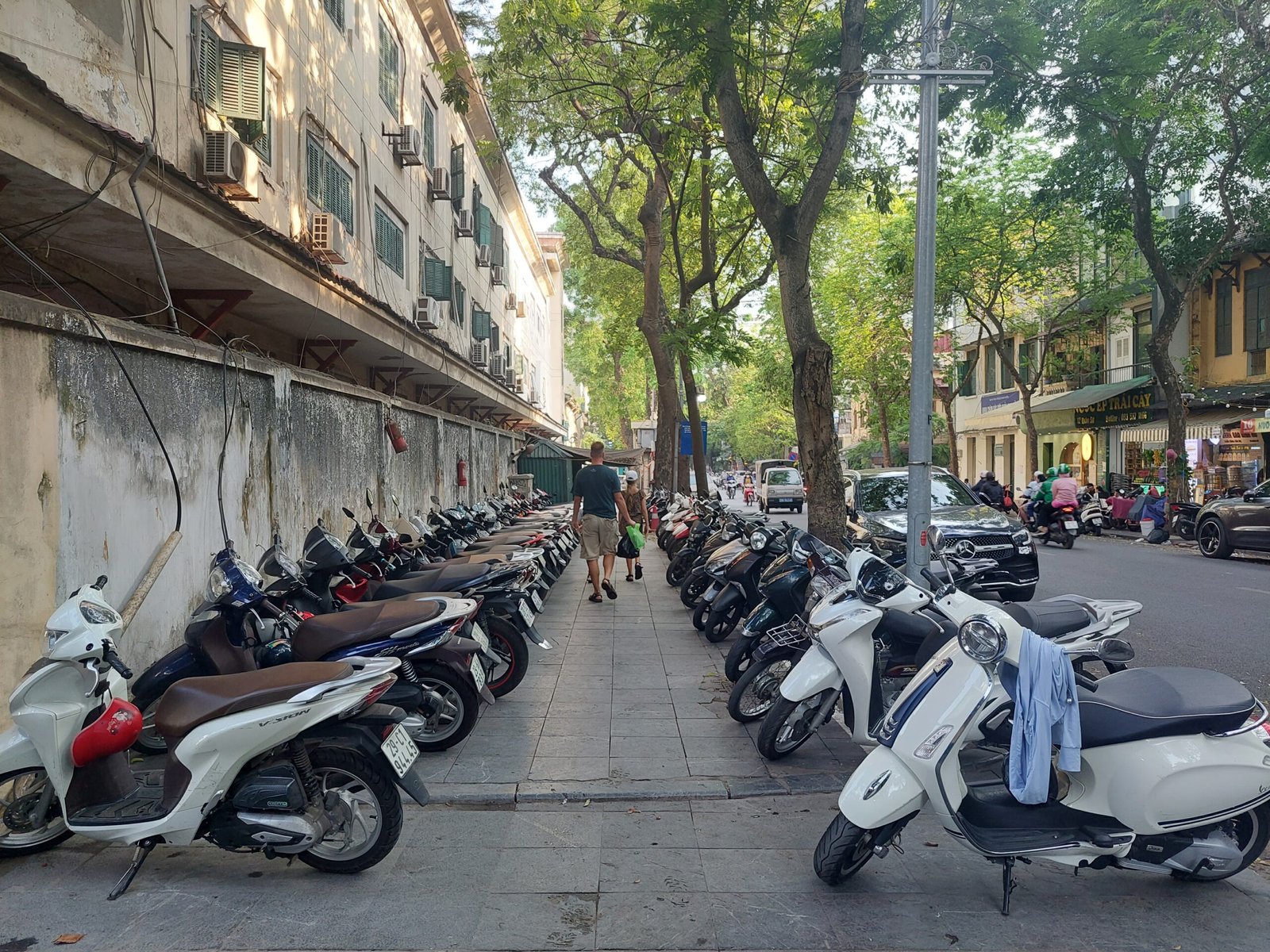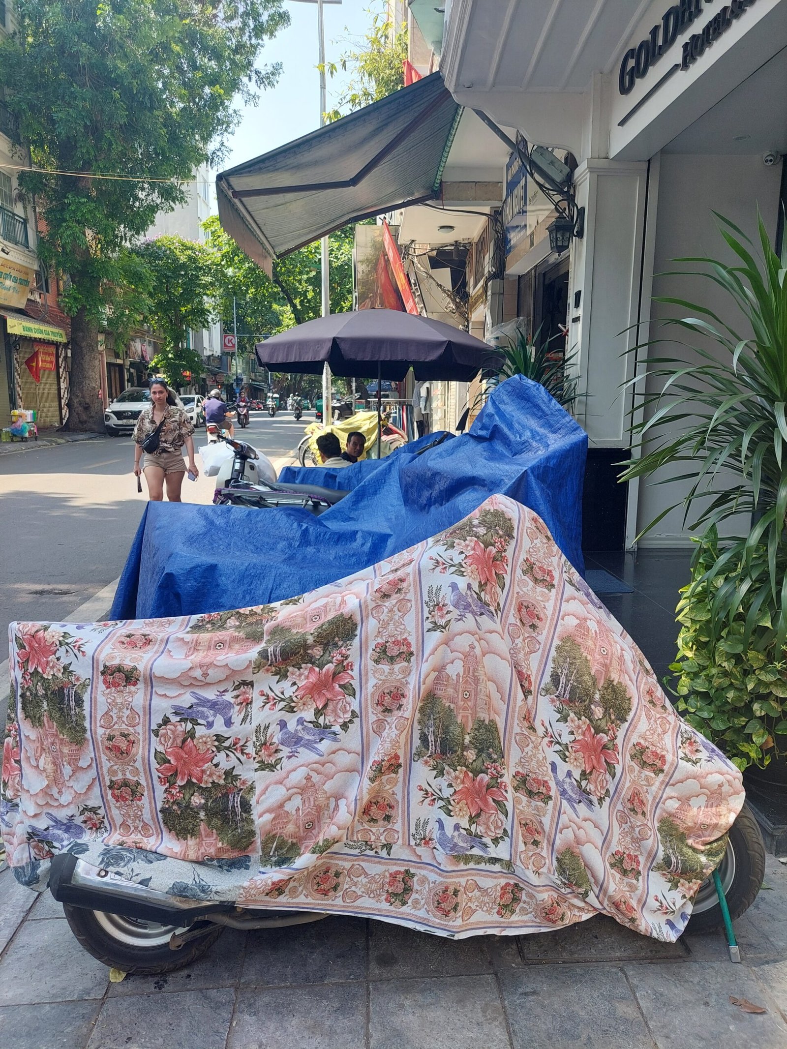 Hanoin hirmuhelteet eivät olleet varsinaisesti helpottaneet, kun astuimme seuraavana päivänä ulos asunnostamme vanhan kaupungin kaduille. Lämpötila oli +39 astetta ja ”tuntuu kuin” +44C. Vesipullot ja viuhkat käsissämme kävelimme kuitenkin aina kadun varjoisaa puolta eteenpäin. Seurasimme hotellin vastaanotosta nappaamaamme karttaan piirrettyä reittiä. Hyvin nopeasti ymmärsimme tämän reitin kulkevan pitkin katuja, joissa jokaisella myytiin jotakin tiettyä tuotetta. Kävelimme mm. vaate-, paperilyhty-, luontaistuote- ja koriste-esinekatuja pitkin. Koska kaikki katujen pikkukaupat levittäytyivät myös olemattoman kapealle jalkakäytävälle asti, jouduimme kulkemaan usein tien reunassa autojen ja skoottereiden seassa. Siinä sai olla todella tarkkana, ettei jäänyt skootterin tönäisemäksi.