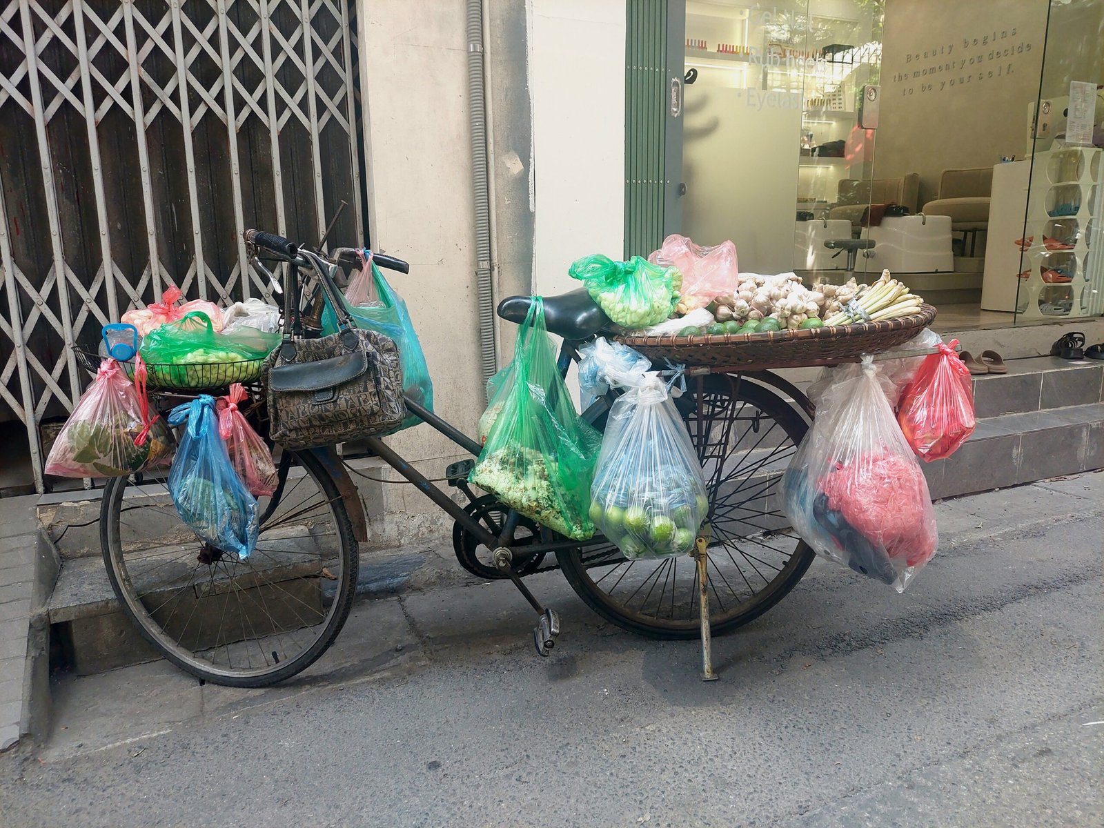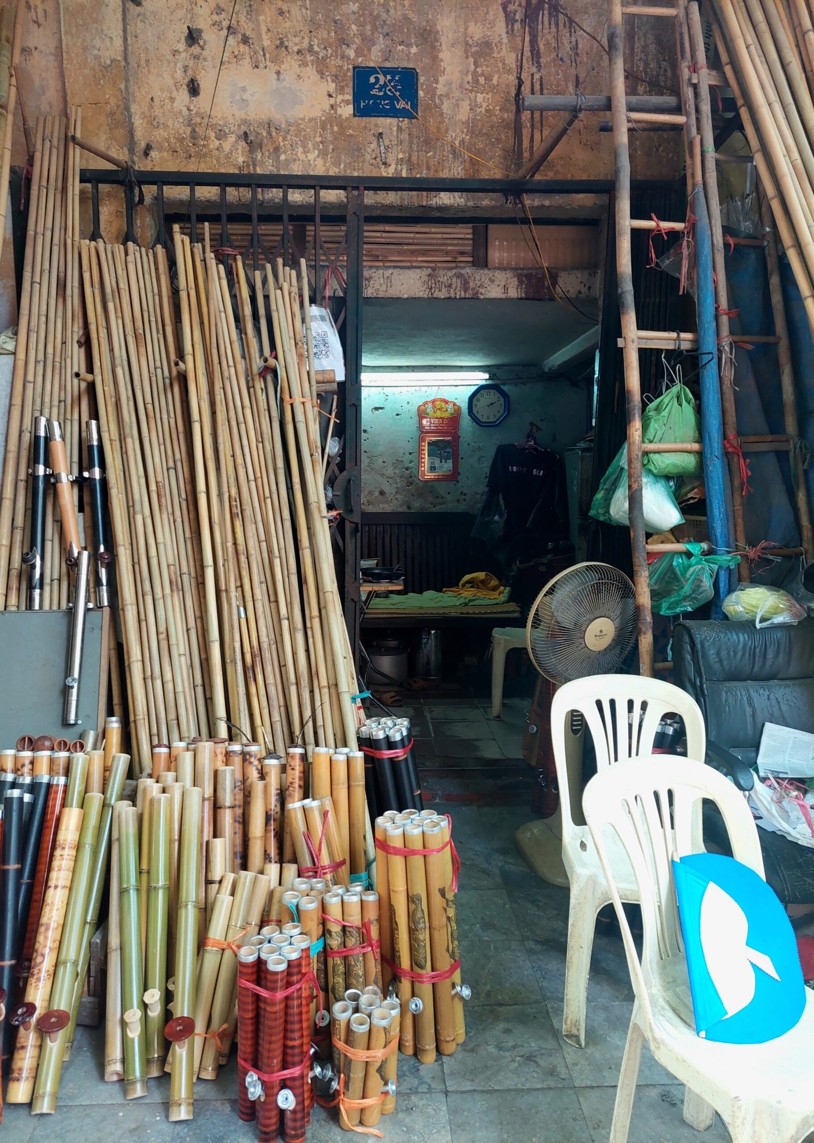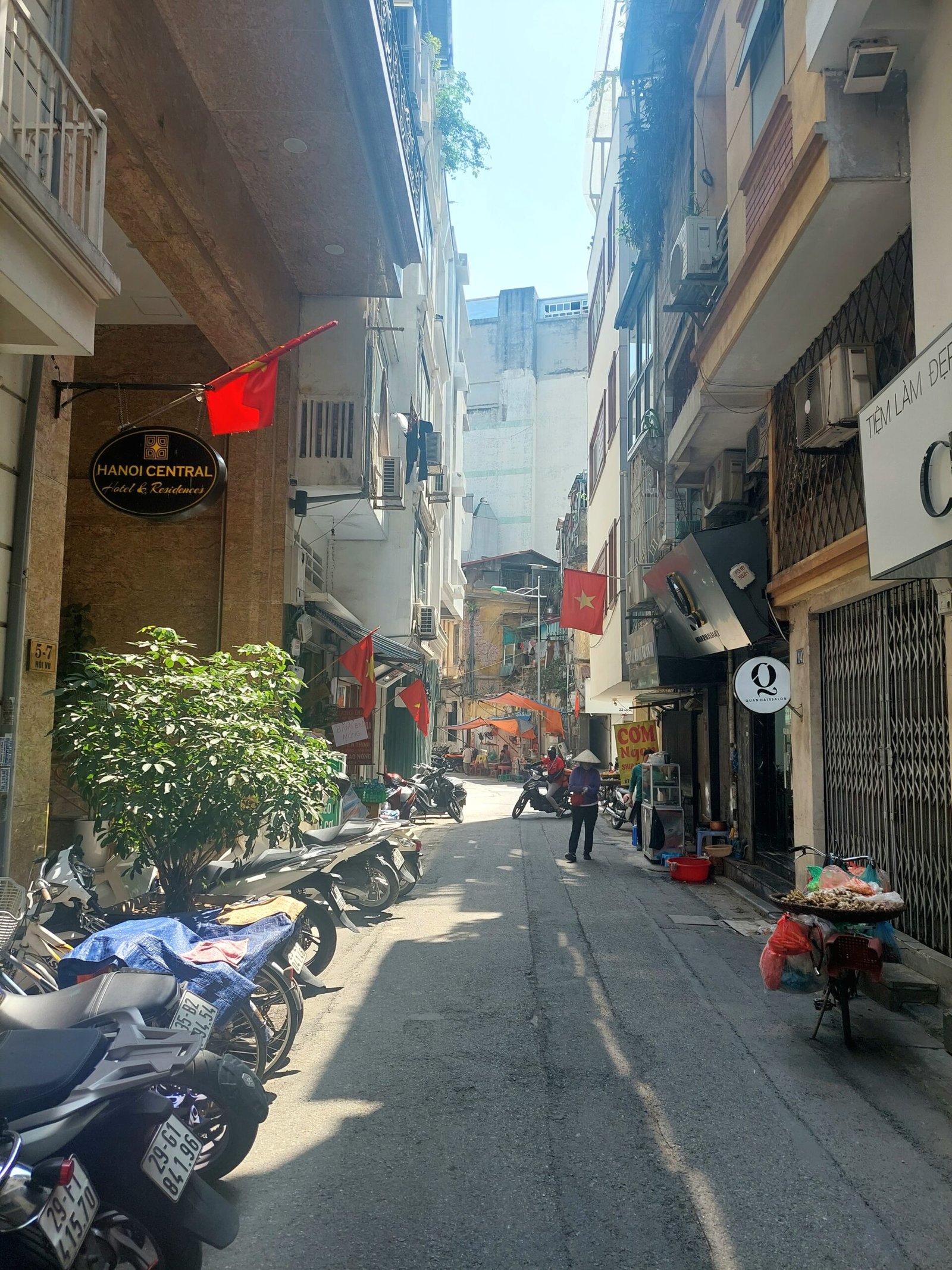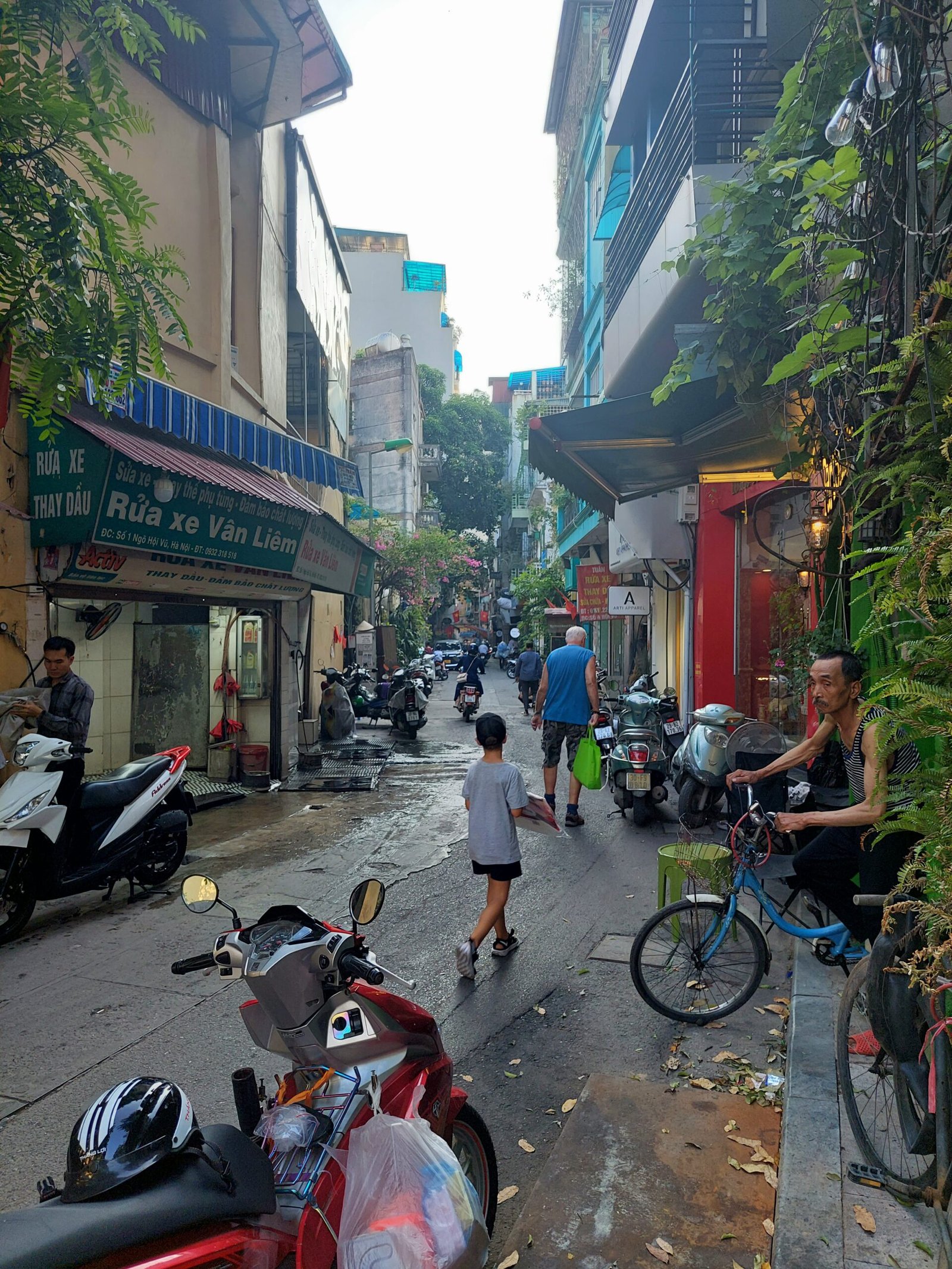 Hanoin hirmuhelteet eivät olleet varsinaisesti helpottaneet, kun astuimme seuraavana päivänä ulos asunnostamme vanhan kaupungin kaduille. Lämpötila oli +39 astetta ja ”tuntuu kuin” +44C. Vesipullot ja viuhkat käsissämme kävelimme kuitenkin aina kadun varjoisaa puolta eteenpäin. Seurasimme hotellin vastaanotosta nappaamaamme karttaan piirrettyä reittiä. Hyvin nopeasti ymmärsimme tämän reitin kulkevan pitkin katuja, joissa jokaisella myytiin jotakin tiettyä tuotetta. Kävelimme mm. vaate-, paperilyhty-, luontaistuote- ja koriste-esinekatuja pitkin. Koska kaikki katujen pikkukaupat levittäytyivät myös olemattoman kapealle jalkakäytävälle asti, jouduimme kulkemaan usein tien reunassa autojen ja skoottereiden seassa. Siinä sai olla todella tarkkana, ettei jäänyt skootterin tönäisemäksi.