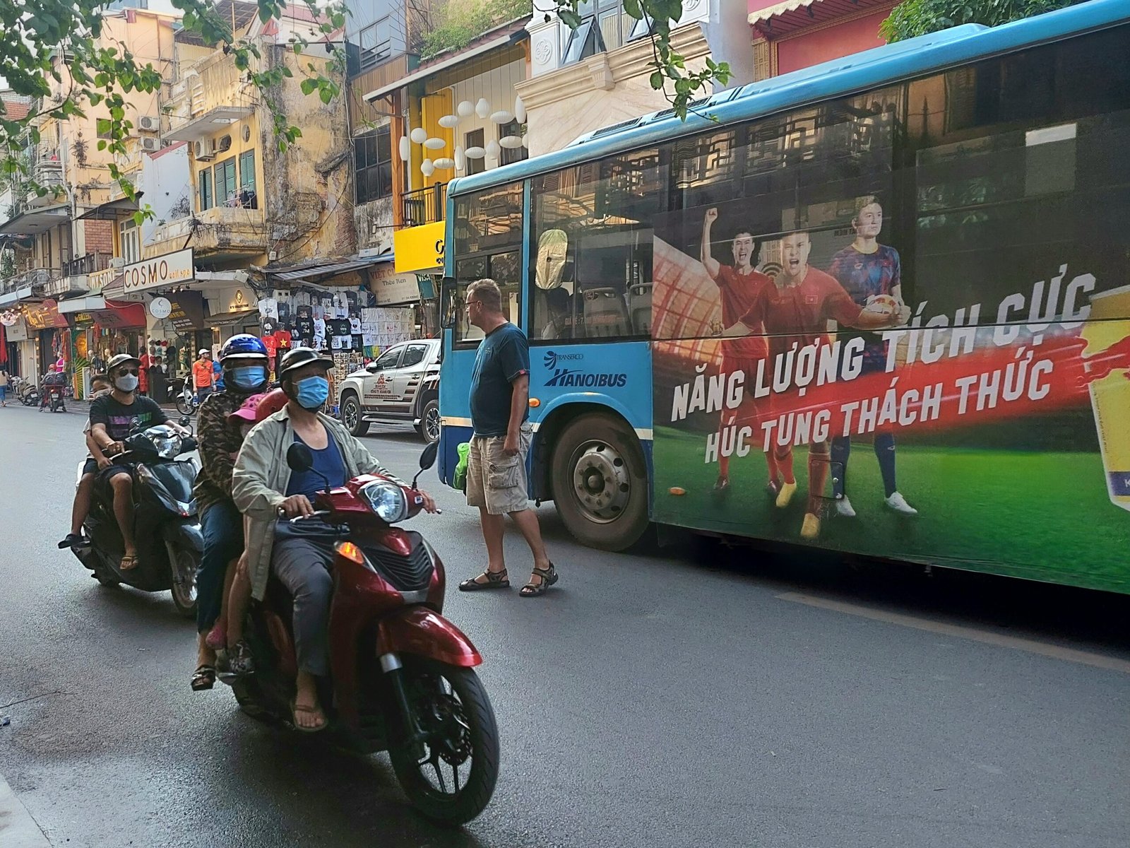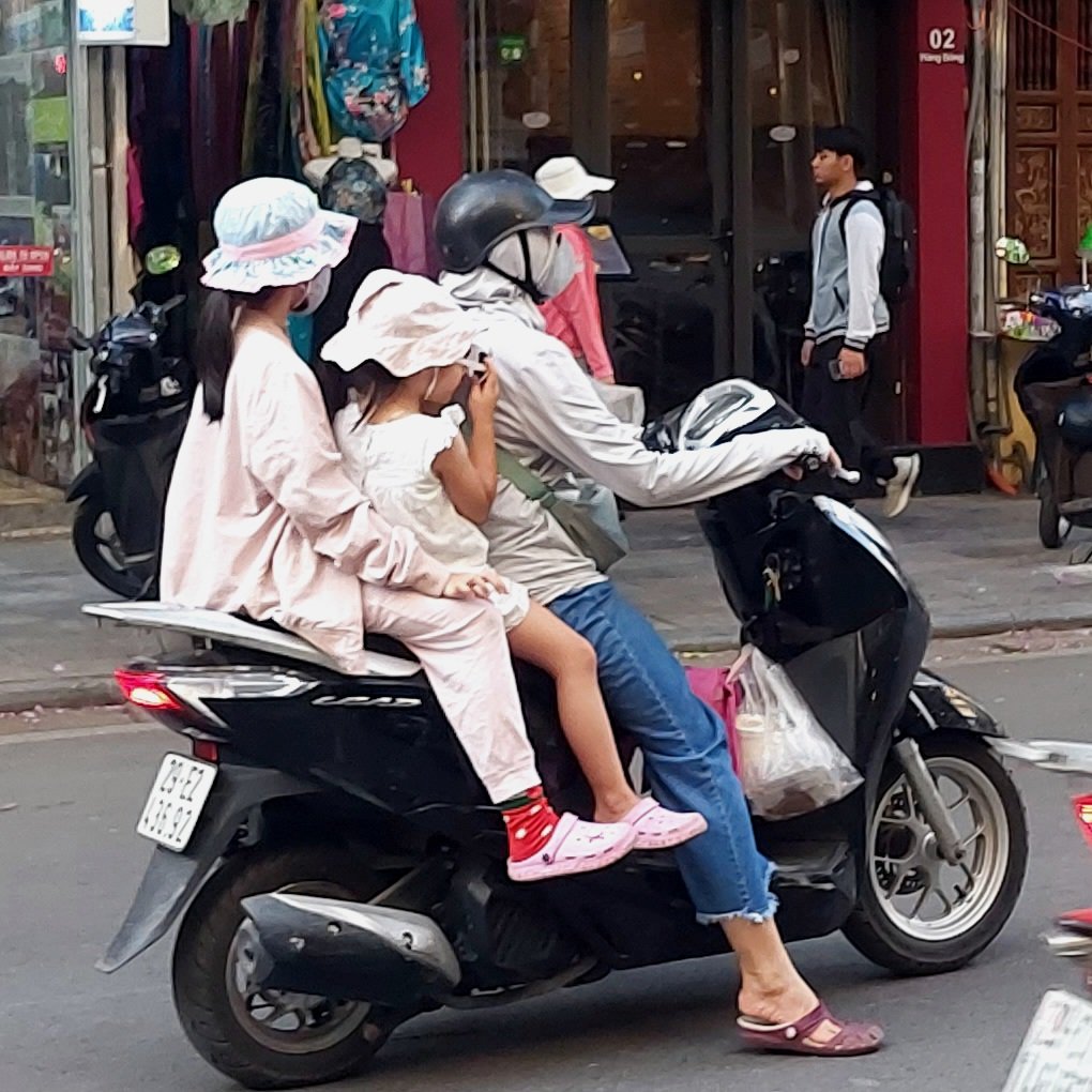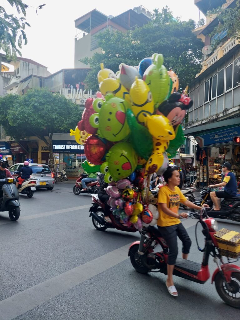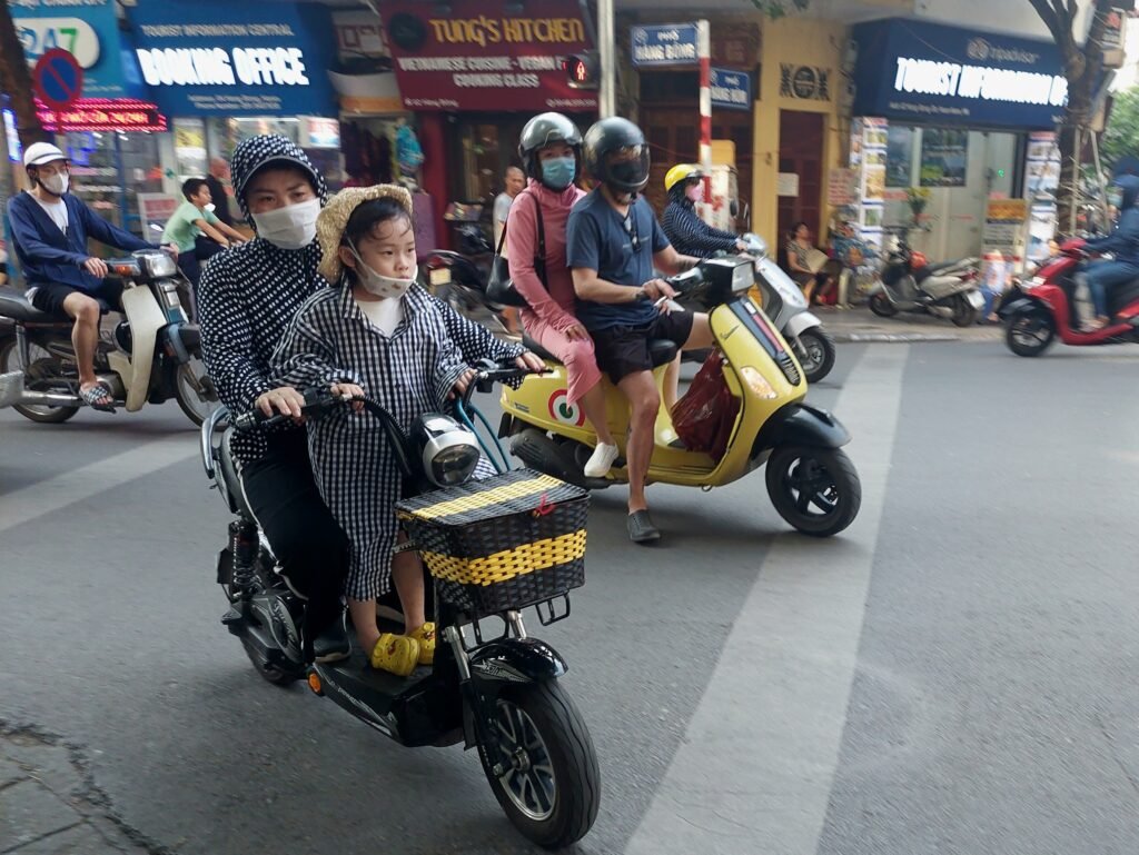Traffic in Hanoi is chaotic. We thought Malaysian traffic was bad, but the traffic here is insane. There are traffic lights at intersections, but nobody obeys them. Everyone drives ahead and honks the horn to signal that they are coming. Here, especially at crossings, you have to pay attention and move quite fast if you want to make it to the other side of the street alive. When crossing the road, it is not a good idea to stop, but to keep moving forward, counting on scooters and cars to give way on either side. The scooter is by far the most popular mode of transport here. Naturally, most people ride their scooters without helmets. You can load an incredible amount of stuff or people on a scooter. The record we saw was two adults, two children and a dog. Unfortunately, they went by so quickly that we didn’t get a picture of them.
