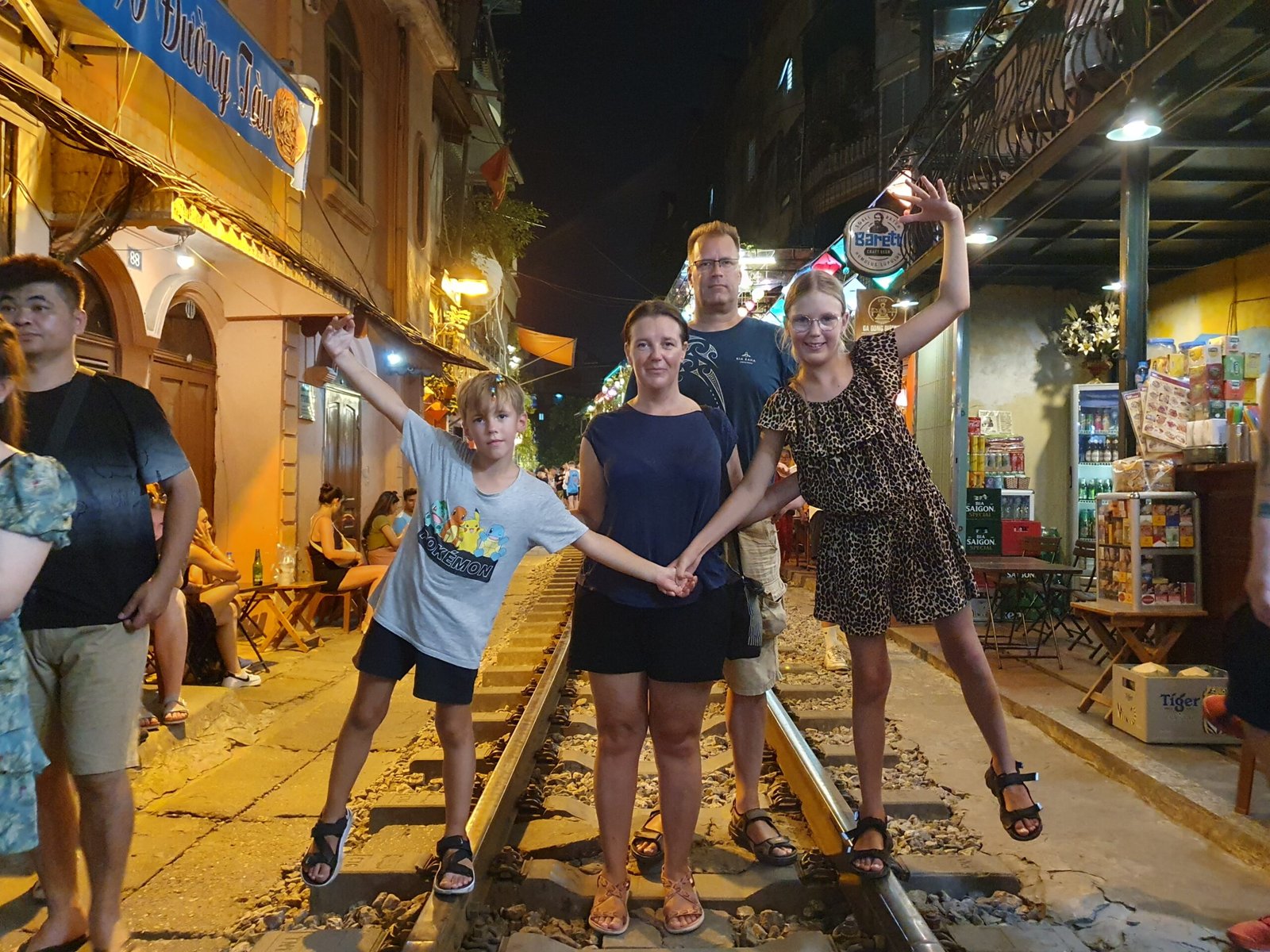 A restaurant is perhaps a little too fancy name for the small cafés that lined the roadside. Our stall looked rather ascetic, but the food we ordered was actually very good. We had deep-fried chicken, crab cakes, chips, spring rolls, cheese sticks, pho soup and fried rice. We also had a few juices and ciders to go with the food. The whole thing cost 790 000VND, about 30€. And when you get a nice train experience on top of the meal, I would call it a very successful evening. Sweaty and with our stomachs full, we started walking towards the hotel. On the way back, Risto wanted to try push ups on the rail tracks and was soon surrounded by a large crowd of supporters. Our little man was quite proud of himself, when at the end of the push-ups, some of the grown men wanted to shake Risto’s hand for a successful performance. Quite a powerhouse, this seven-year-old of ours!