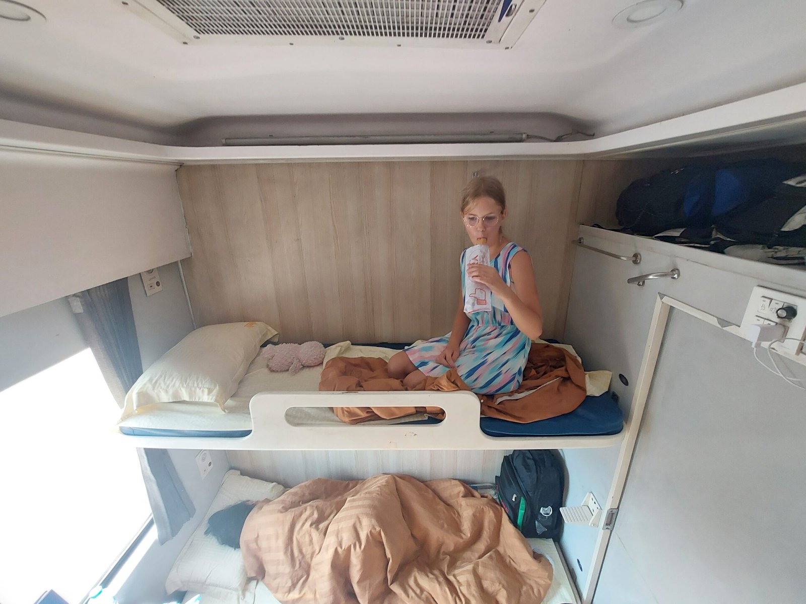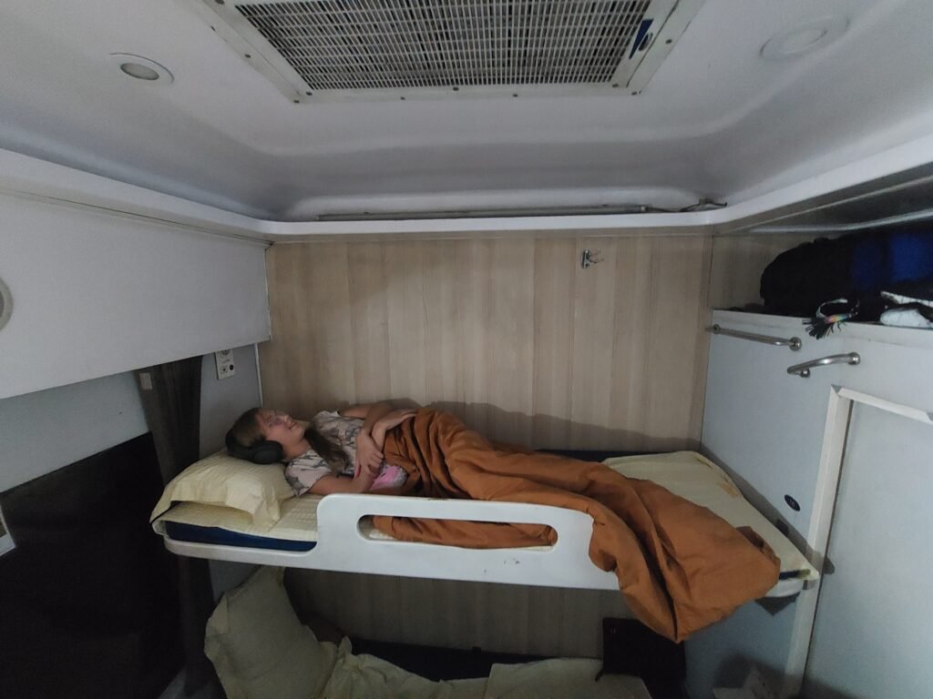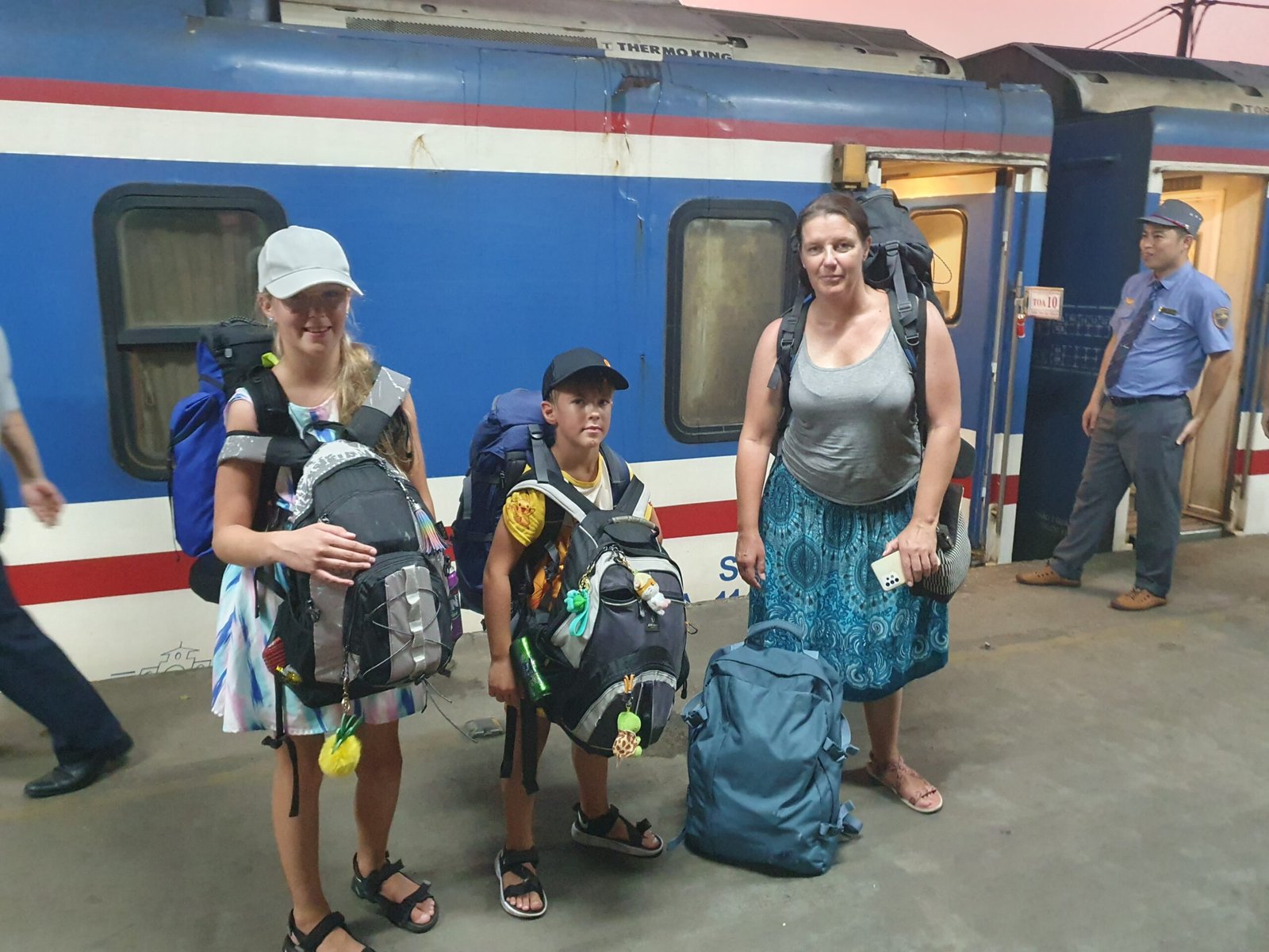 Juna oli onneksi ilmastoitu, joten sen puolesta matkustaminen oli oikein miellyttävää. Ilmeisesti olimme hankkineet lippumme niin myöhään, että emme saaneetkaan yhteistä makuuvaunuhyttiä perheellemme, vaan meidät oli majoitettu kahden eri makuuhytin yläpedeille. Yritimme kysyä junan henkilökunnalta, olisiko meidän mahdollista saada yhteistä hyttiä, mutta se ei kuulemma ollut mahdollista. Jaanan ja Ronjan seuraksi hyttiin tuli Hanoin asemalta vanhempi paikallinen mies, mutta Markon ja Riston hyttin ei siltä asemalta tullut vielä ketään. Paria pysäkkiä myöhemmin Jaana ja Ronja saivat seurakseen vielä toisenkin vietnamilaisen miehen. Samalta pysäkiltä Marko ja Risto saivat matkakumppanikseen kaksi länsimaalaista miestä.