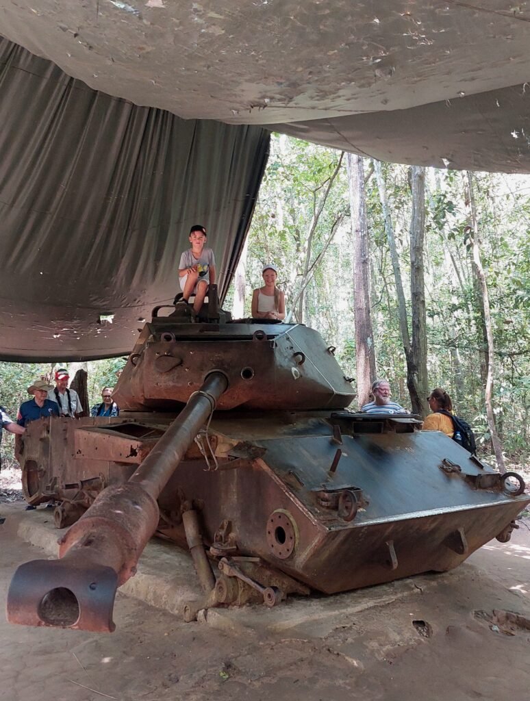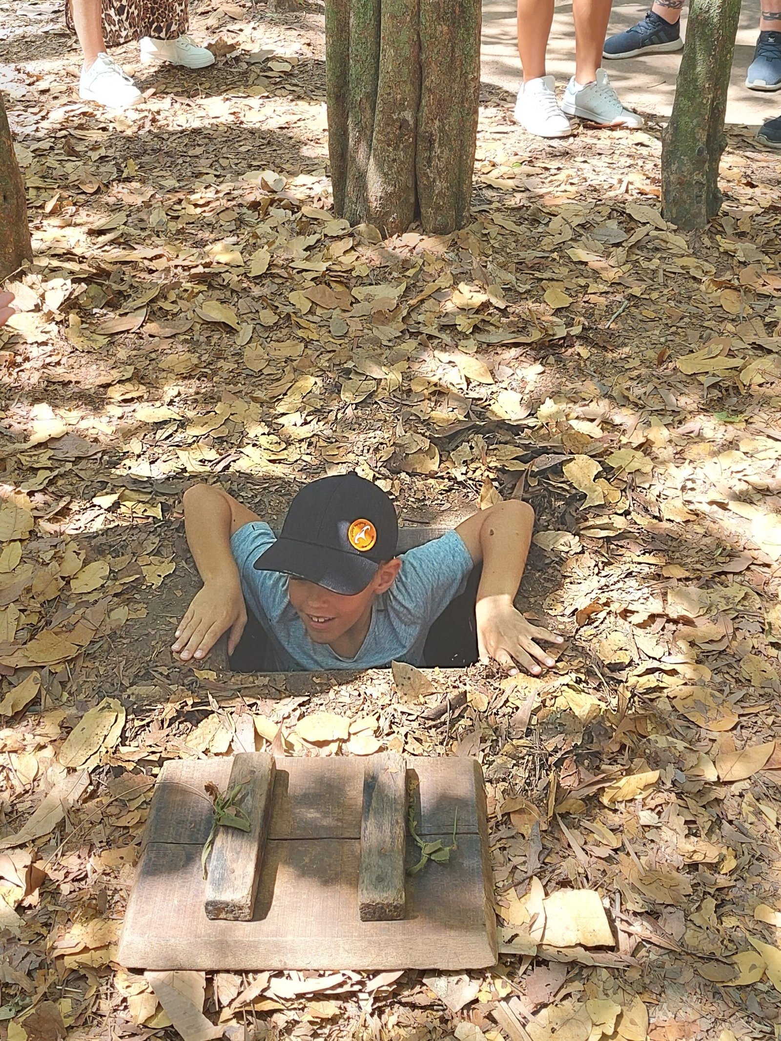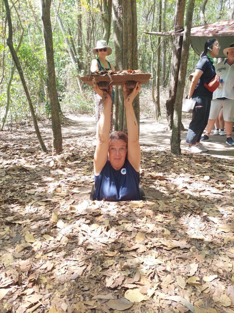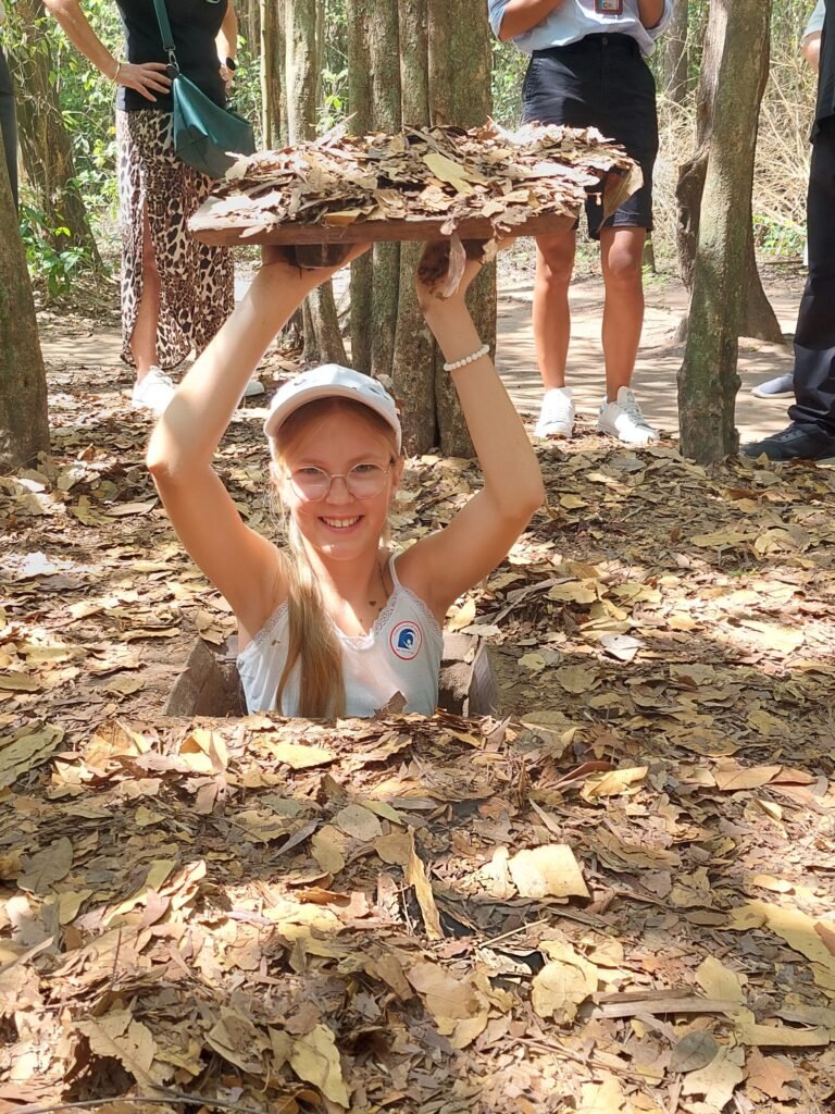 Keskiviikkona lähdimme lasten riemuksi taas aikaisin liikkeelle. Tällä kertaa kohteena oli Vietnamin sodan aikaiset Cu Chi -tunnelit sekä Mekong-joki. Ajomatka tunneleille kesti reilun tunnin verran, joten sen vuoksi jouduimme lähtemään liikkeelle jo kahdeksalta. Perille päästyämme oppaamme Ben kierrätti meitä alueella ja kertoi lyhyesti Vietnamin sodan historiasta ja sen kulusta. Pääsimme tutustumaan Pohjos-Vietnamin Viet Cong –joukkojen kaivamaan tunneliverkostoon. Verkostoa on maan alla n. 250km, mutta siitä on löydetty vain n. 150km. Enempää tunneleita ei yritetä enää etsiäkään, sillä ne, jotka tunneleiden tarkan sijainnin tietäisivät, ovat jo kuolleet. Tunnelit ovat täynnä erilaisia ansoja, joten siksi ei ole turvallista lähteä niitä enää sen enempää kartoittamaan.
