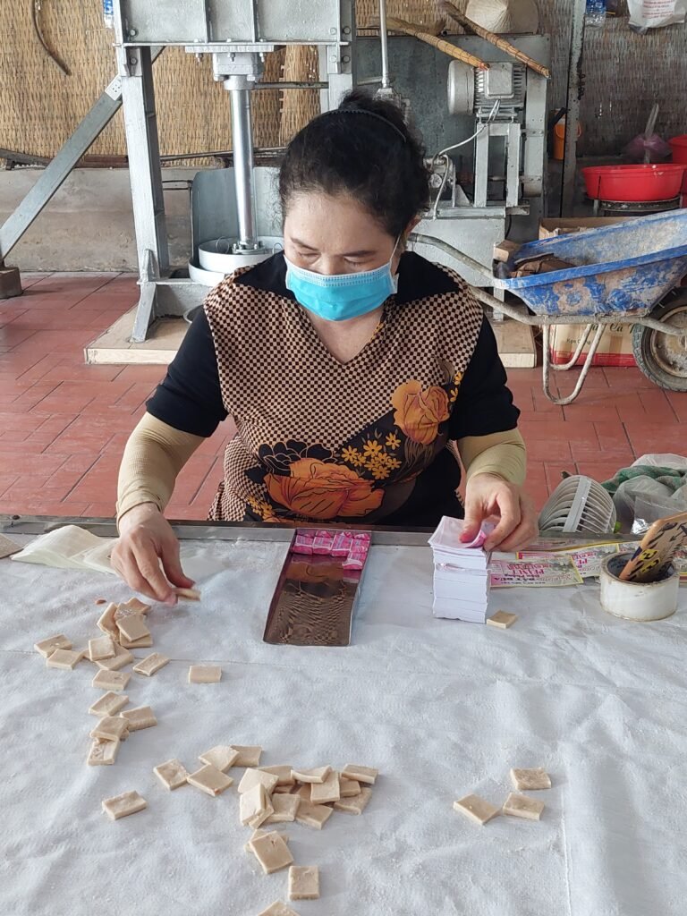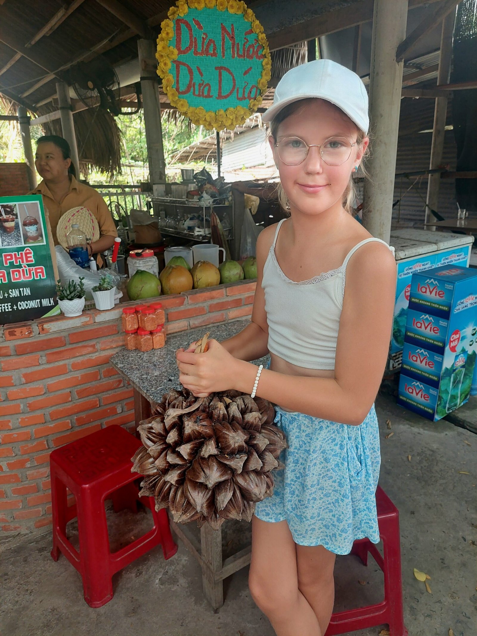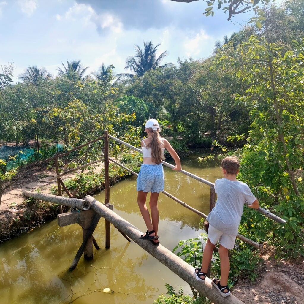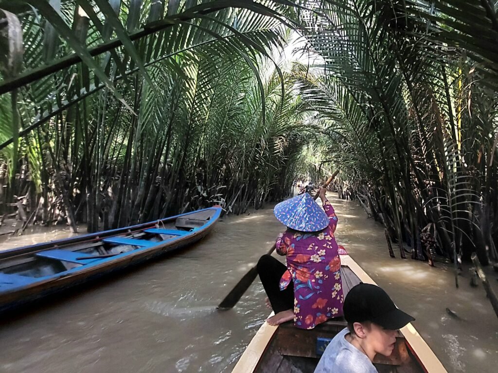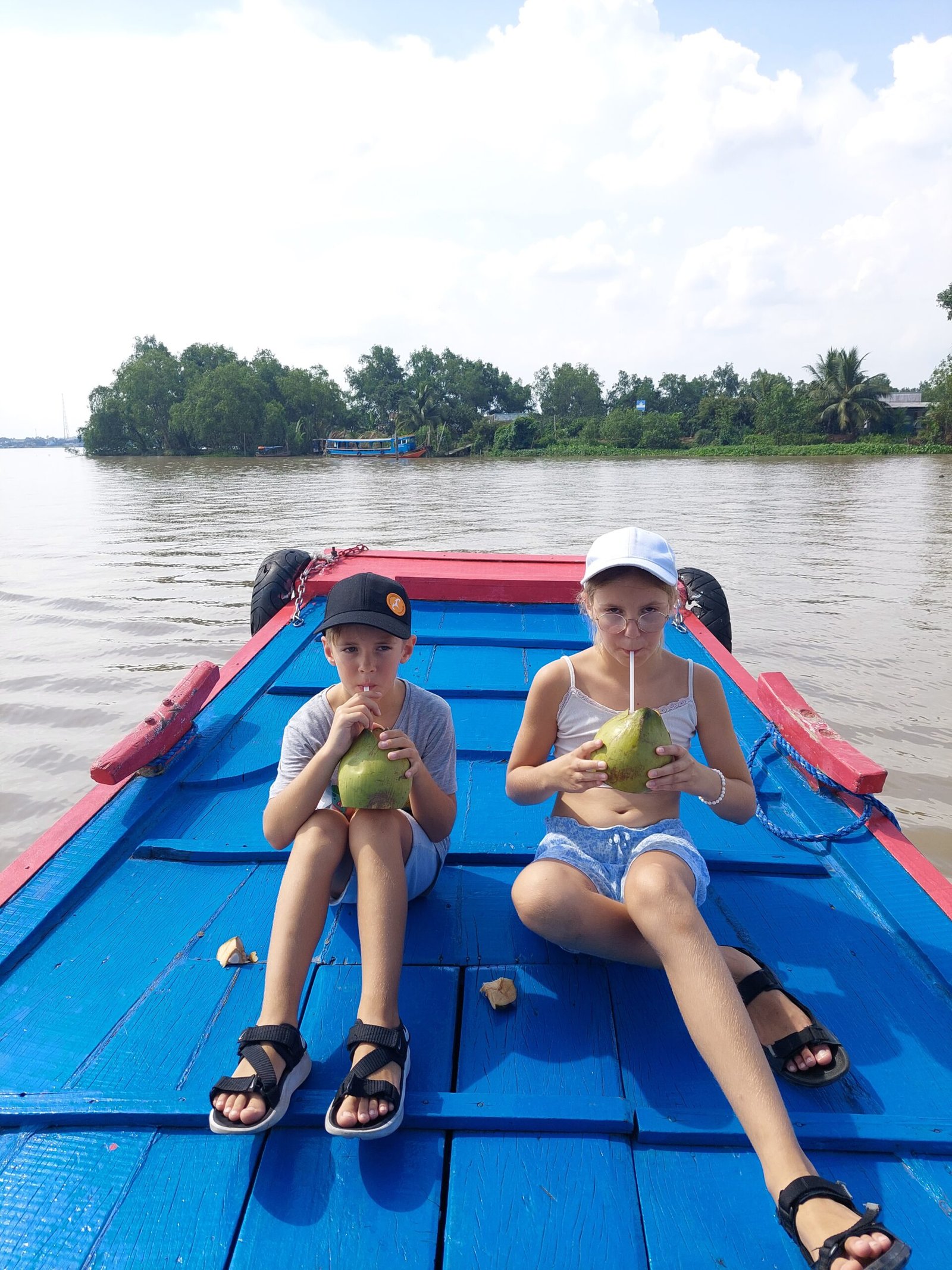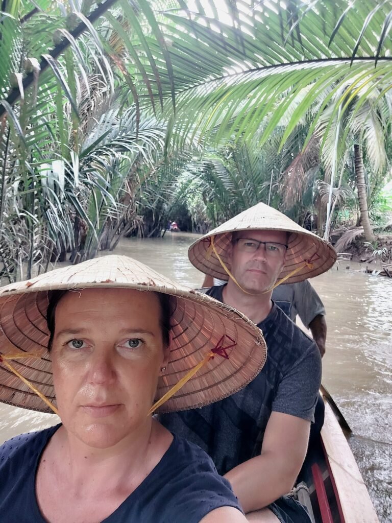Cu Chi –tunneleilta jatkoimme matkaa vähän leppoisampiin maisemiin Mekong-joelle. Siellä vierailimme pienellä saarella, jolla valmistettiin kookoksesta karkkeja. Saimme maistaakin niitä, mutta pettymykseksemme ne eivät olleen kovin kummoisen makuisia. Samassa paikassa meille tarjoiltiin jälleen käärmeviiniä, tällä kertaa ”Happy Wine” -nimellä. Jaanallekin lykättiin lasi kouraan, joten ei auttanut muu, kuin kulauttaa drinksu alas kurkusta. Tämäkään ei ollut Jaanan mielestä varsinainen testivoittaja.