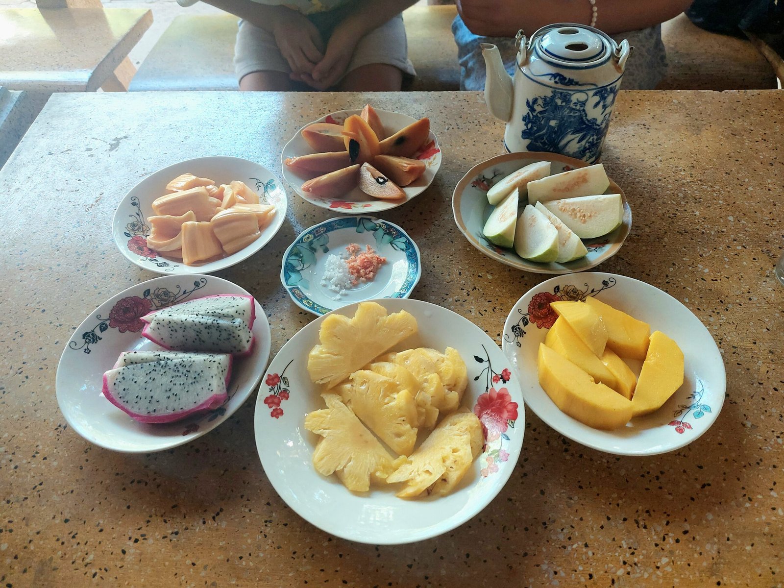 Seuraavaksi jatkoimme matkaa puutarhalle, jossa meille esiteltiin erilaisia paikallisia hedelmiä. Saimme myös maistaa niistä joitakin. Pöytään oli katettu tutun ananaksen ja mangon lisäksi myös sapotillaa, jakkipuun hedelmää, pitaijaa ja guavaa. Pitaijaa ja guavaa olimme muutamassa hotellissa jo maistaneetkin, mutta sapotilla ja jakkipuu olivat meille uusia tuttavuuksia.