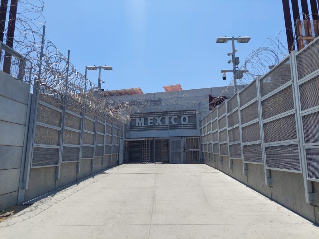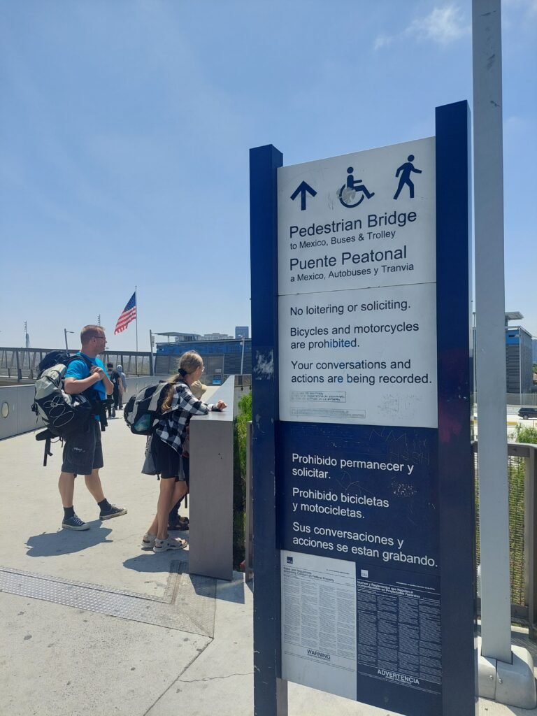 Rajanylitys kävellen oli todella helppoa. Ensin kuljimme kävelysiltaa pitkin portista sisään rakennukseen, jonka yläpuolella luki ”Mexico”. Tämän jälkeen tavaramme läpivalaistiin, ja jatkoimme matkaa kävellen eteenpäin. Koko ajan odottelimme, koska joutuisimme näyttämään passimme, mutta tuo läpivalaisu oli ainoa virallinen tarkistus Meksikoon päin mennessä. Passeja ei kyselty keneltäkään missään vaiheessa. Ilmeisesti meksikolaisia ei hirvittävästi kiinnosta, ketä sinne USA:n puolelta rajan yli tulee. USA:n rajalla takaisin päin mennessä on kuulemma hieman tiukempi meininki.