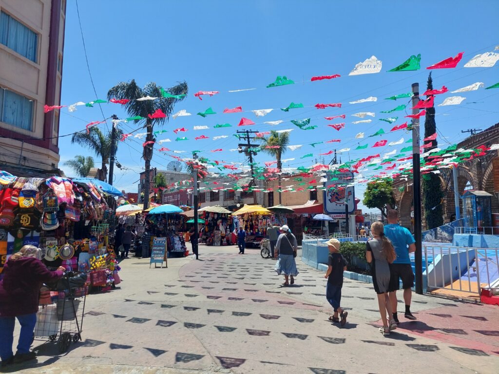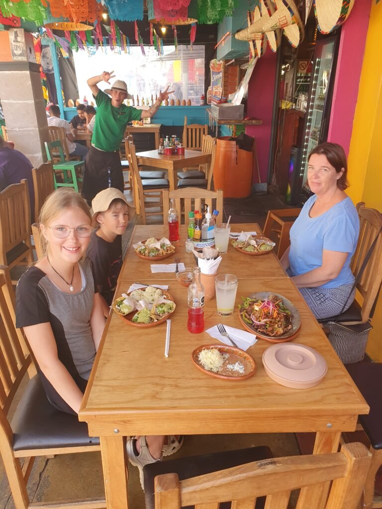 We walked for a while along the main street of the town, and at the door of every shop (even the pharmacy) we were invited in to see the selection of boutiques. We didn’t buy any tourist junk. Only Ronja bought herself a bracelet for three dollars. The local currency here is the Peso, but we don’t have any. Fortunately, at least here in Tijuana, the locals are happy to accept dollars. After our sightseeing walk, we went for Mexican food at a restaurant next to Plaza Santa Cecilia. The food was excellent. The tacos and tortilla sheets are made in the restaurant every day. The only downside was the mariachis who kept trying to perform to us, and we had to shoo them away from our table at regular intervals.