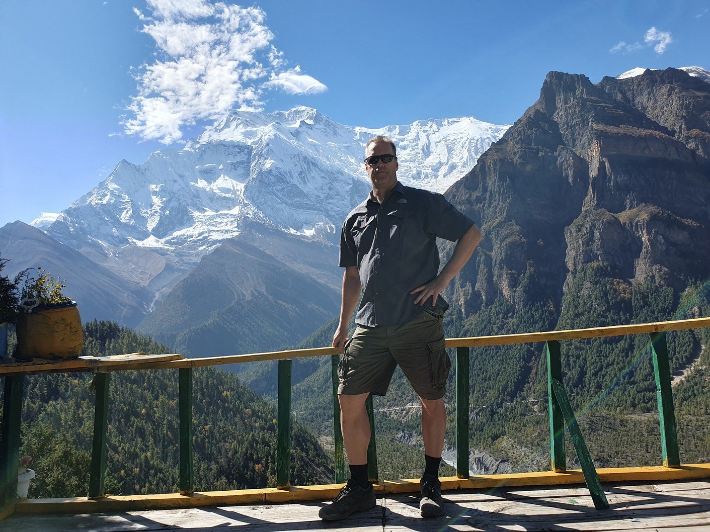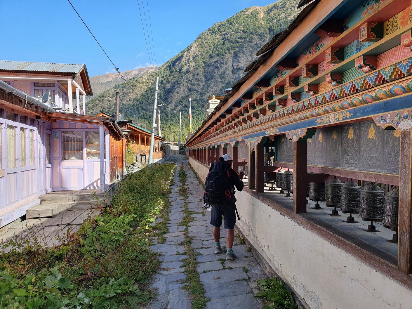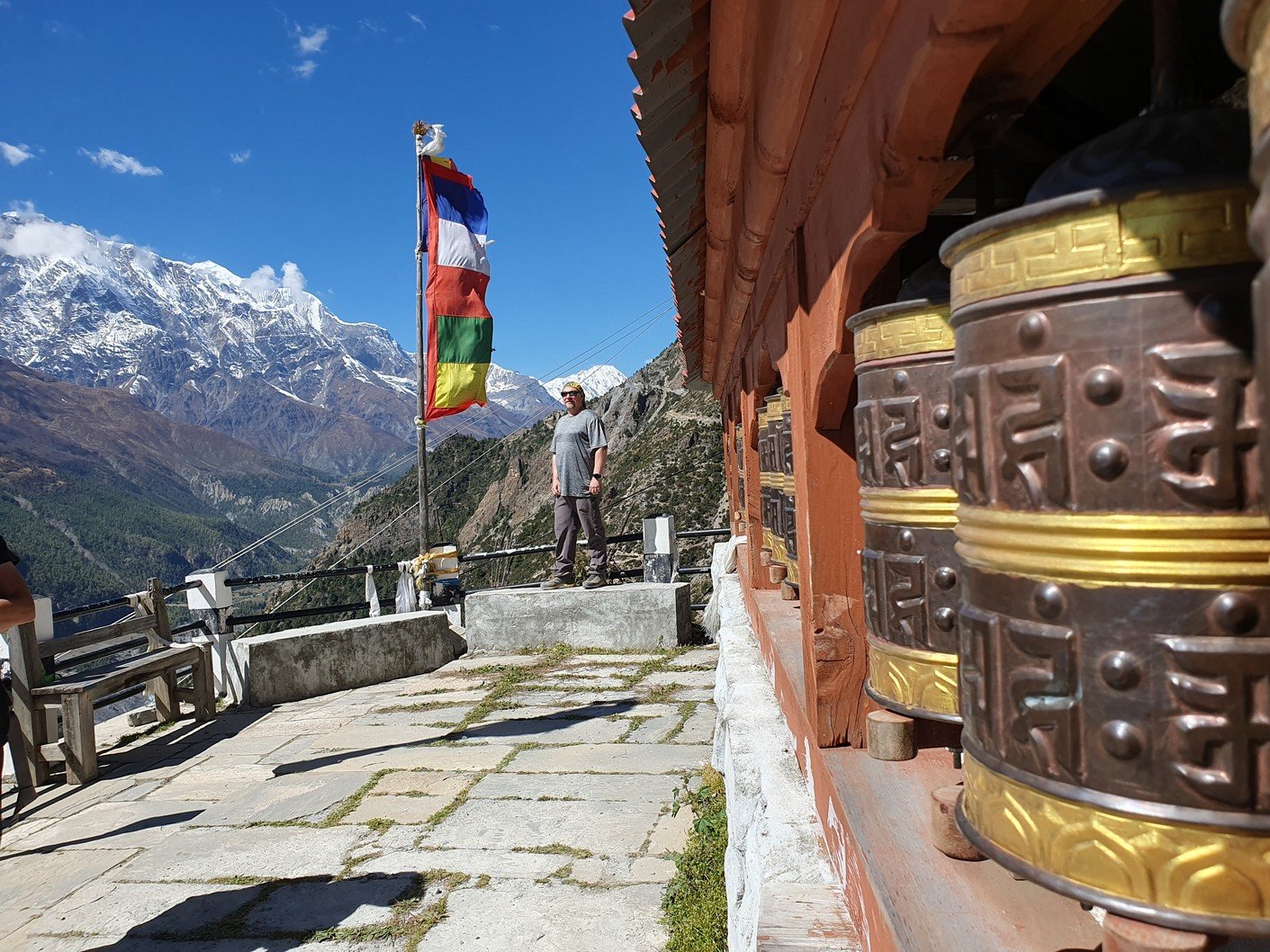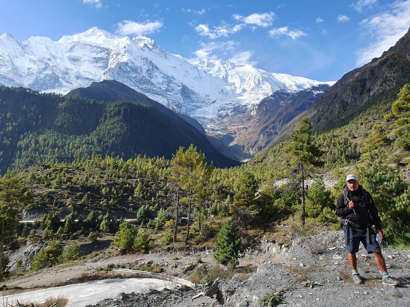 Alku- ja päätepisteiden korkeusero oli vajaa viisisataa metriä. Tämä ero kiivettiin heti aamulla, kun lähdimme nousemaan Pisangista serpentiinipolkua pitkin vuorenrinteeseen kaiverrettua tietä kohti. Kyseessä oli kuitenkin vanha kärrypolku, emmekä nähneet käytännössä koko päivänä yhtäkään autoa tai moottoripyörää. Uudempi tie kulki laakson pohjaa pitkin Humden kylän kautta ja kaikki motorisoitu liikenne kulki nykyään sitä pitkin. Pitkän ja hitaan ylämäen jälkeen saavuimme ensimmäiselle taukopaikalle, jossa nautimme lämpimät juomat ja otimme hienoja maisemakuvia. Jonkun ajan päästä saavuimme 3670 metrin korkeudessa sijaitsevaan Ghyaruun, jossa pidimme toisen tauon. Ghyaru oli jo samalla korkeudella kuin päätepisteemme, mutta tie nousi hitaakseltaan vielä jonkun verran ennen vastaavaa verkkaista alamäkeä kohti Ngawalia. Perillä olimme jo ennen yhtä, joten söimme sekä lounaan että päivällisen majapaikassamme. Vaatteiden pesun ja pienen ruokalevon jälkeen lähdin vielä valokuvausreissulle Ngawaliin. Kylästä lähti pitkät rappuset kohti jotain pyhää luolaa, joka sijaitsi yli 4000 metrin korkeudessa. Kiipesin portaista ehkä puolet eli ehkä vähän toistasataa metriä kylän yläpuolelle. Sieltä sai mahtavia kuvia sekä kylästä että taustalla olevasta Annapurnan vuorijonosta.