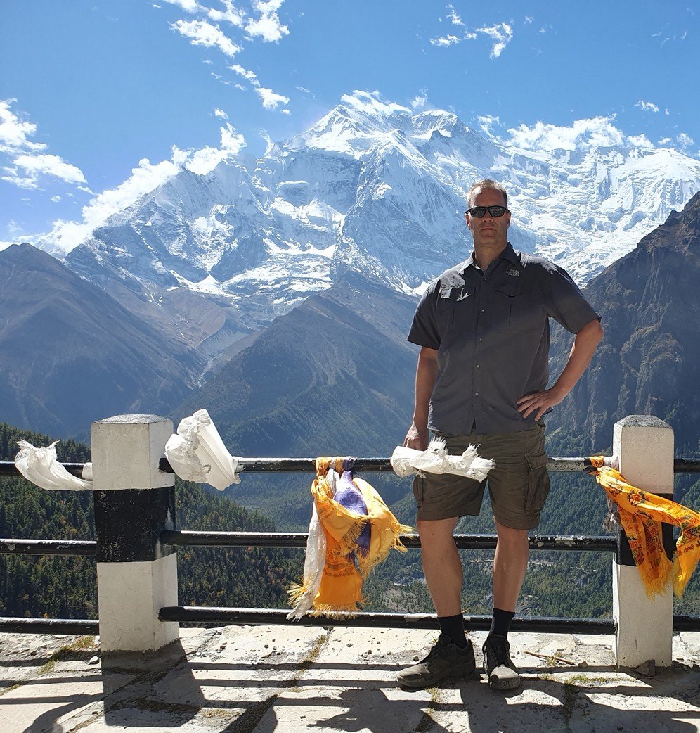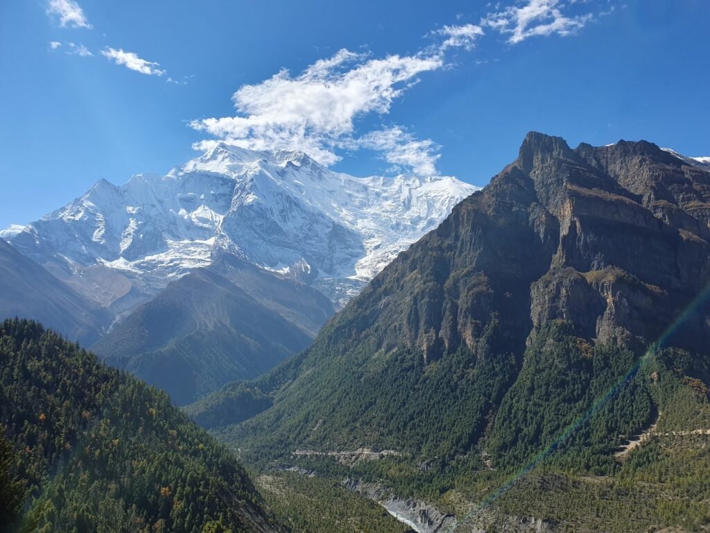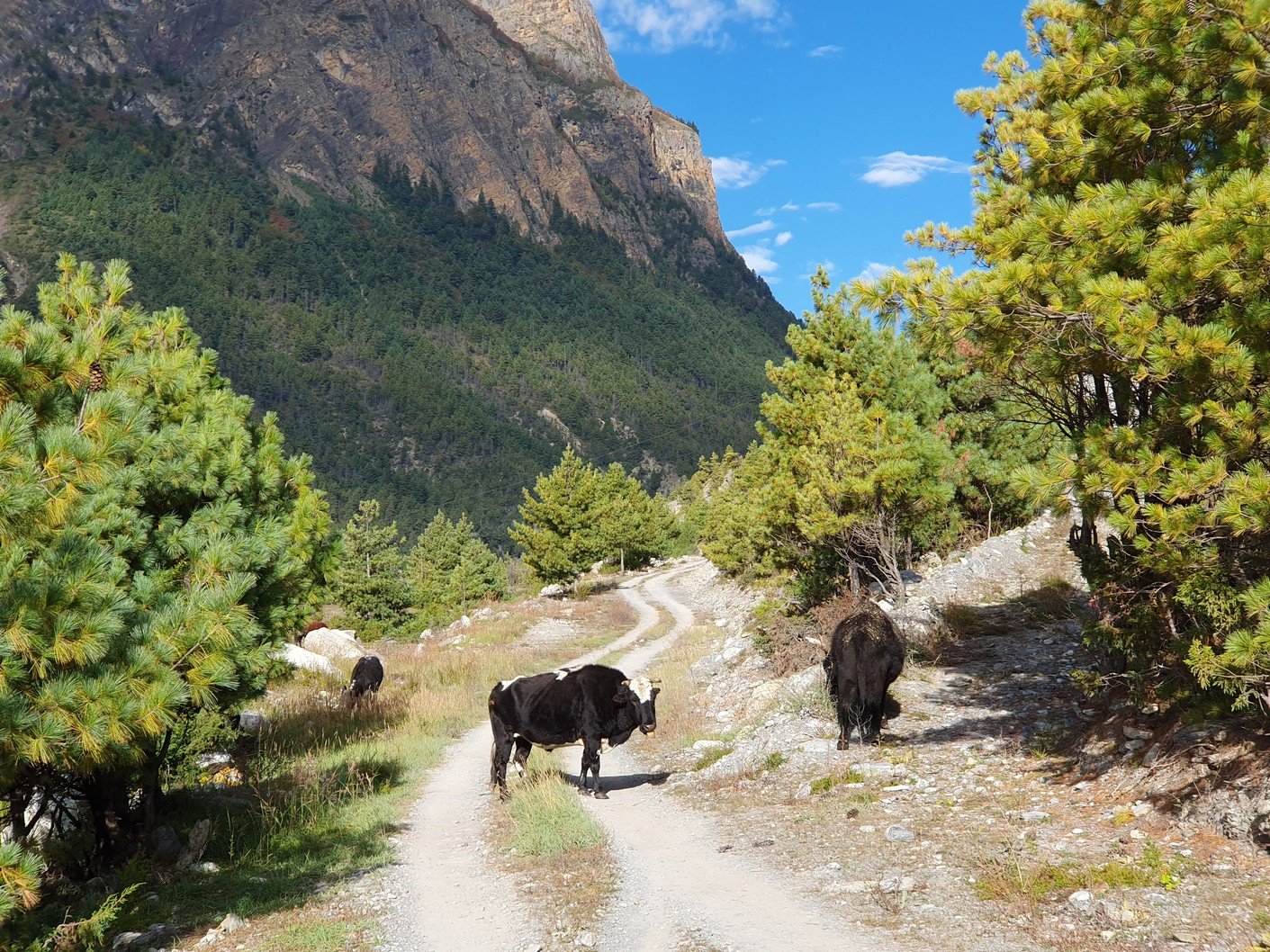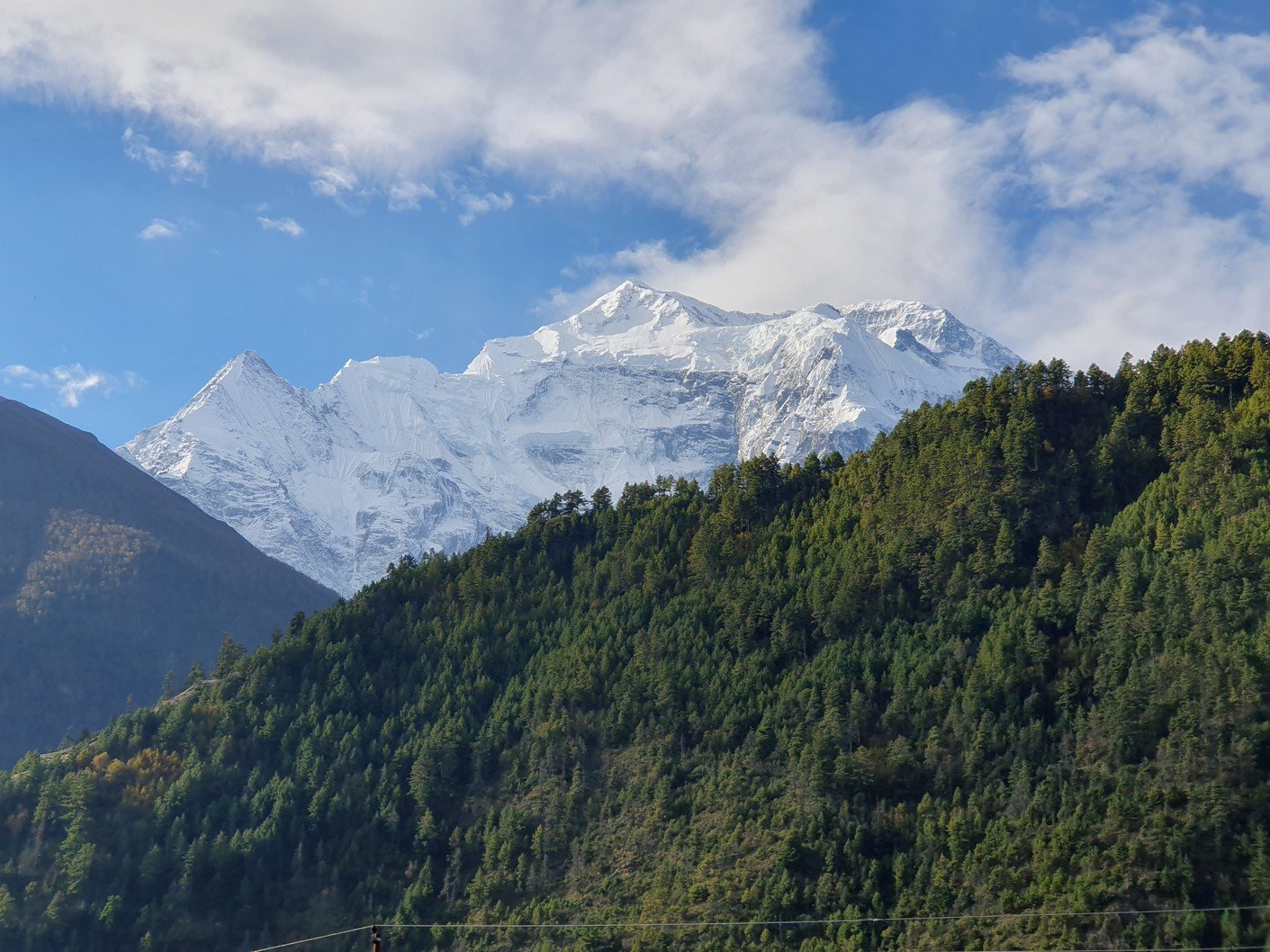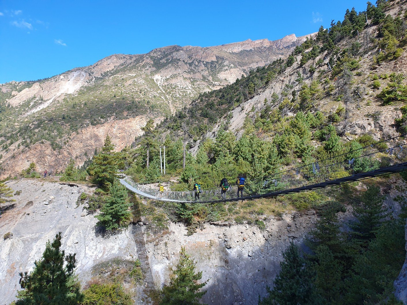 Alku- ja päätepisteiden korkeusero oli vajaa viisisataa metriä. Tämä ero kiivettiin heti aamulla, kun lähdimme nousemaan Pisangista serpentiinipolkua pitkin vuorenrinteeseen kaiverrettua tietä kohti. Kyseessä oli kuitenkin vanha kärrypolku, emmekä nähneet käytännössä koko päivänä yhtäkään autoa tai moottoripyörää. Uudempi tie kulki laakson pohjaa pitkin Humden kylän kautta ja kaikki motorisoitu liikenne kulki nykyään sitä pitkin. Pitkän ja hitaan ylämäen jälkeen saavuimme ensimmäiselle taukopaikalle, jossa nautimme lämpimät juomat ja otimme hienoja maisemakuvia. Jonkun ajan päästä saavuimme 3670 metrin korkeudessa sijaitsevaan Ghyaruun, jossa pidimme toisen tauon. Ghyaru oli jo samalla korkeudella kuin päätepisteemme, mutta tie nousi hitaakseltaan vielä jonkun verran ennen vastaavaa verkkaista alamäkeä kohti Ngawalia. Perillä olimme jo ennen yhtä, joten söimme sekä lounaan että päivällisen majapaikassamme. Vaatteiden pesun ja pienen ruokalevon jälkeen lähdin vielä valokuvausreissulle Ngawaliin. Kylästä lähti pitkät rappuset kohti jotain pyhää luolaa, joka sijaitsi yli 4000 metrin korkeudessa. Kiipesin portaista ehkä puolet eli ehkä vähän toistasataa metriä kylän yläpuolelle. Sieltä sai mahtavia kuvia sekä kylästä että taustalla olevasta Annapurnan vuorijonosta.