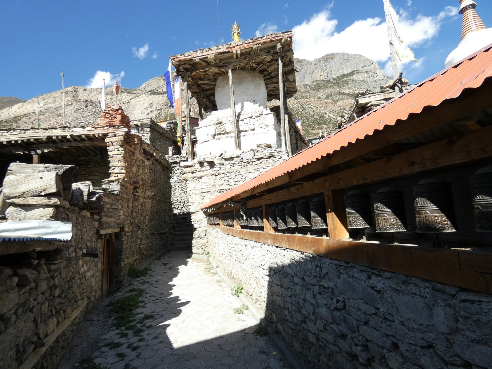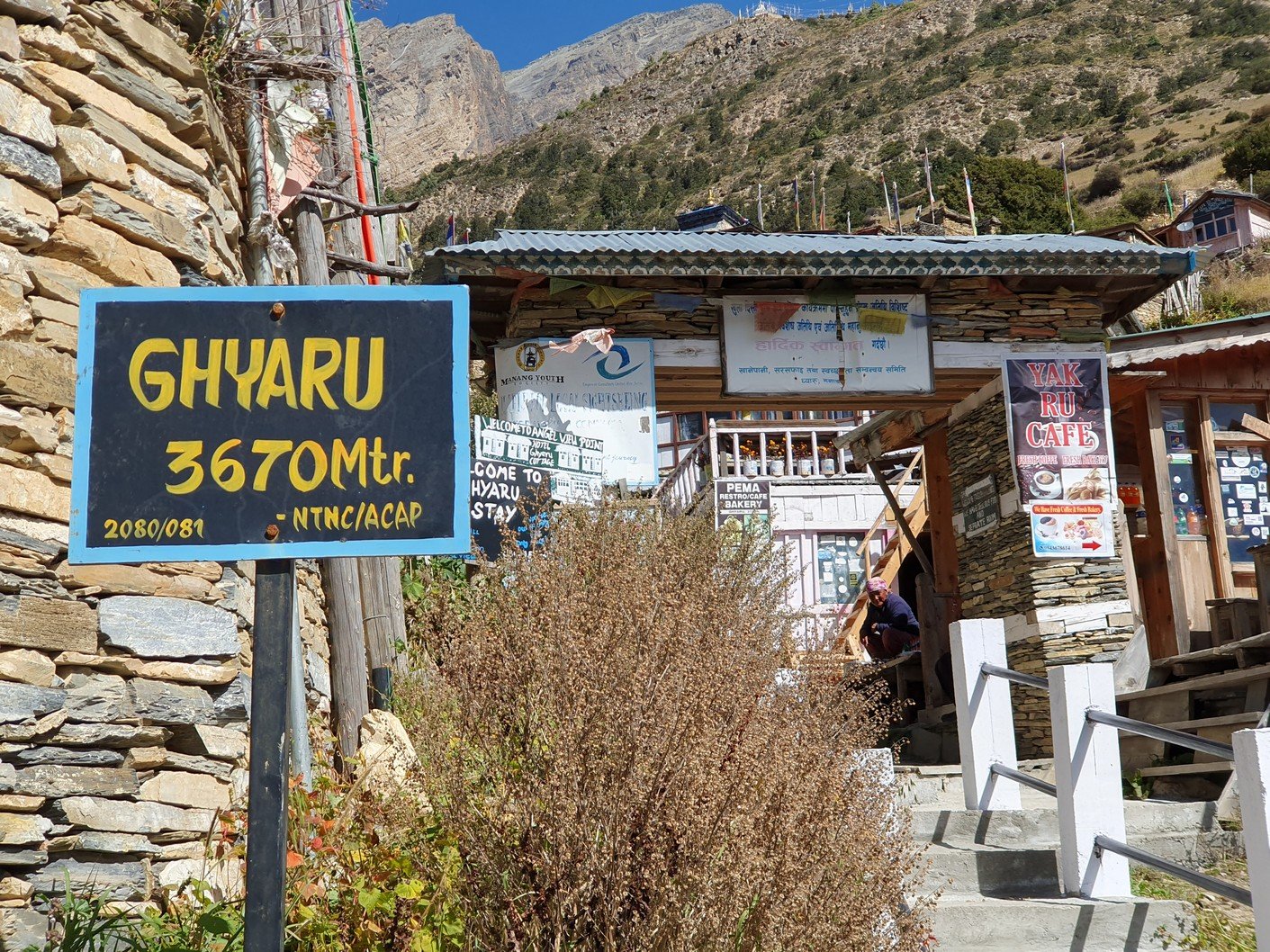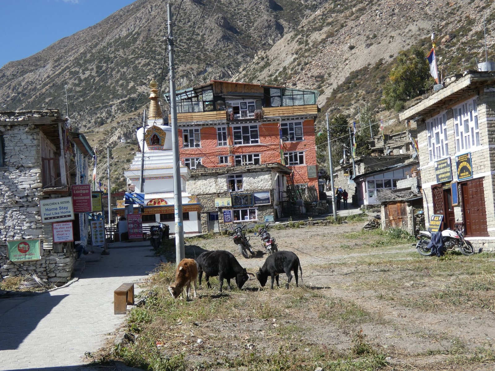 Kävin iltapäivällä kameran kanssa kiertelemässä Manangissa. Kylässä on useita suhteellisesti katsottuna paremmin varustettuja kauppoja sekä muutama leipomokin. Ostin purkin Pringlesejä, pari paikallista energiajuomaa sekä suklaamuffinin illaksi. Pude yritti ostaa vaellukseen sopivia shortseja, mutta sellaisia ei löytynyt. Syy lienee se, ettei Manangissa ole koskaan shortsisesonki.