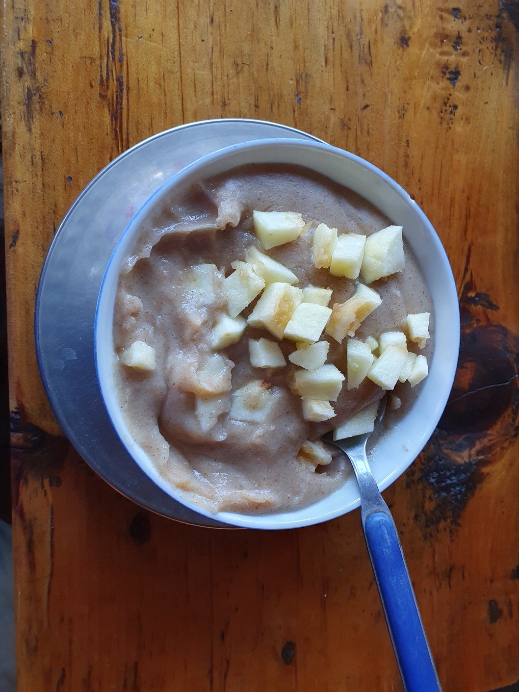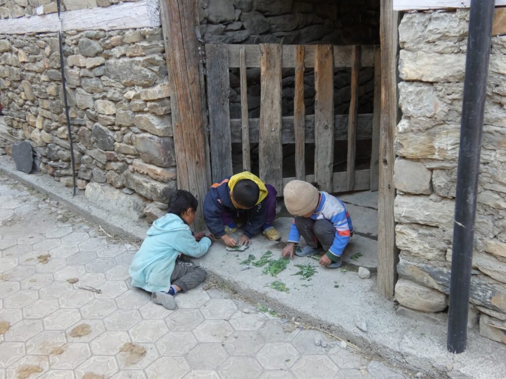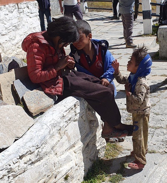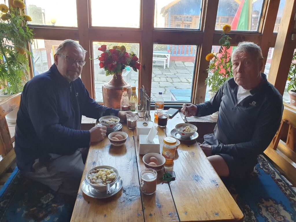 Aamulla oli kylmä, ja Amrit väitti että aamuyöstä olisi ollut -3, koska ulkona olevan pesupaikan hana oli jäätynyt. Itse emme kyllä huomanneet missään jäätä tai huurtumista, joten pakkaslukemat kuulostivat hieman yllättäviltä, mutta montaa astetta ei oltu plussankaan puolella. Onneksi ruokasali oli suhteellisen lämmin. Kokeilimme tänään kaikki paikallista Tsampa-puuroa omenanpalojen kanssa. Meille jäi epäselväksi, mistä paikallisesta viljasta puuro oli tehty mutta ilmeisesti kyse oli jostain sahajauhon lähisukulaisesta. Omenanpalojen ja sokerin kanssa kaikki taistelivat pohjimmiltaan melko mauttoman puuron suihinsa, mutta tästä lähtien pitäydymme kyllä kaurapuurossa.