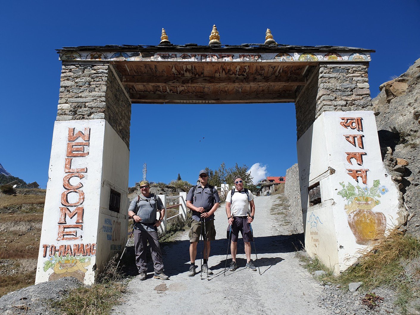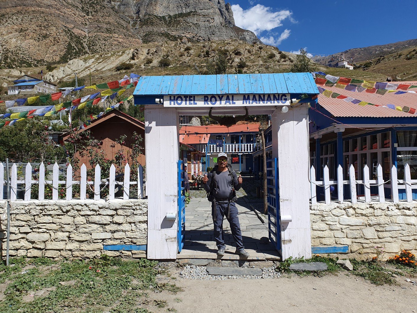 Kävelyn suhteen päivä oli jälleen lyhyt, koska Chamen ja Manangin välinen etäisyys oli jaettu kahteen erilliseen etappiin. Manang on itse asiassa alempana kuin Ngawal, ja etappi alkoikin huomattavan pitkällä alamäellä. Itse asiassa alamäen jälkeinen kylä, Bhraka, oli vain 3360 metrin korkeudessa eli olimme menettäneet kolmisensataa metria korkeutta, eikä Manang ollutkaan enää alempana vaan parisataa metriä korkeammalla. Koska lähdöstä ei ollut kovinkaan kauaa aikaa, emme pysähtyneet Bhrakassa vaan jatkoimme matkaa. Matka jatkui verkkaisesti nousten, ja pääsimme perille jo reilusti ennen puoltapäivää. Koska sää oli lämmin ja aurinkoinen ja Manang on hieman isompi kylä, kaikki olivat erittäin tyytyväisiä melkein kokonaiseen vapaapäivään.
